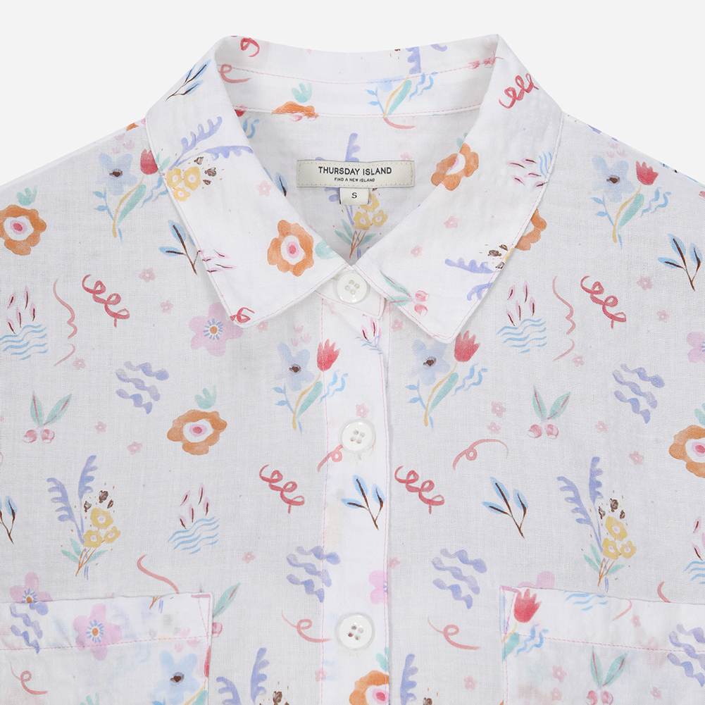 키치하게 변형된 플라워 패턴의 셔츠형 블라우스.