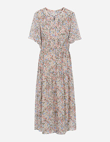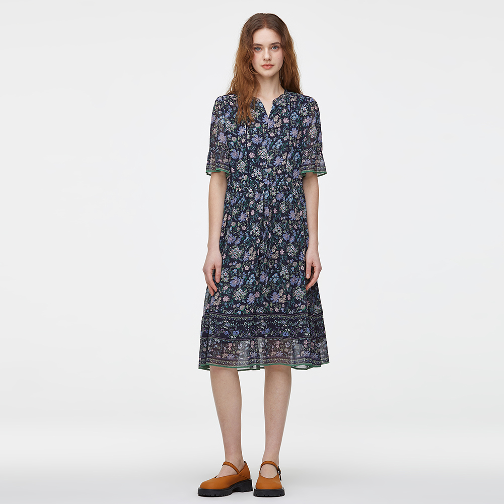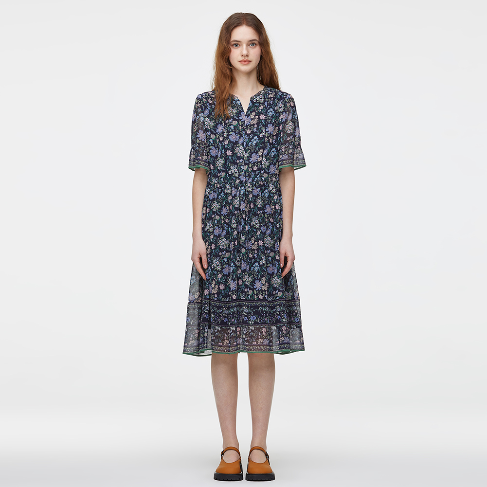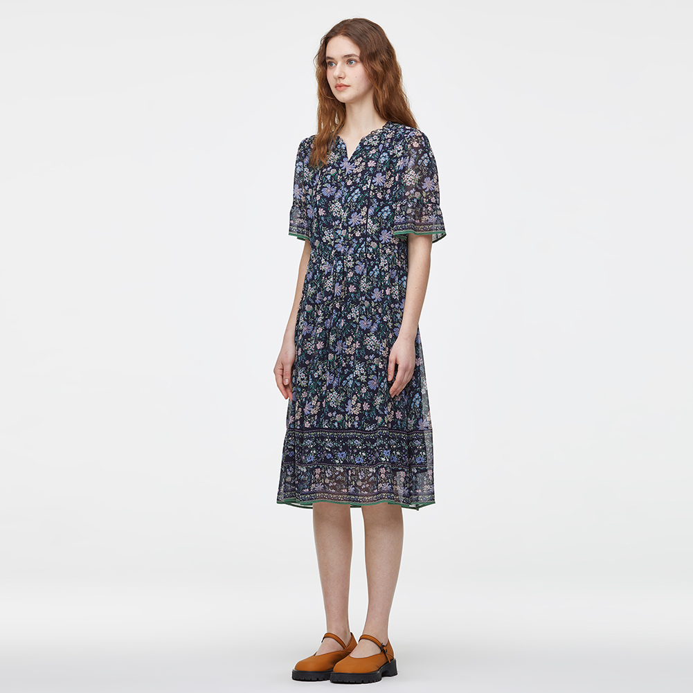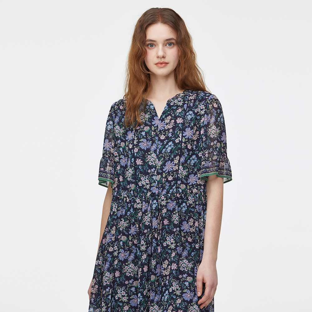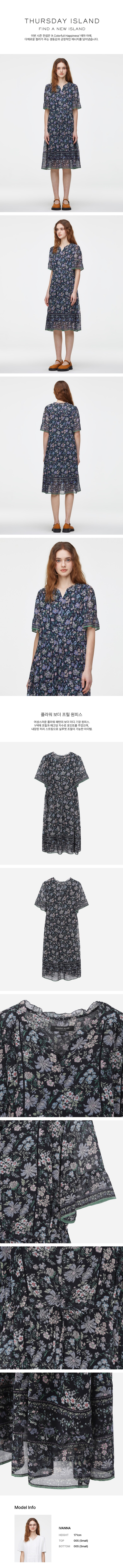V넥에 프릴과 패고딩자수로 포인트를 주었으며,내장된 허리 스트링으로 실루엣 조절이 가능한 아이템.