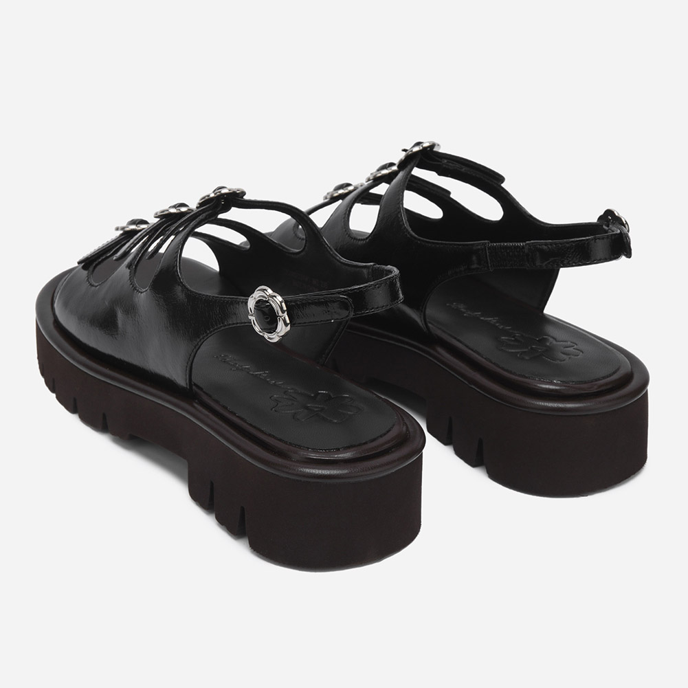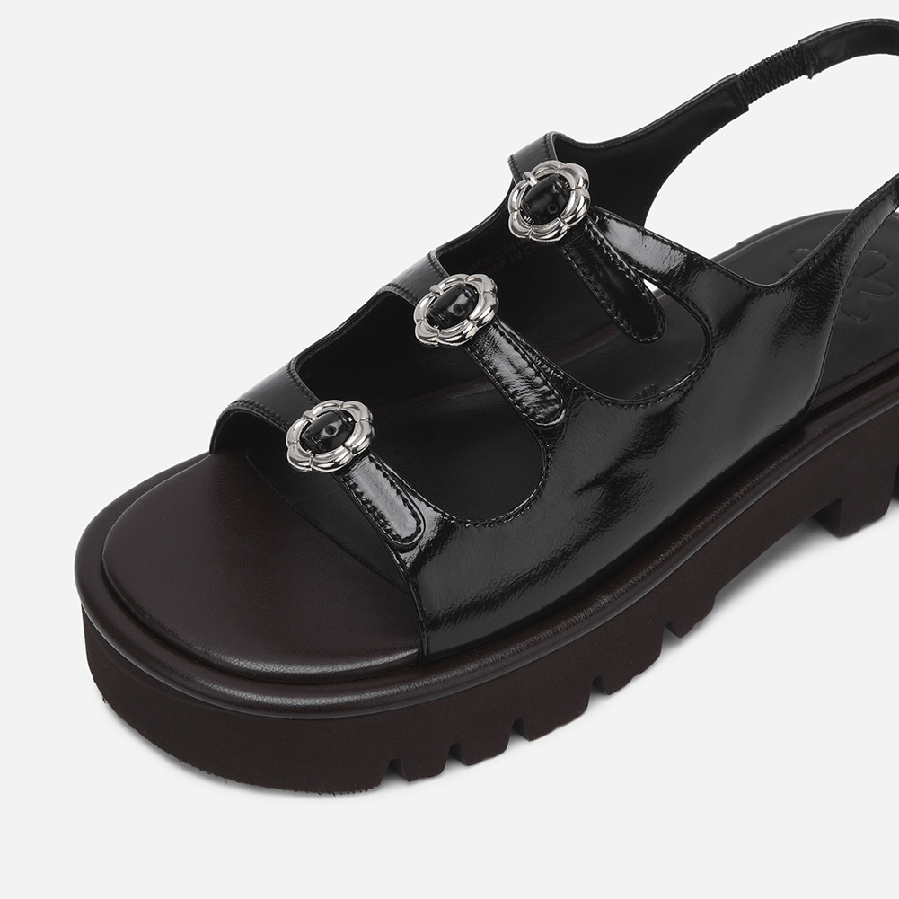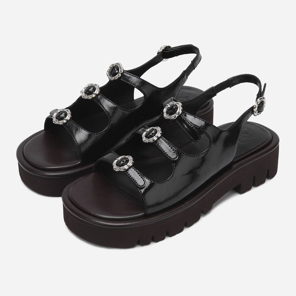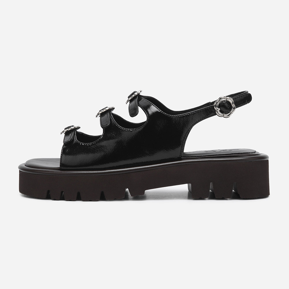내추럴한 링클 유광 소가죽으로 세련된 무드를 자아내는 샌들.발등 플라워 버클로 포인트를 주었으며 가벼운 플랫폼 굽으로 스타일링에 포인트를 줄 수 있는 디자인.