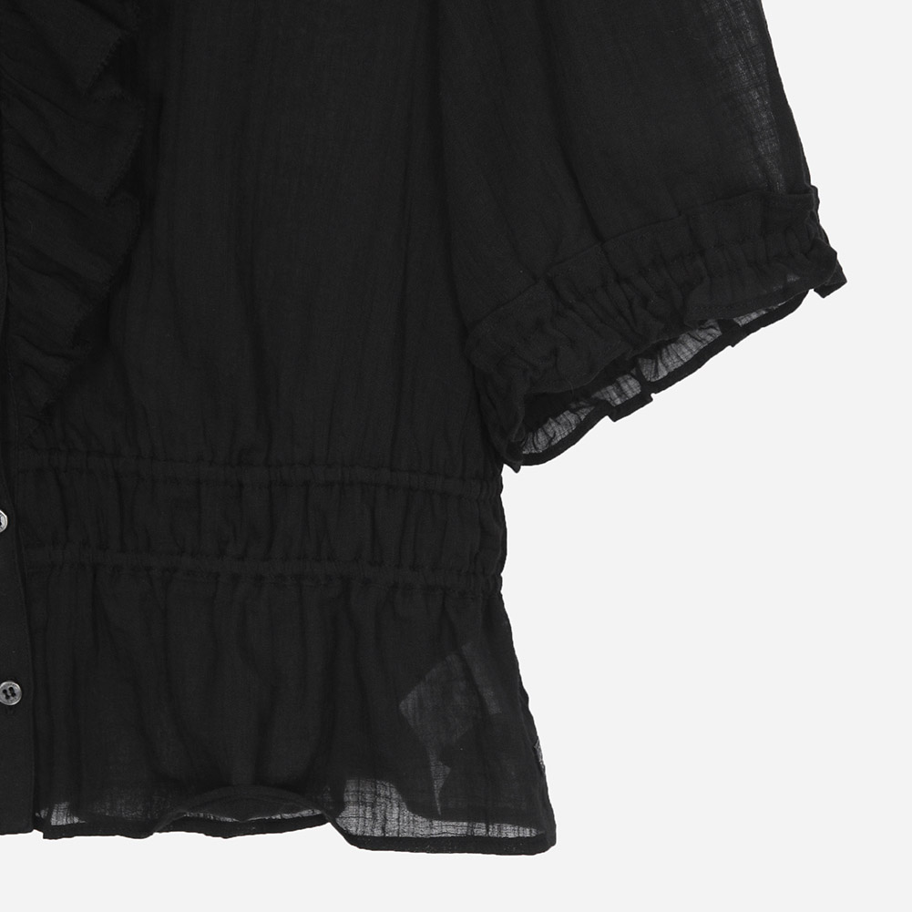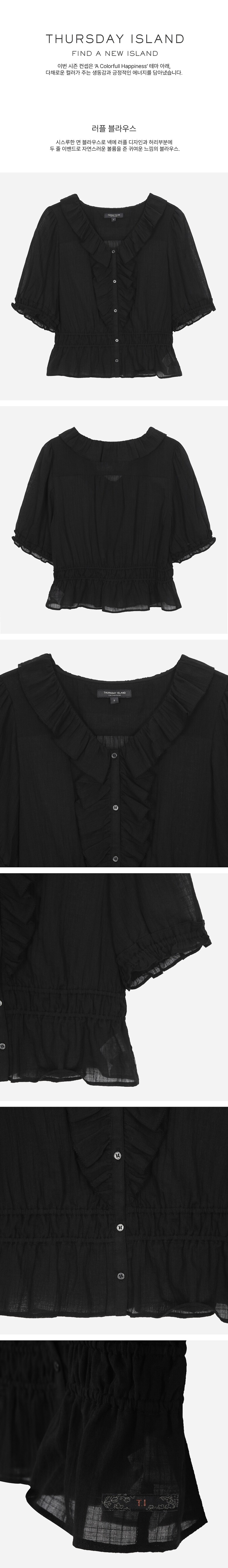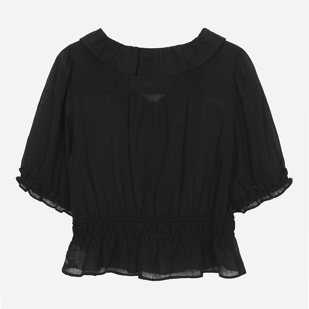 시스루한 면 블라우스로 넥에 러플 디자인과 허리부분에 두줄 이밴드로 자연스러운 볼륨을 준 귀여운 느낌의 블라우스.