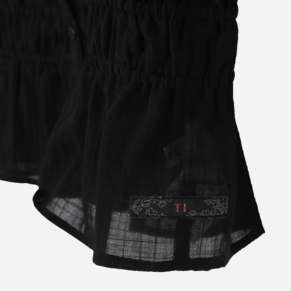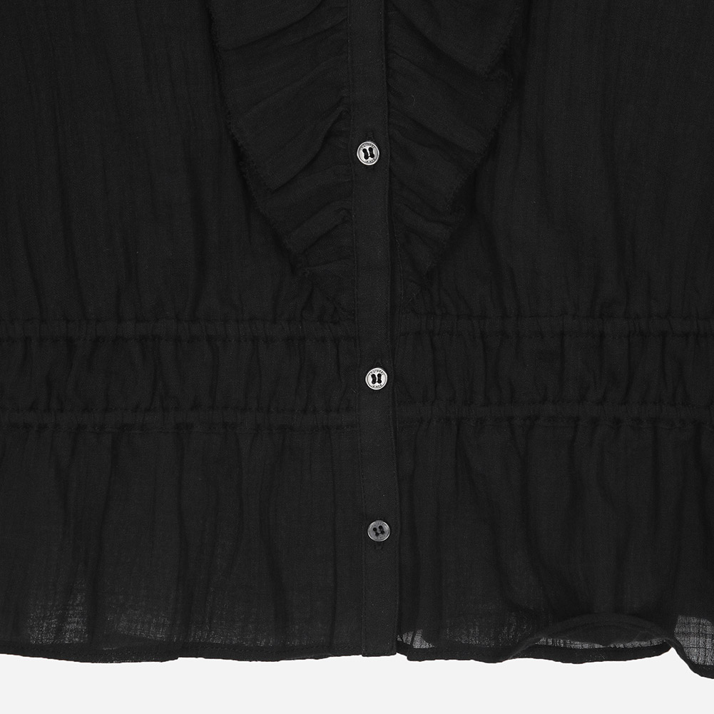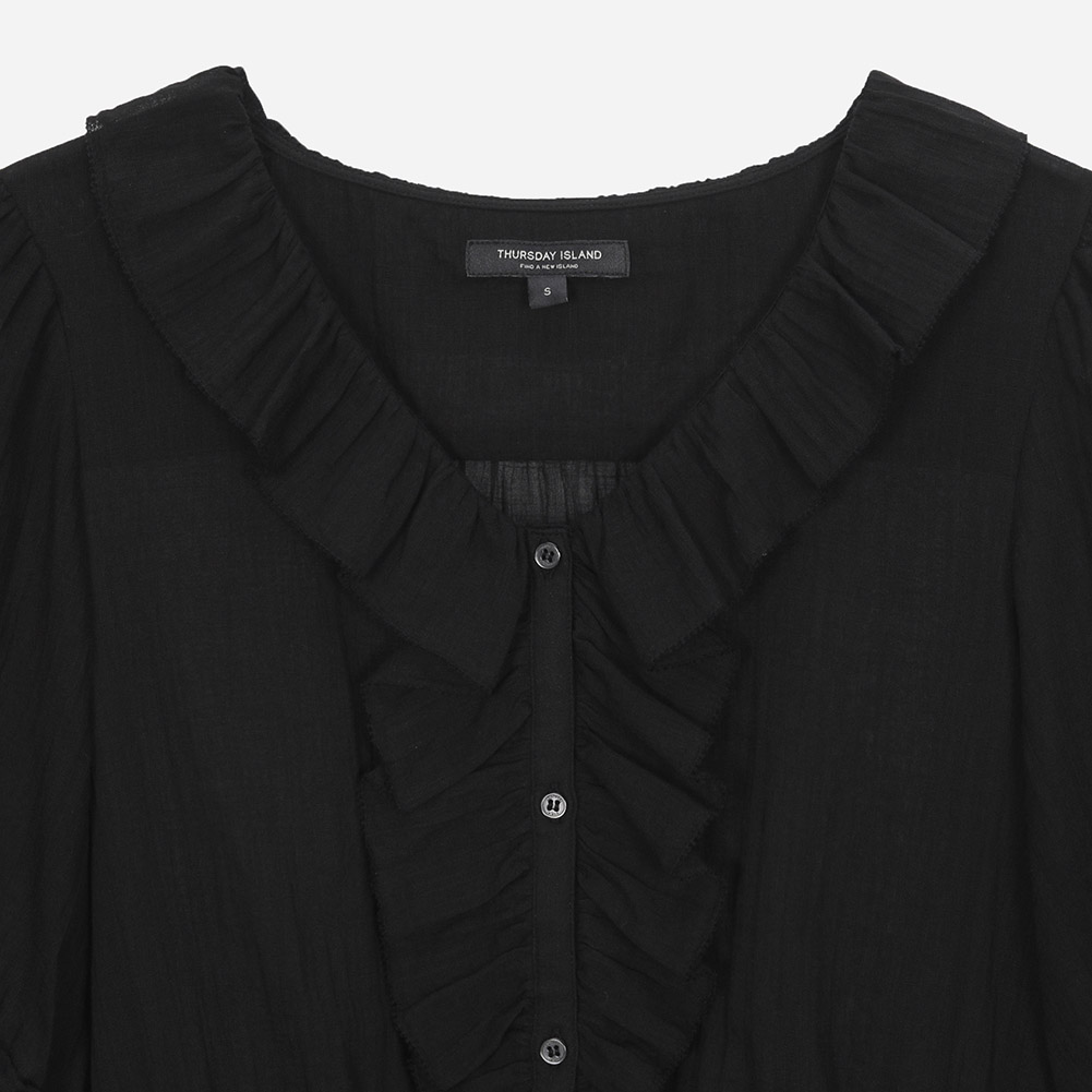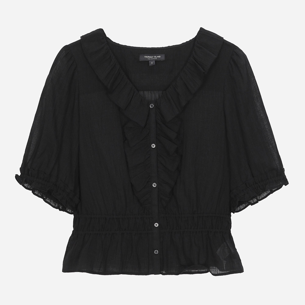 시스루한 면 블라우스로 넥에 러플 디자인과 허리부분에 두줄 이밴드로 자연스러운 볼륨을 준 귀여운 느낌의 블라우스.