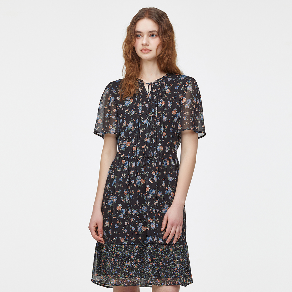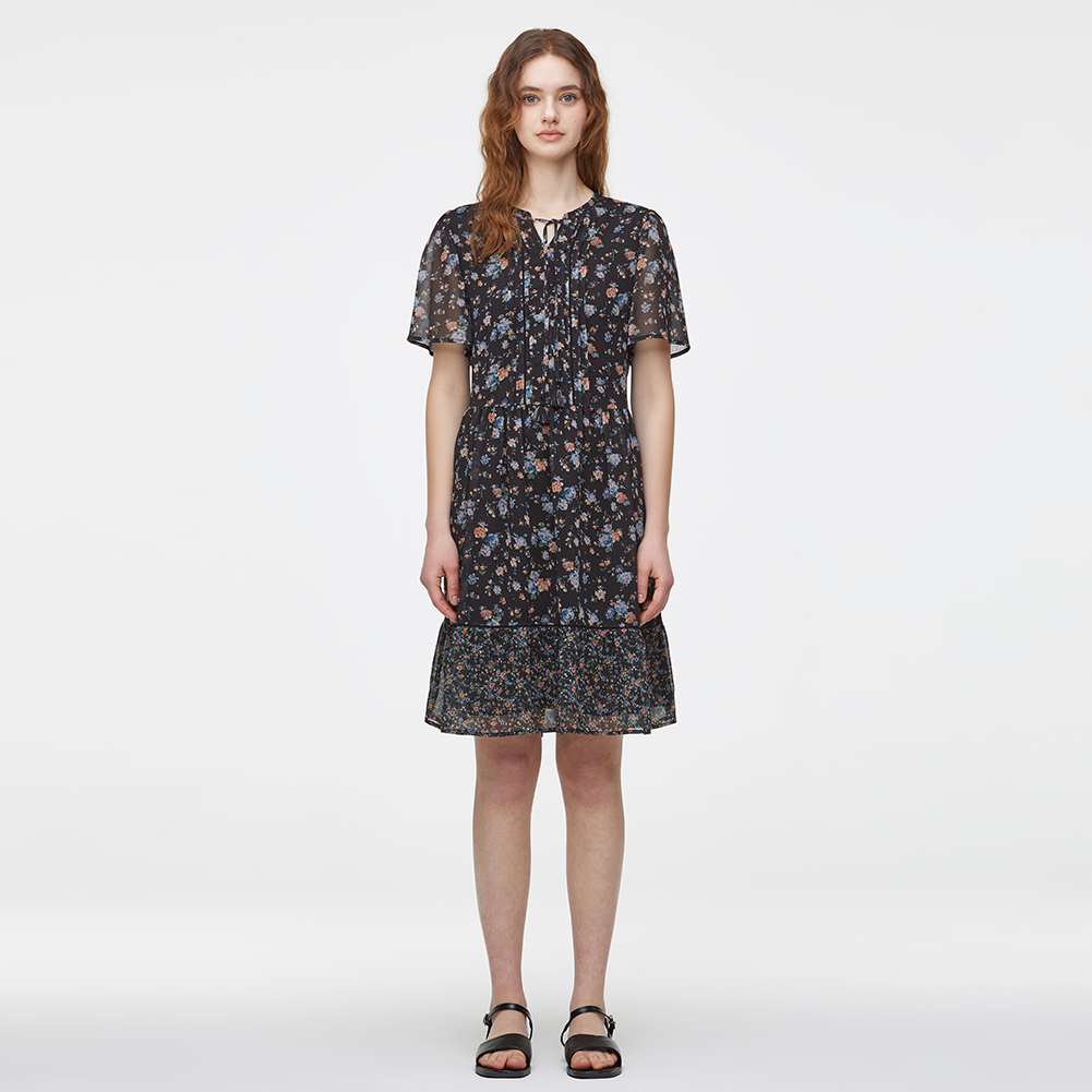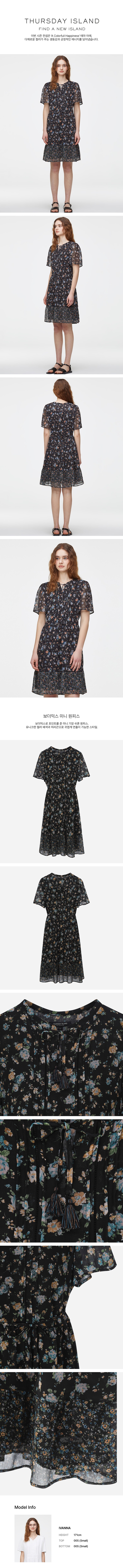 보더믹스로 포인트를 준 미니 기장 쉬폰 원피스.유니크한 컬러 배색과 허리끈으로 귀엽게 연출이 가능한 스타일.