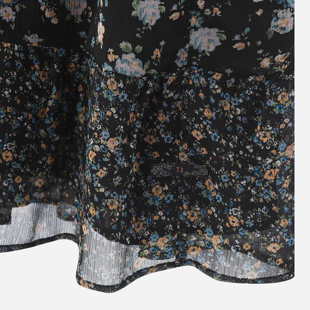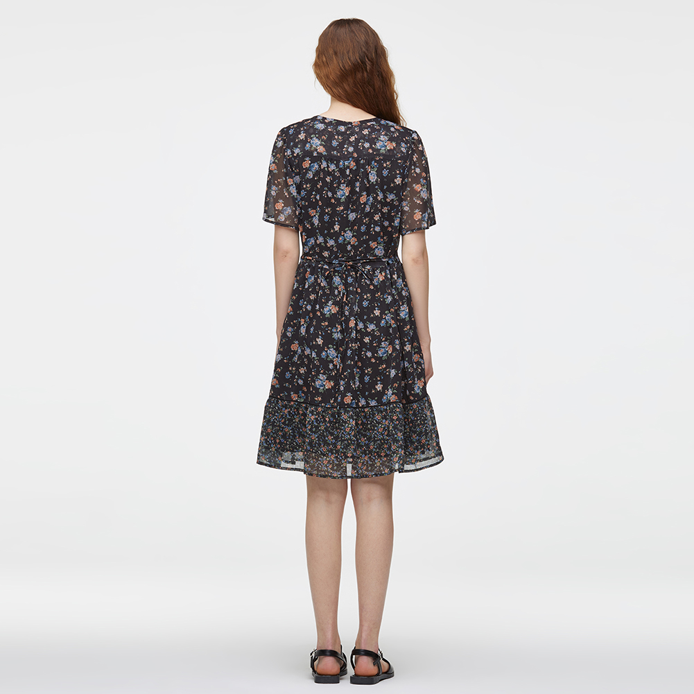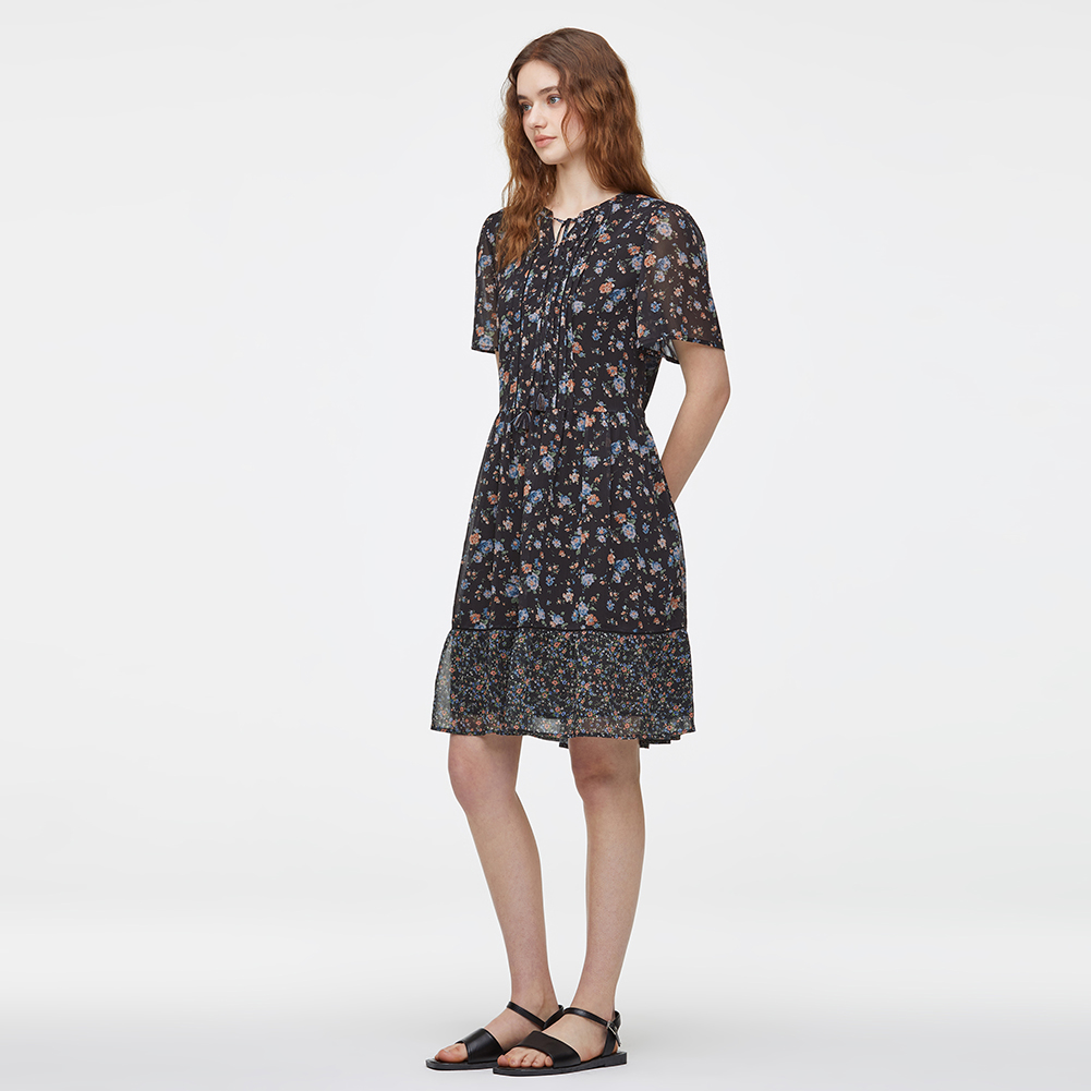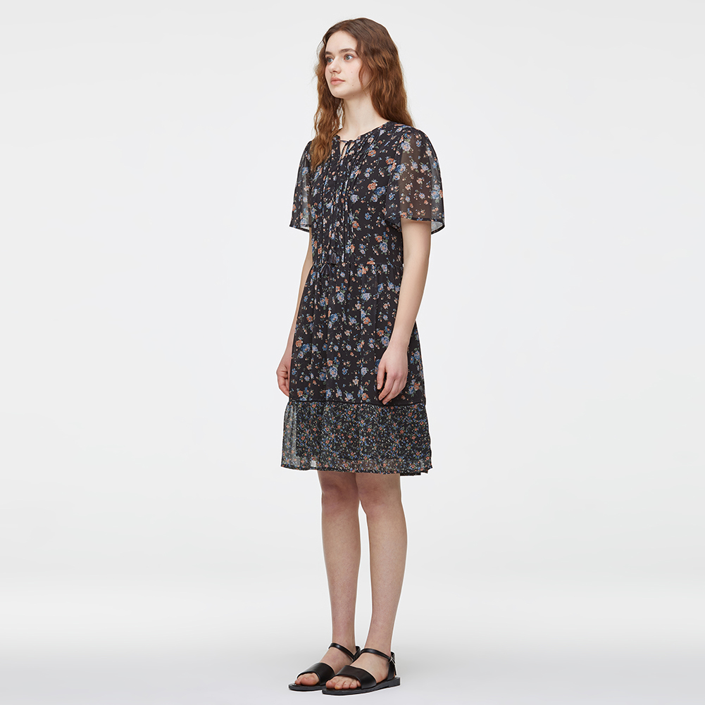 보더믹스로 포인트를 준 미니 기장 쉬폰 원피스.유니크한 컬러 배색과 허리끈으로 귀엽게 연출이 가능한 스타일.