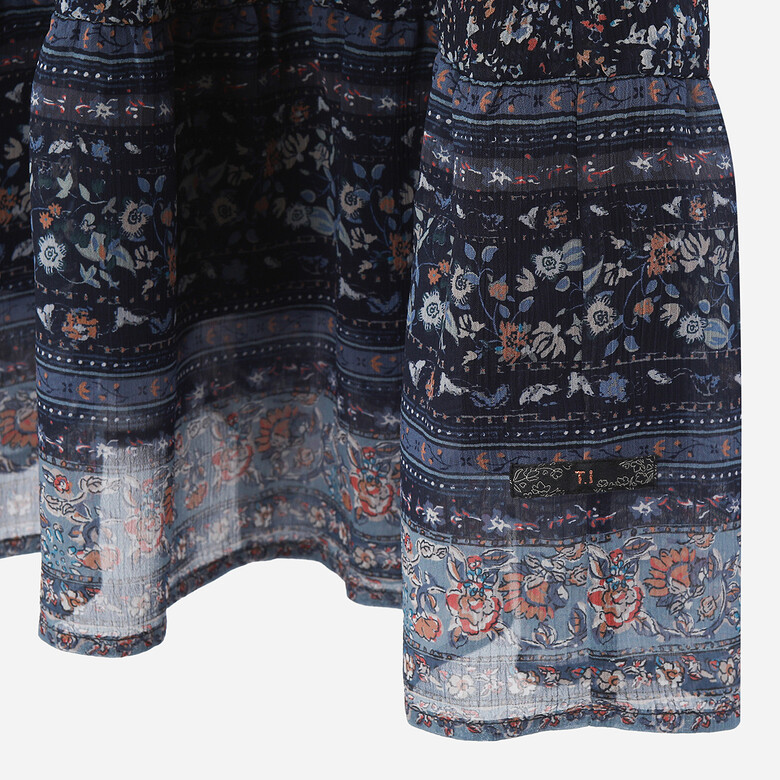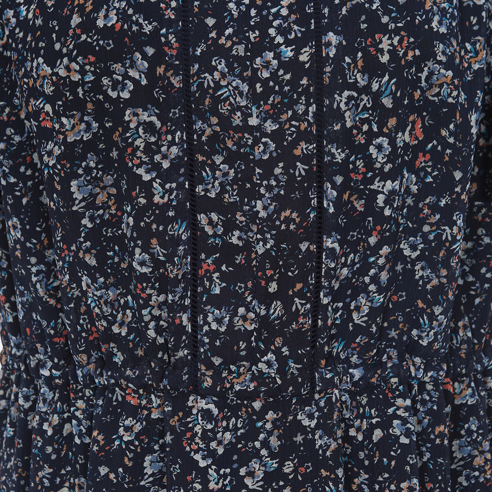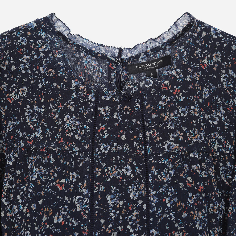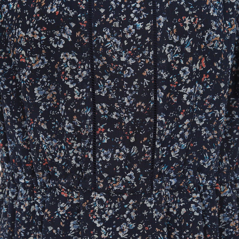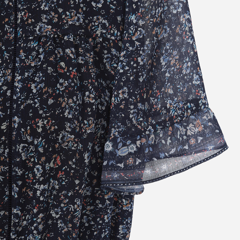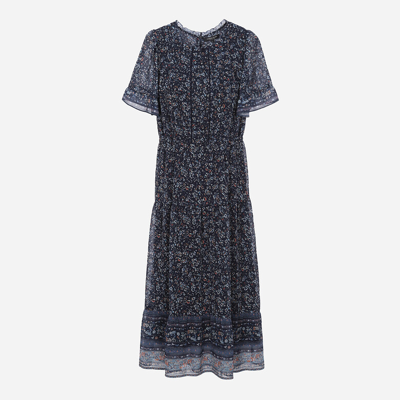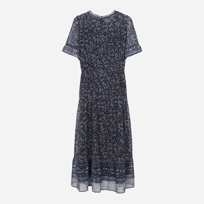 잔잔한 플라워 프린트에 셔링으로 볼륨을 준 요루 쉬폰 원피스.소매와 밑단의 은은한 보더 배색이