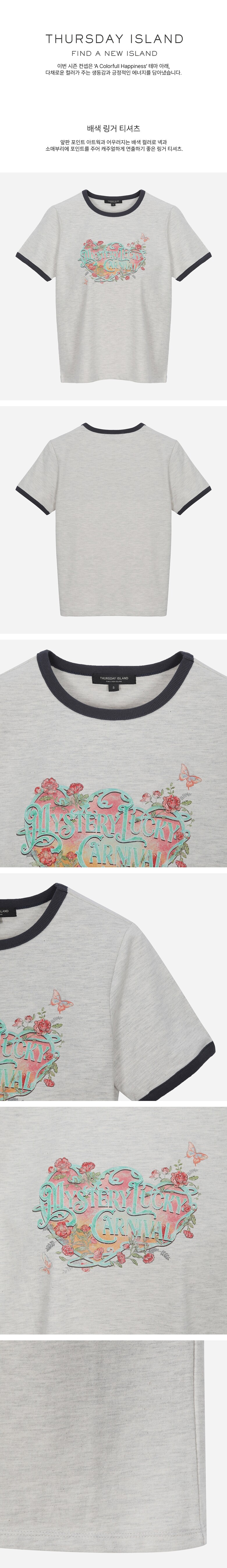 앞판 포인트 아트웍과 어우러지는 배색 컬러로 넥과 소매부리에 포인트를 주어 캐주얼하게 연출하기 좋은 링거 티셔츠.