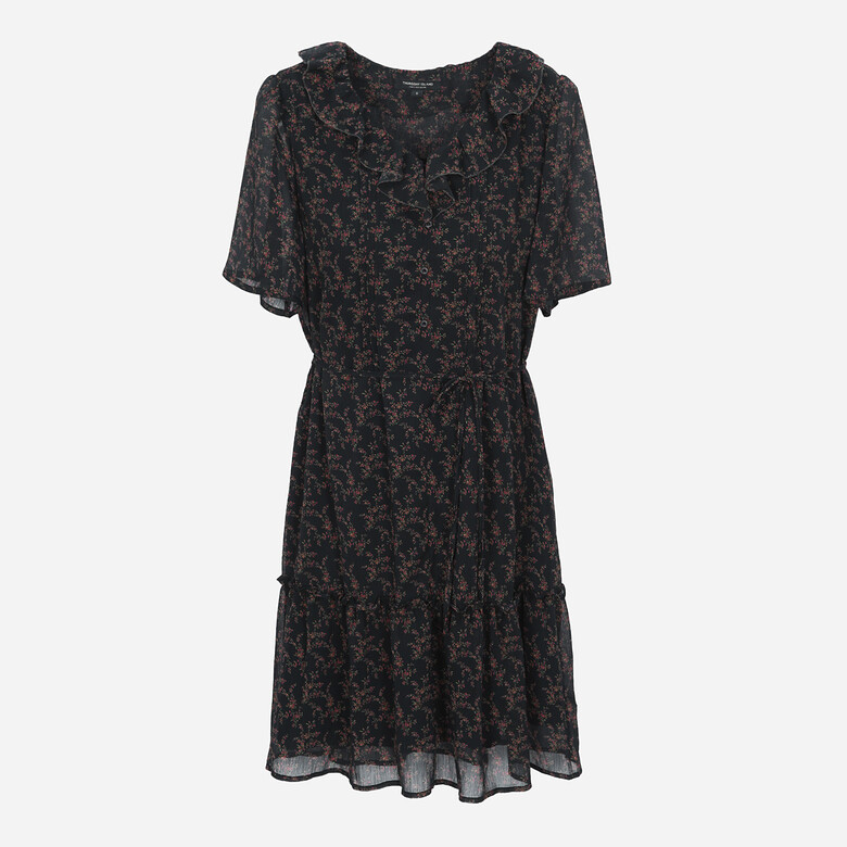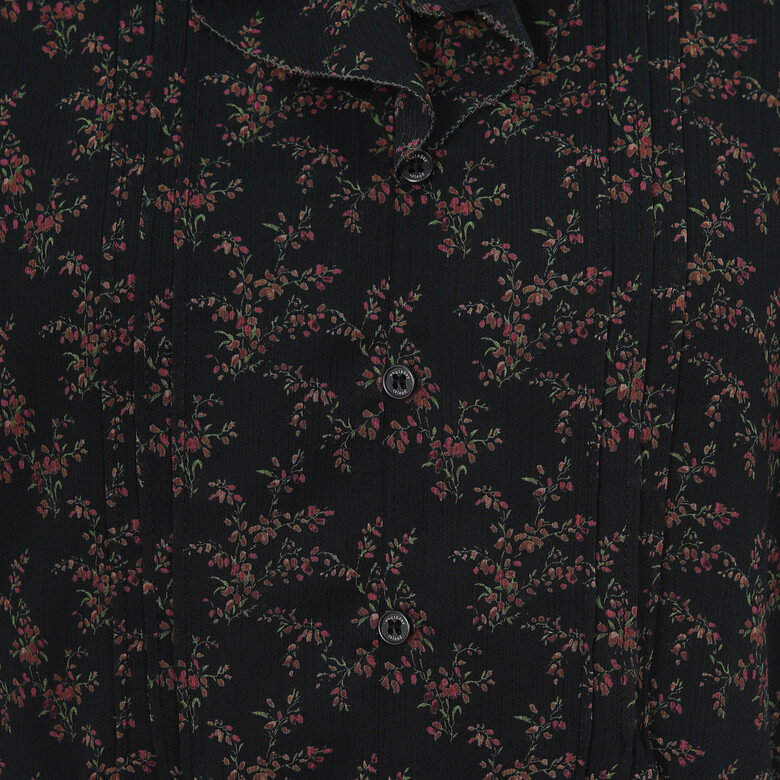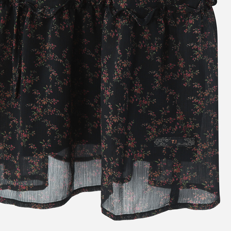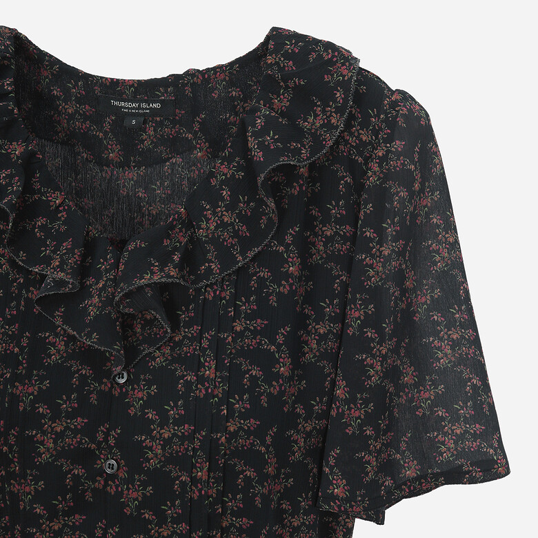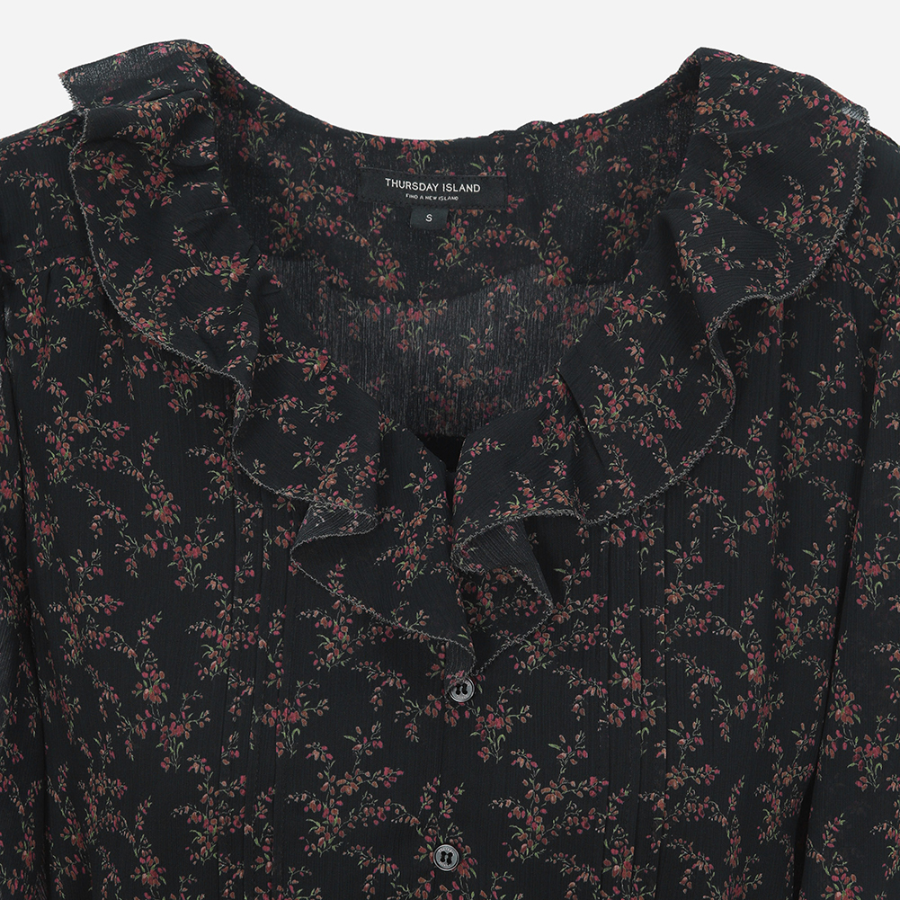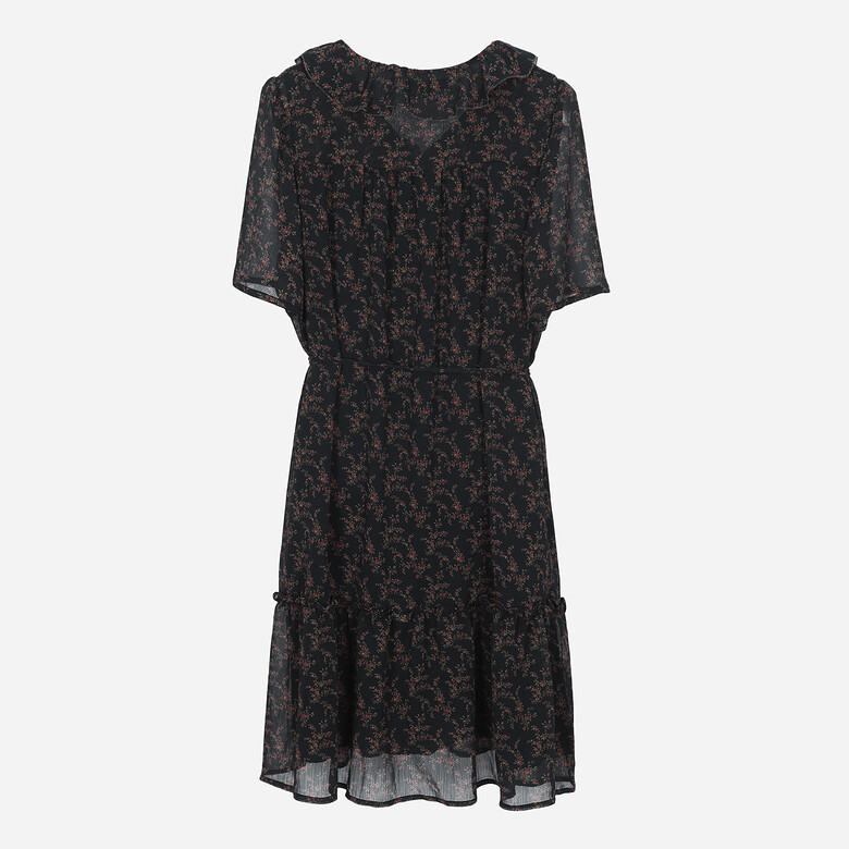 허리끈으로 묶어서 연출 가능한 A라인의 미디 기장 원피스.플라워 패턴에 패고딩 프릴과 핀턱으로 포인트를 준 스타일.