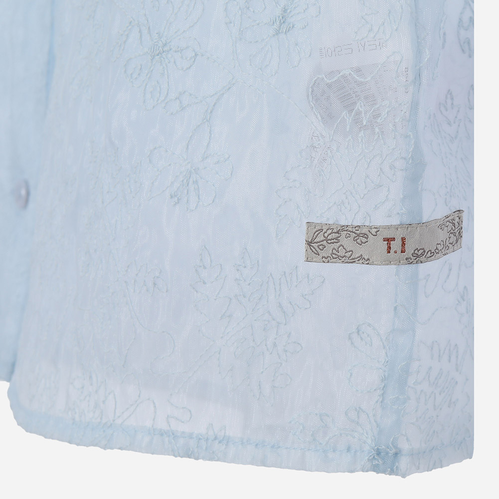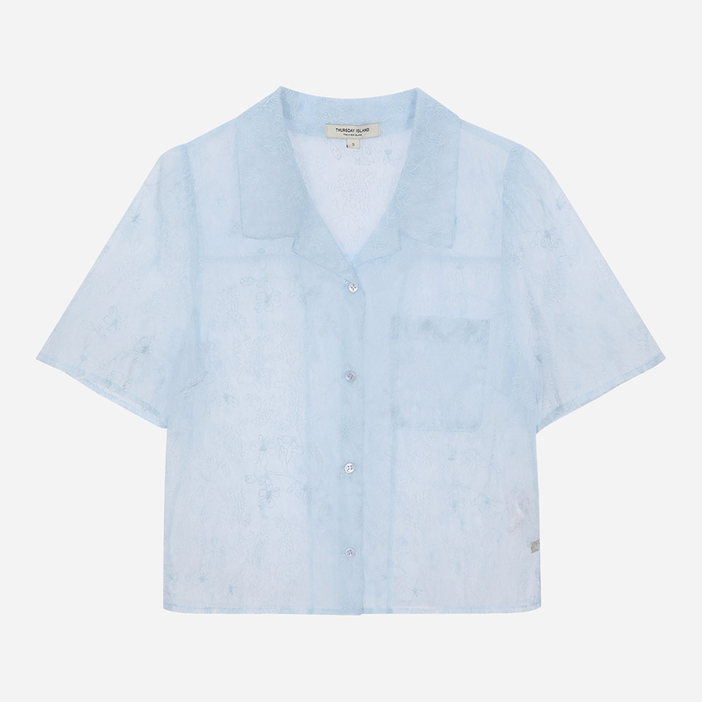 시스루한 매쉬소재에 전판 패턴 자수가 포인트인 셔츠형 블라우스.레이어드용으로 스타일링이 가능한 아이템으로 다양하게 연출할 수 있는 스타일.