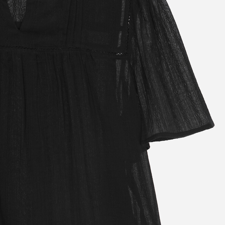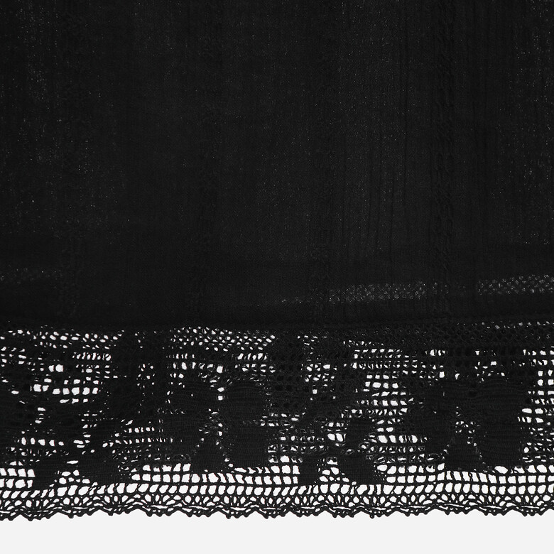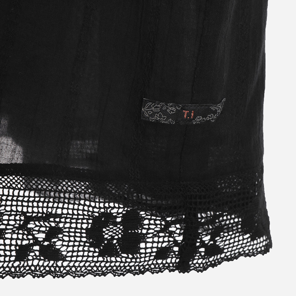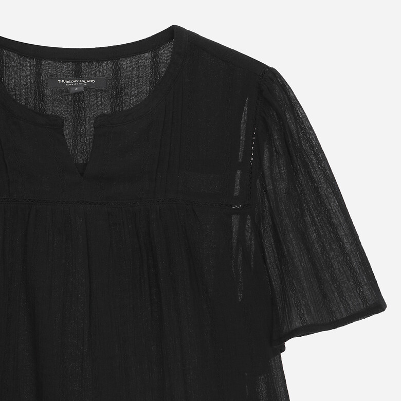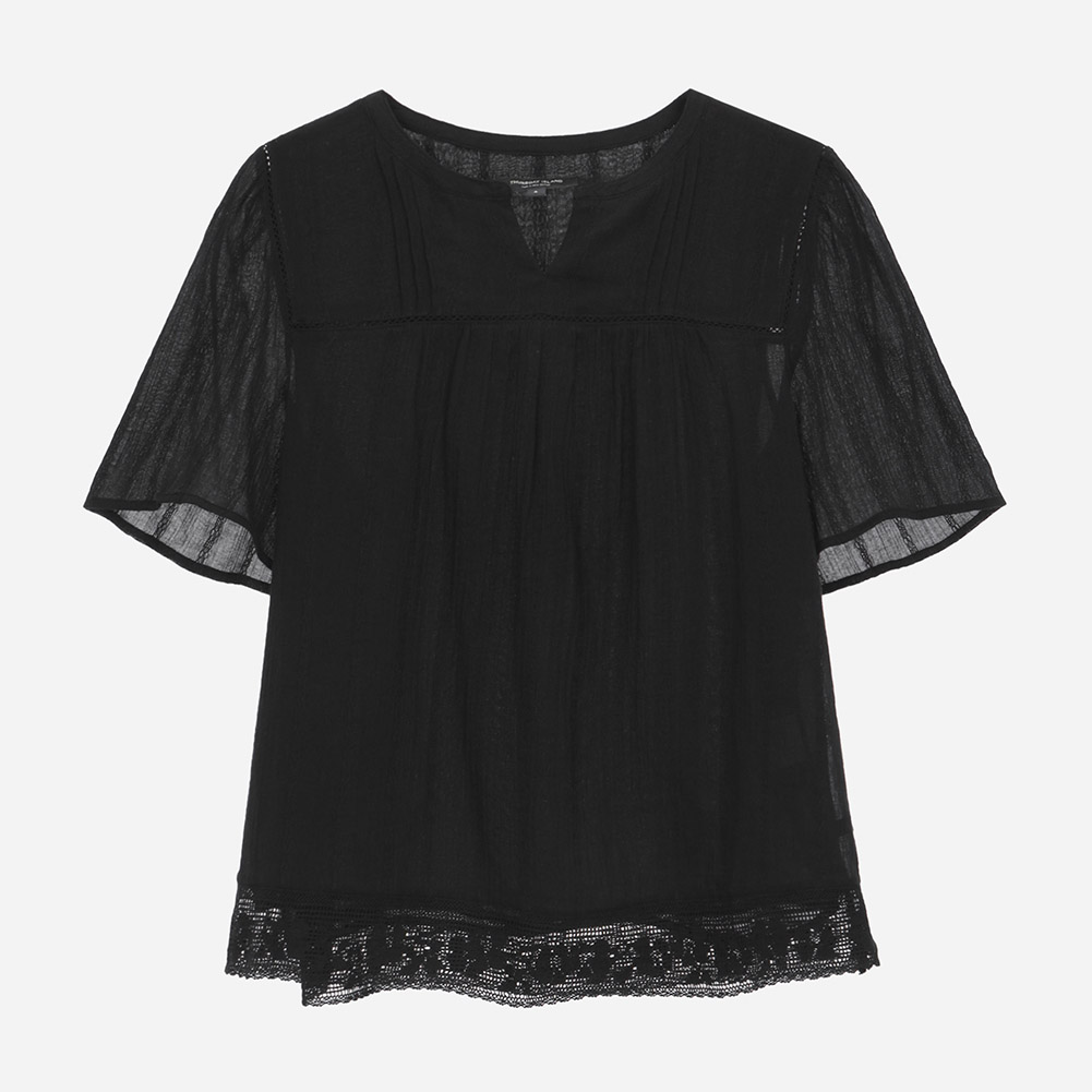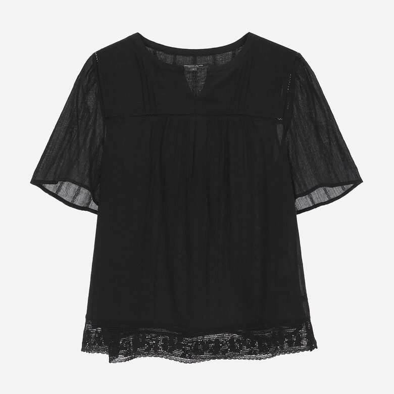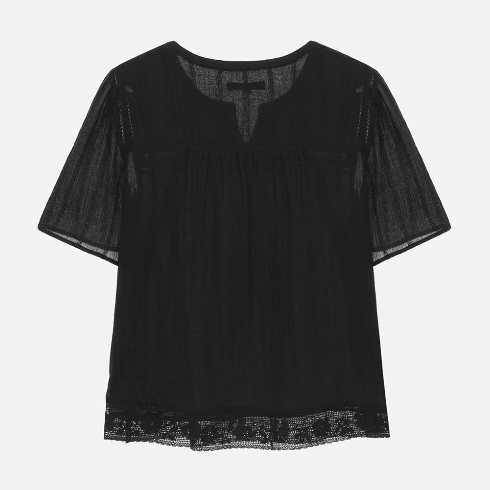 밑단과 요크 라인에 레이스를 믹스한 블라우스.A라인으로 떨어지는 편안한 실루엣으로 다양한 하의와 코디하기 용이한 스타일.
