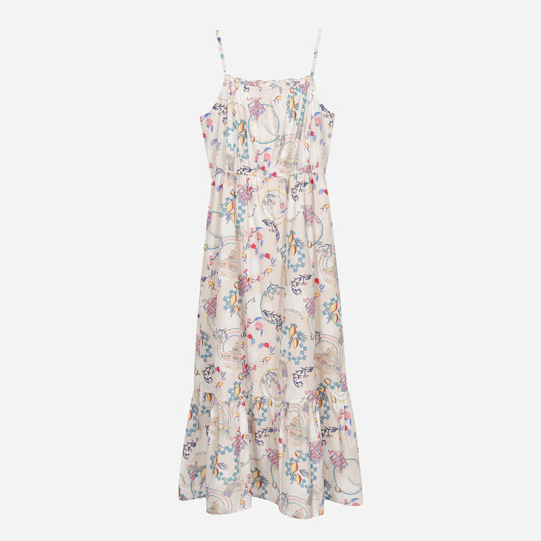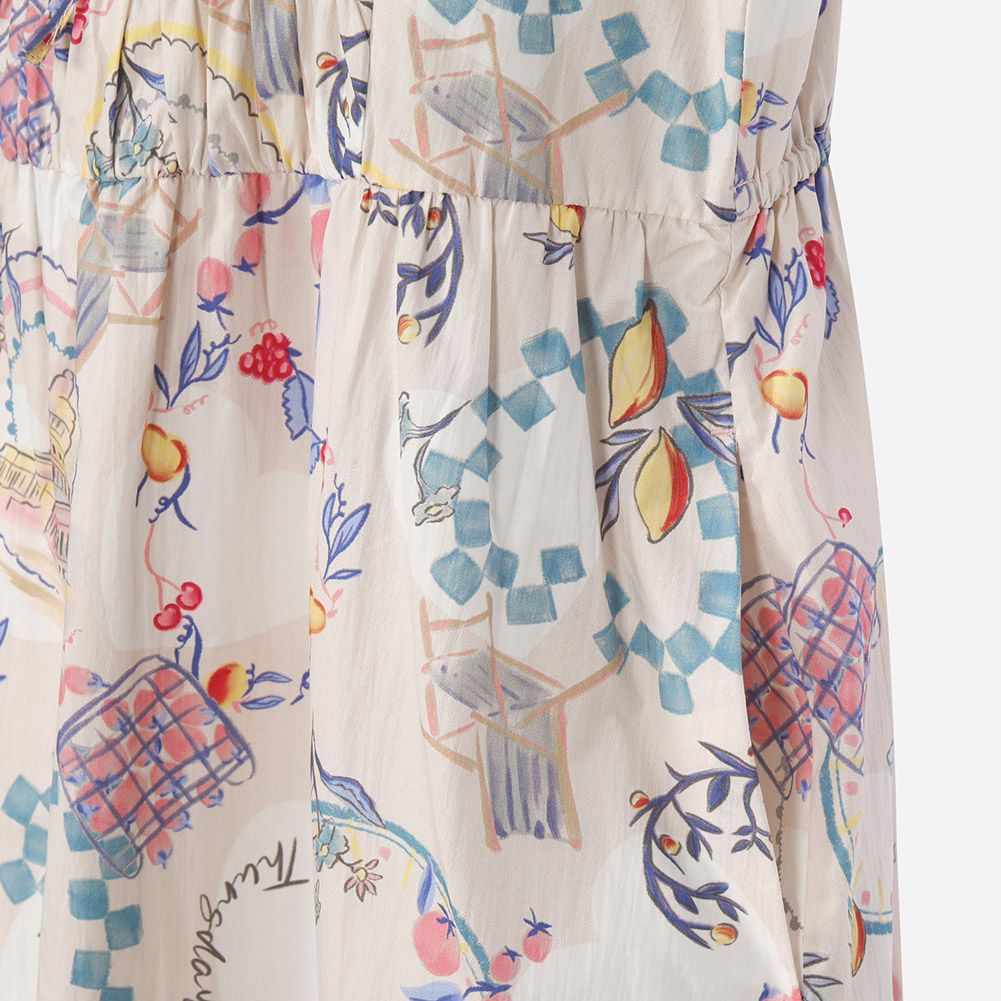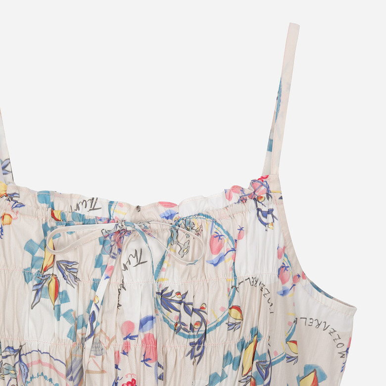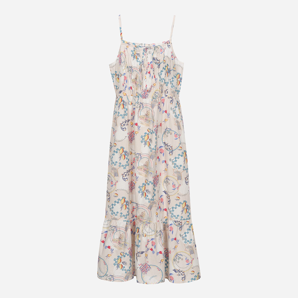 셔링 디테일이 포인트이며, 한여름 포인트로 입을 수 있는 슬리브리스 원피스.