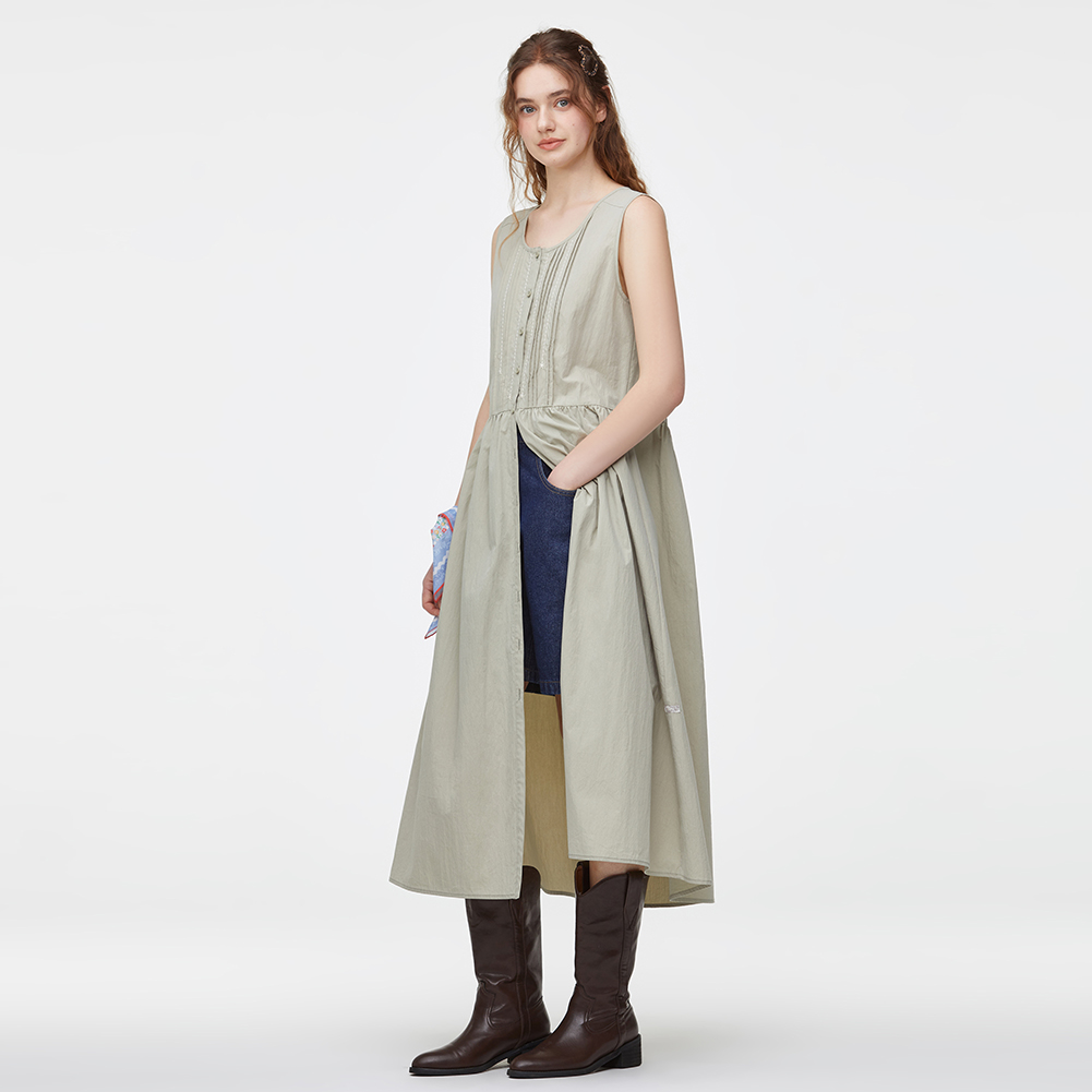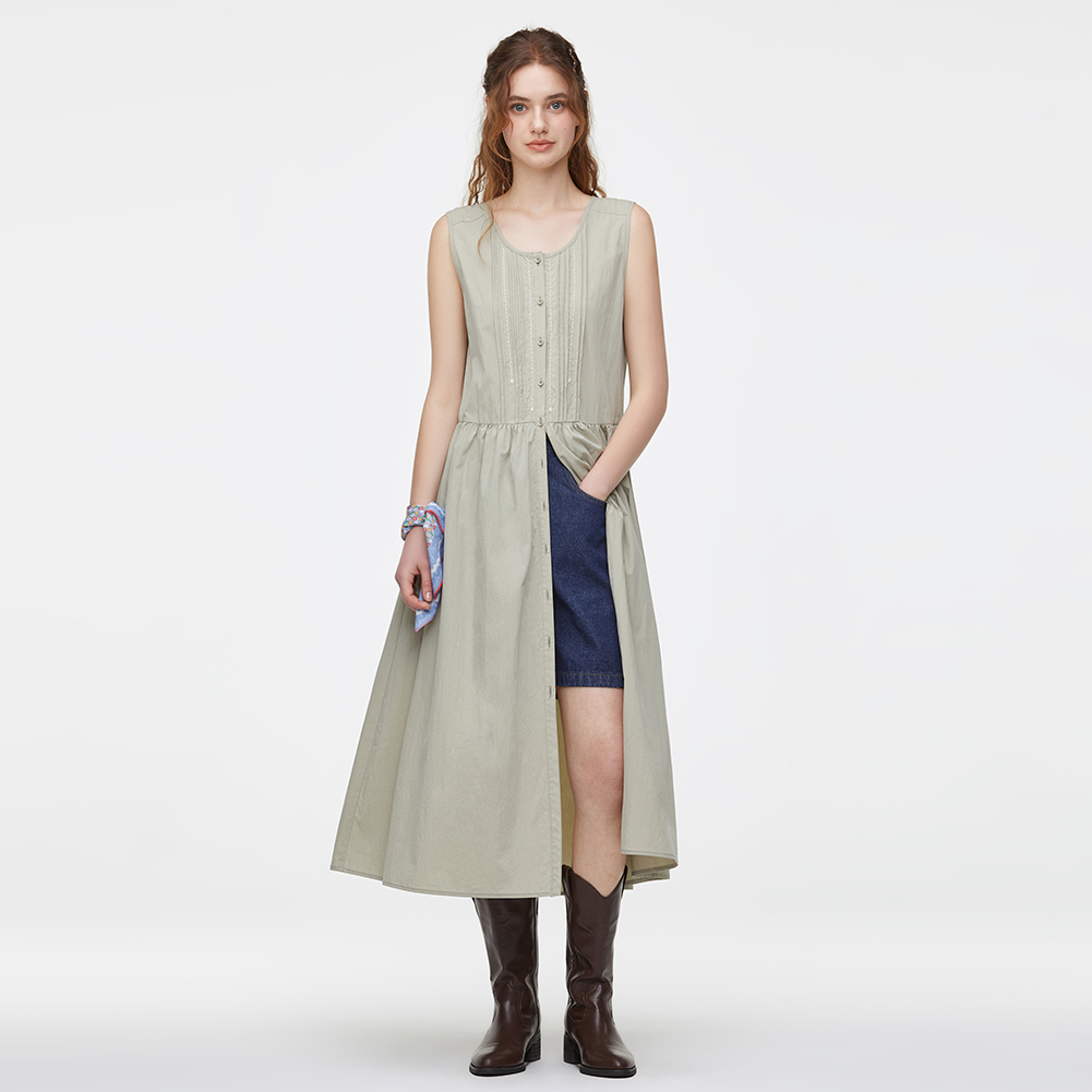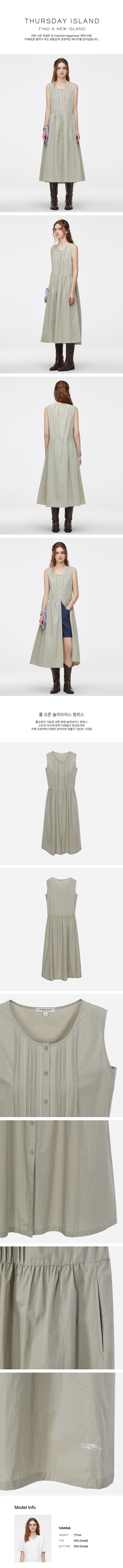 풀오픈이 가능한 코튼 혼방 슬리브리스 원피스.스티치 자수와 핀턱 디테일이 포인트이며 전체 오픈하여 다양한 상하의와 연출이 가능한 스타일.