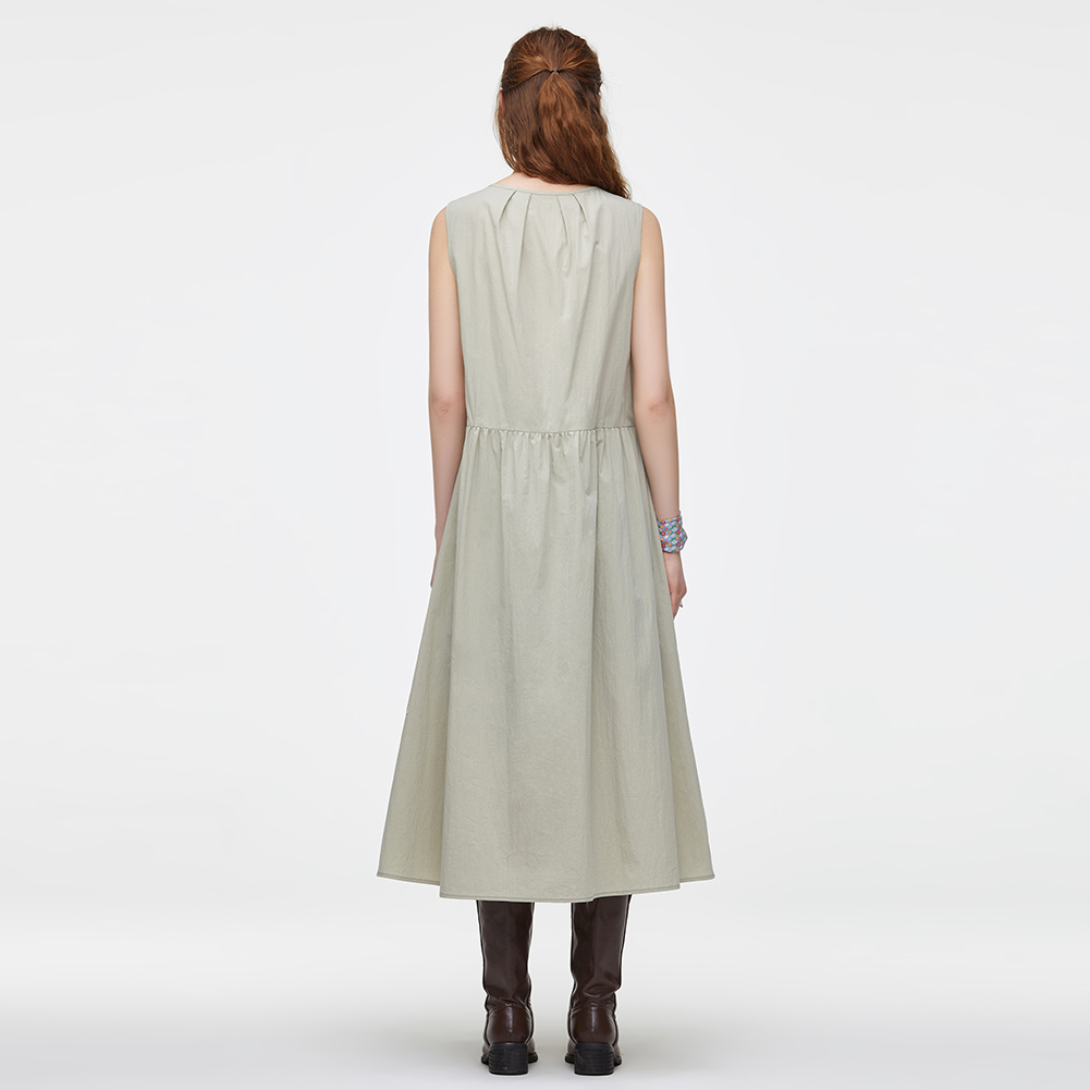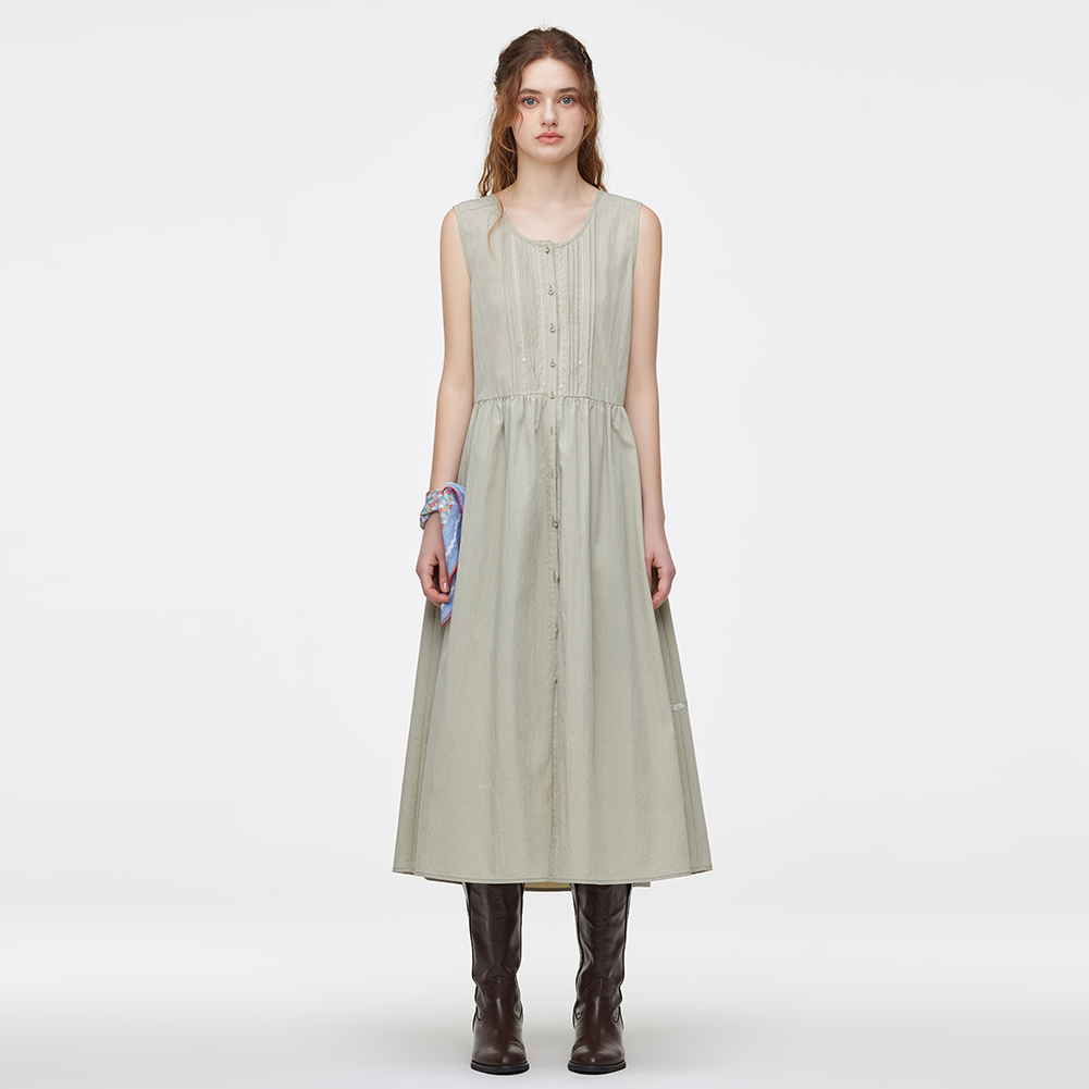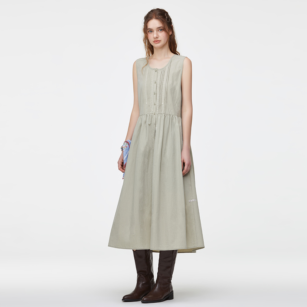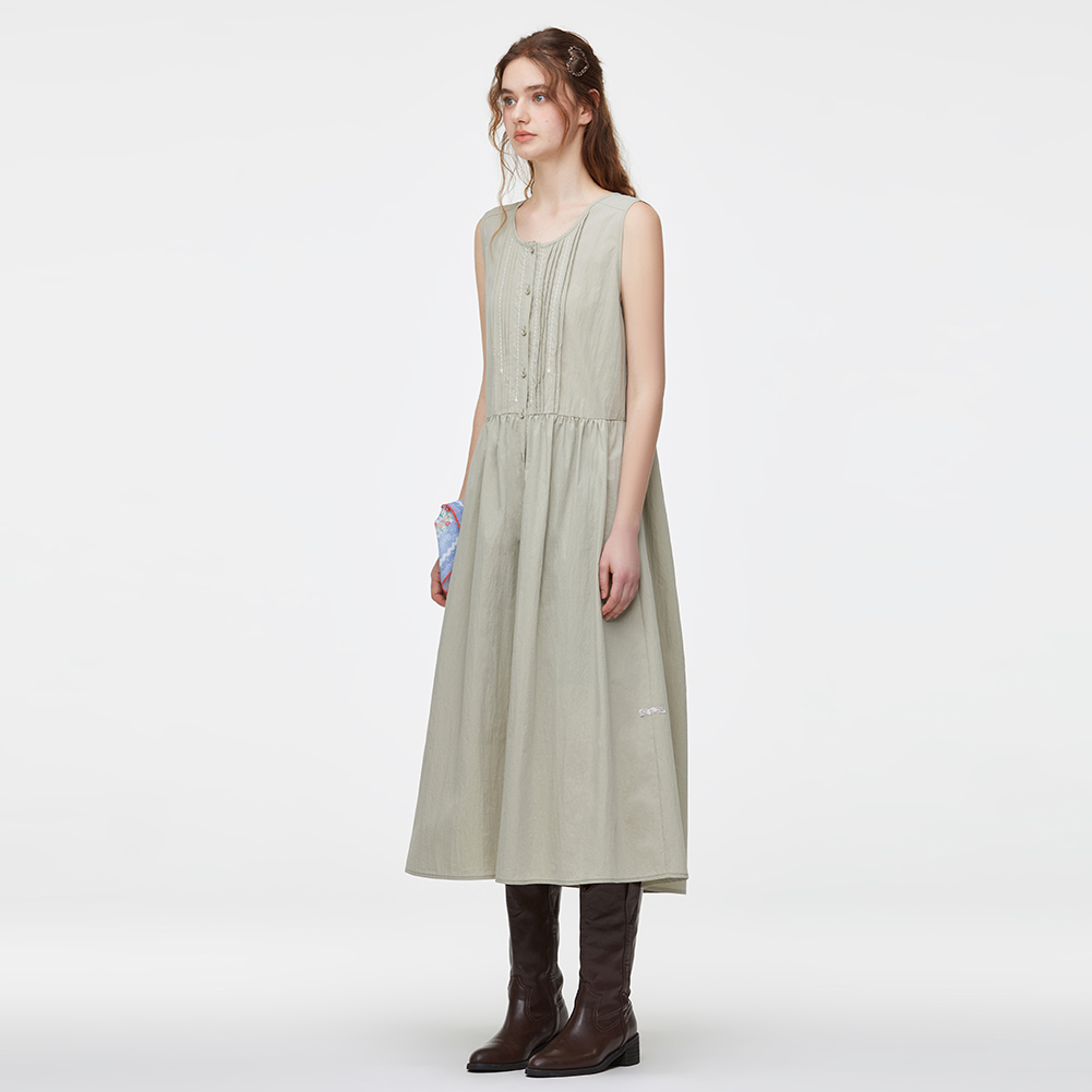 풀오픈이 가능한 코튼 혼방 슬리브리스 원피스.스티치 자수와 핀턱 디테일이 포인트이며 전체 오픈하여 다양한 상하의와 연출이 가능한 스타일.