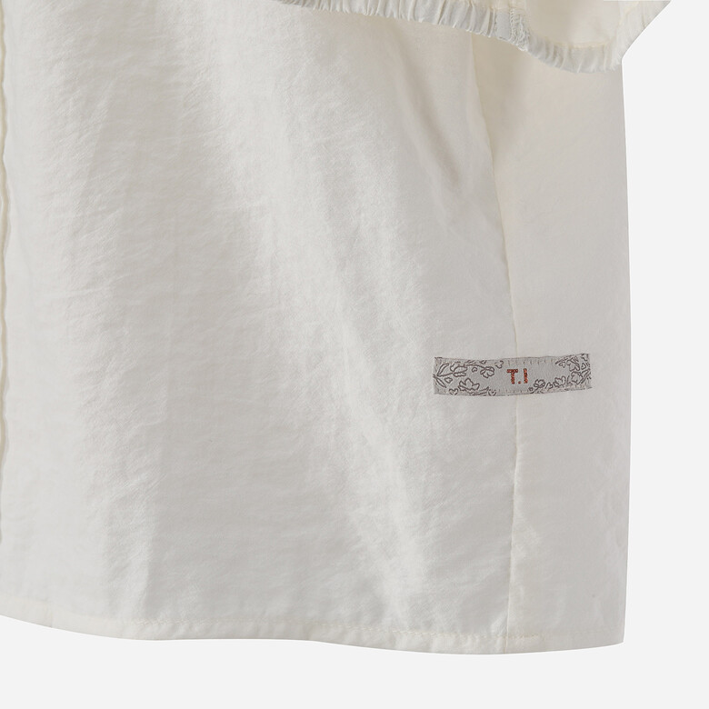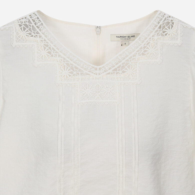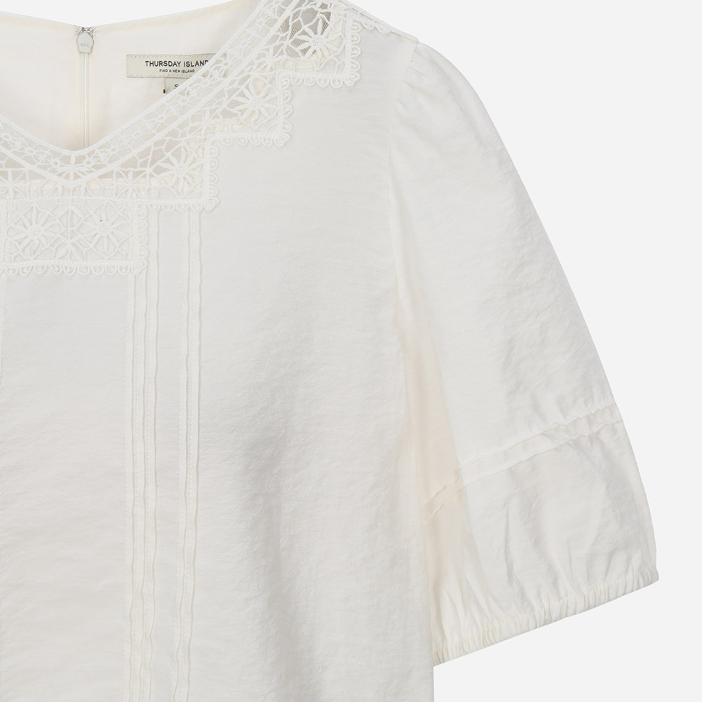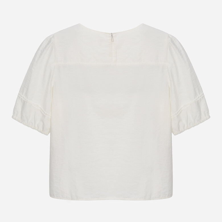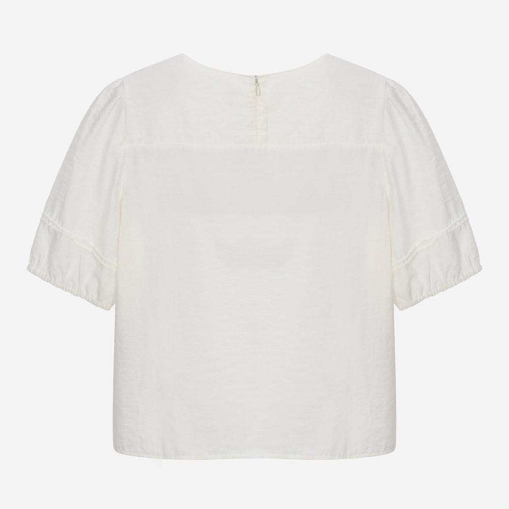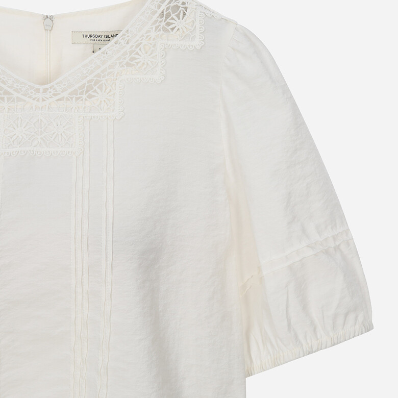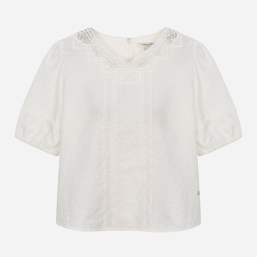 유니크한 네크 레이스가 포인트인 크롭 기장의 볼륨소매 블라우스.