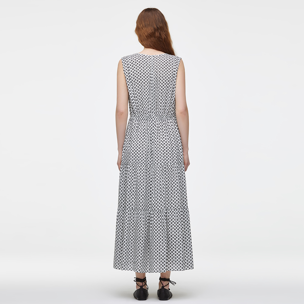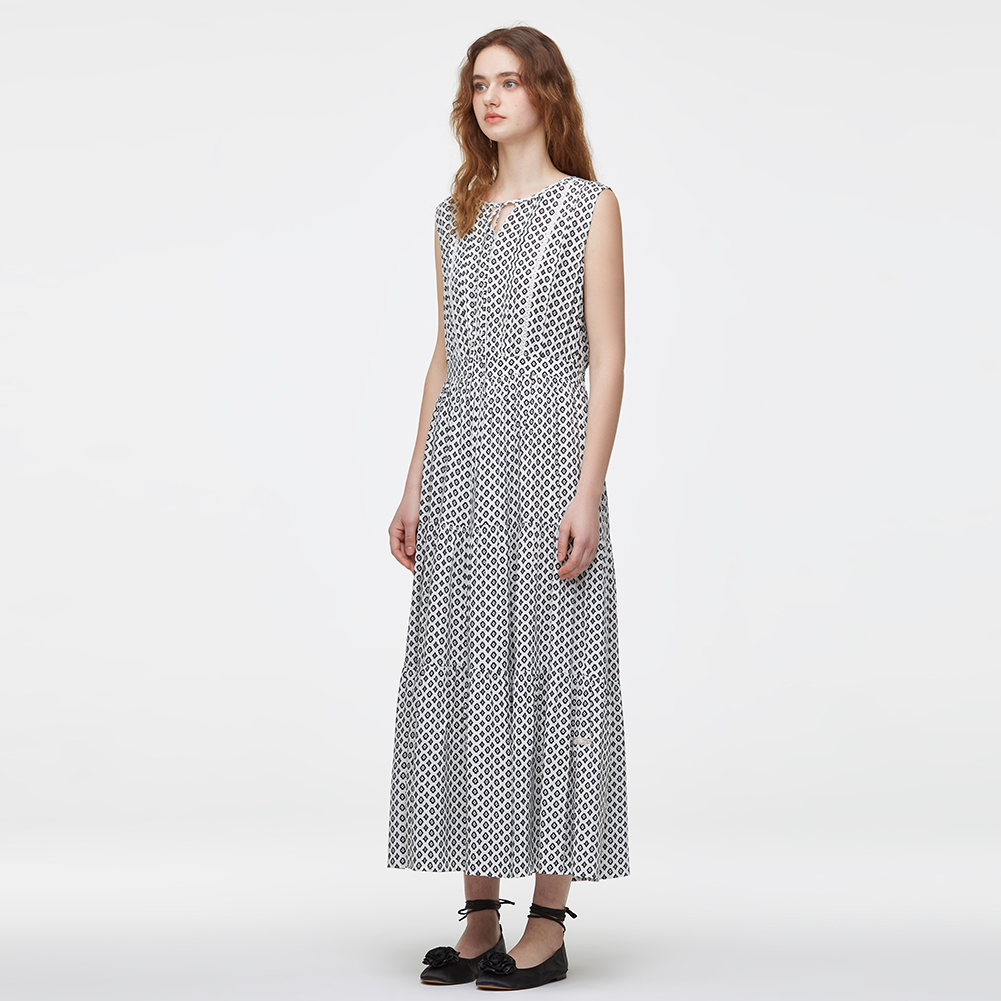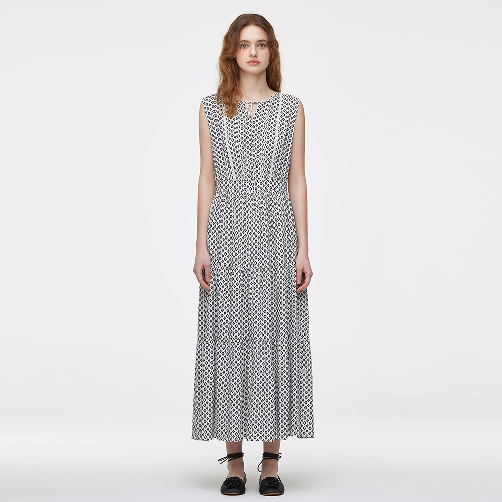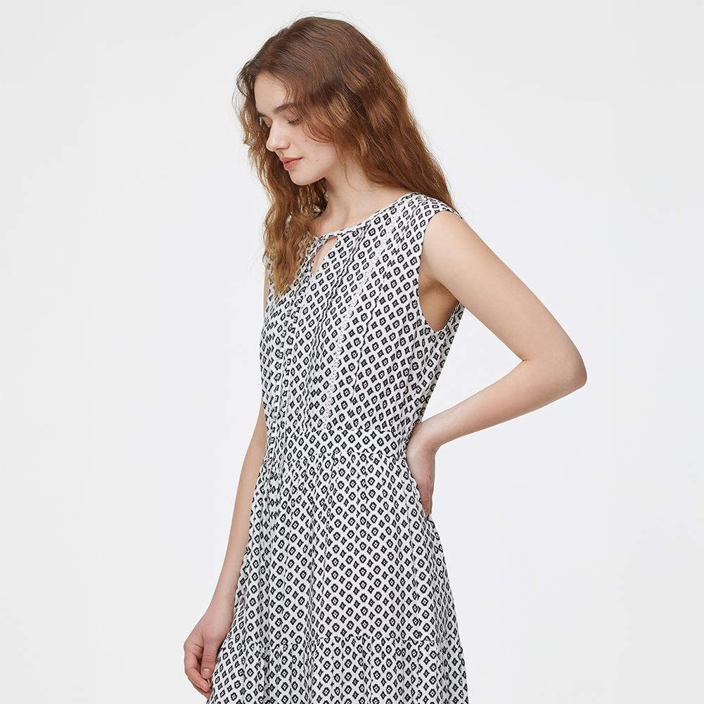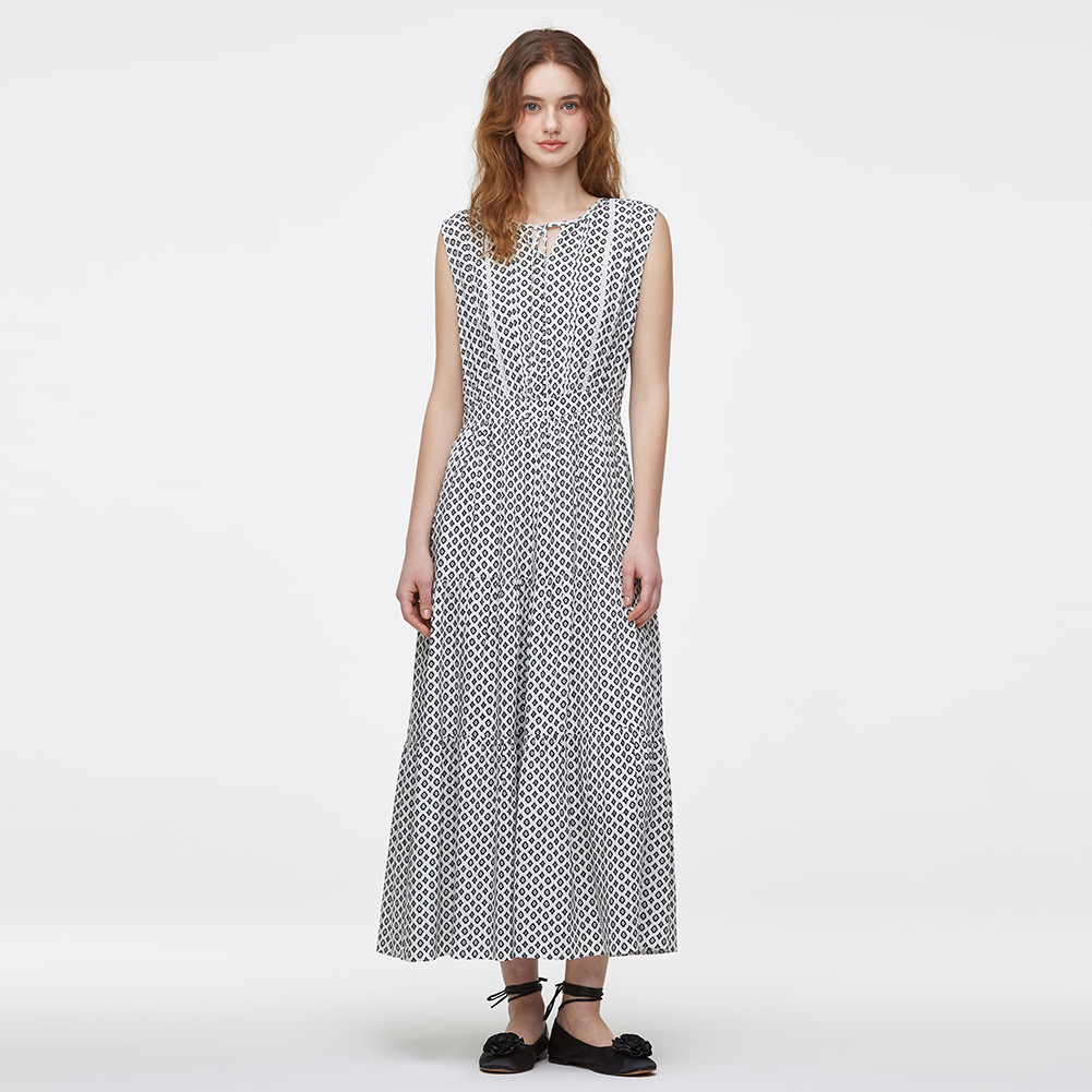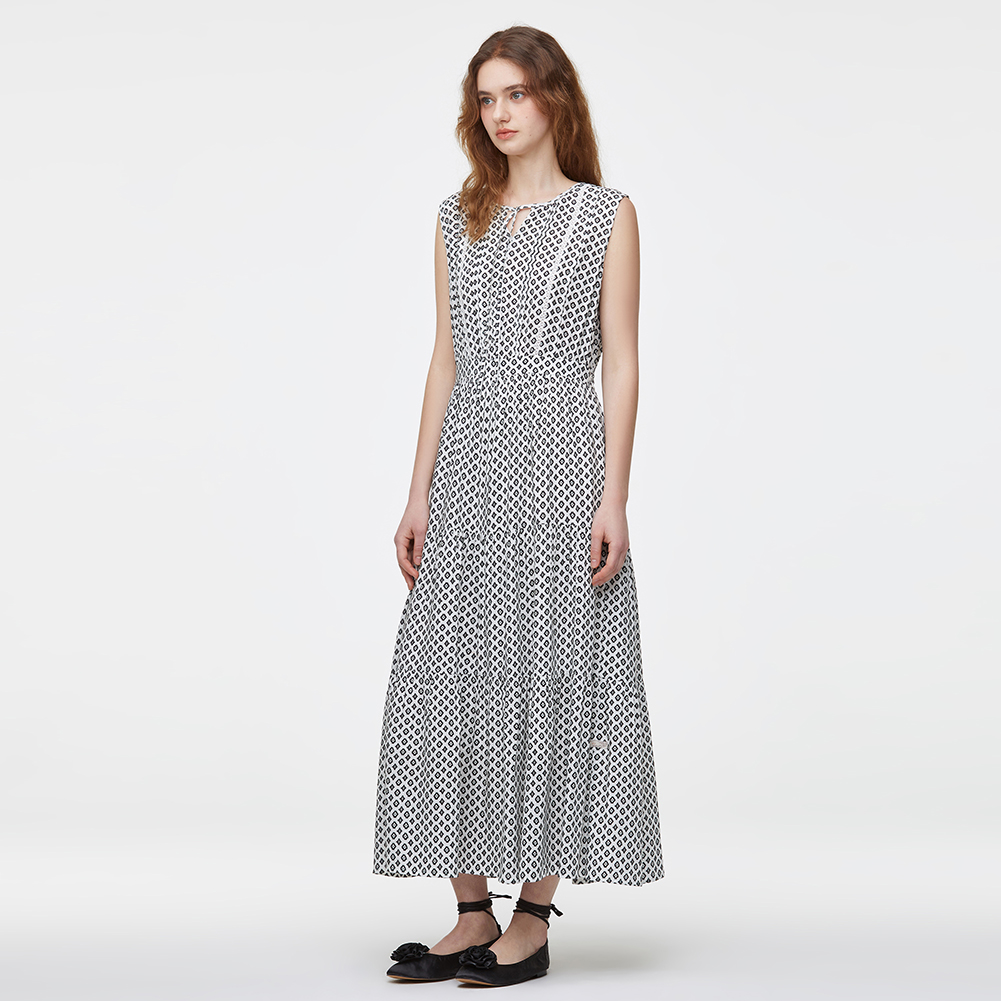 기하학 패턴의 레이온 슬리브리스 원피스.핀턱과 레이스로 포인트를 주었으며 뒤 허리 이밴드 스모킹으로 자연스럽게 볼륨감을 준 여성스러운 아이템.