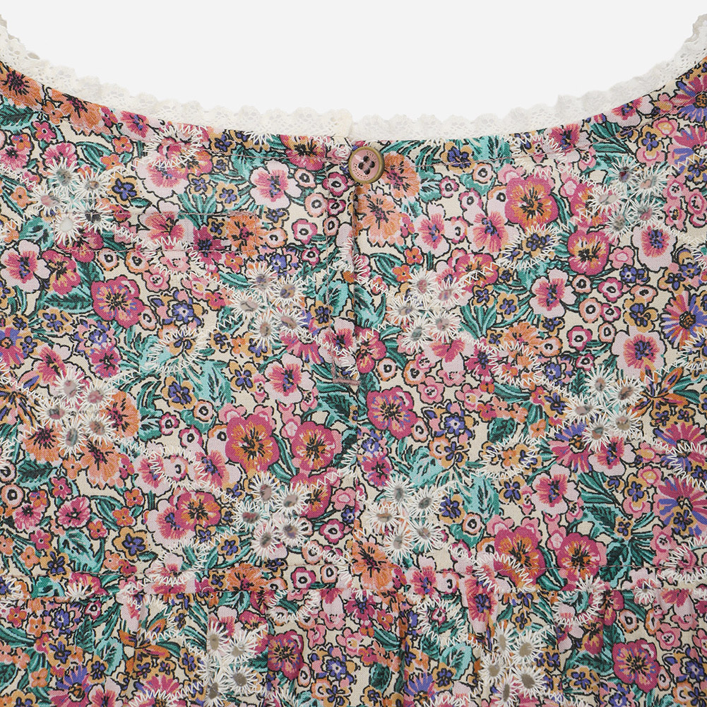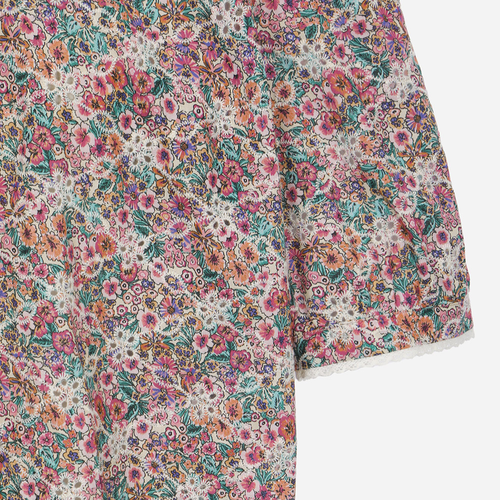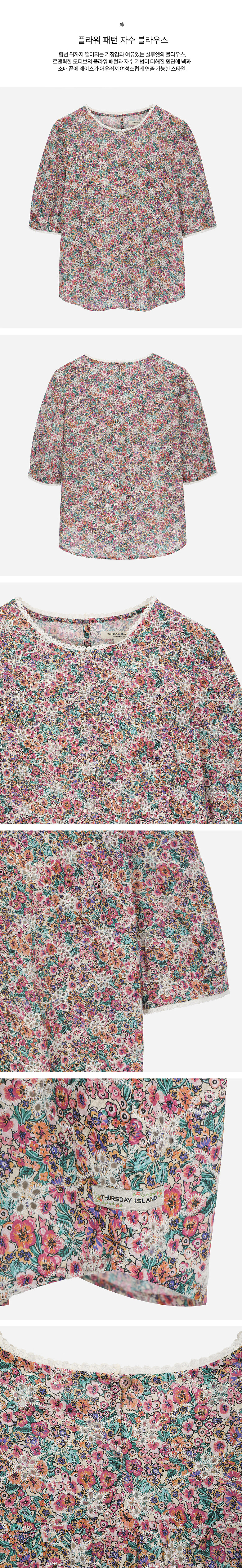 로맨틱한 모티브의 플라워 패턴과 자수 기법이 더해진 원단에 넥과 소매끝에 레이스가 어우러져
