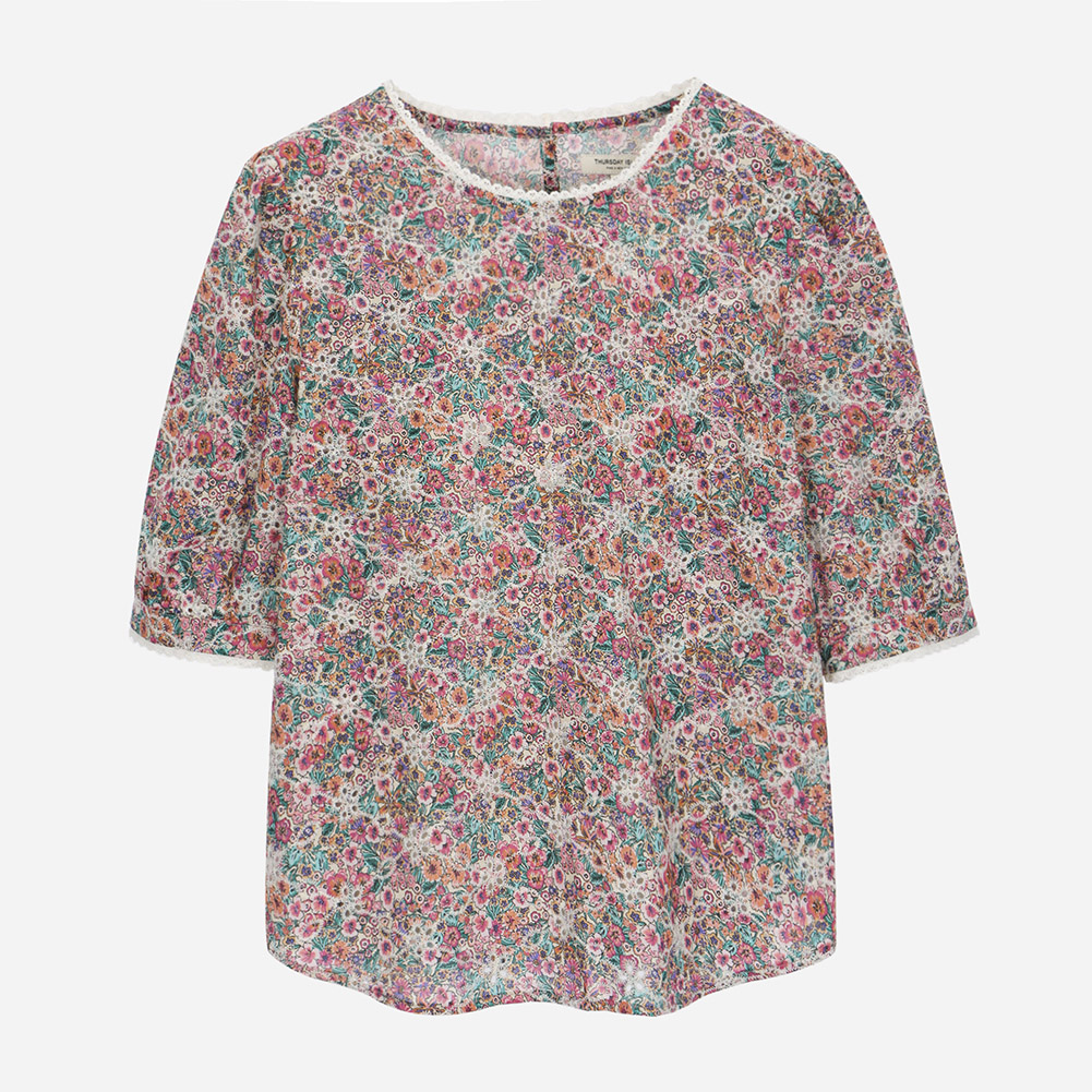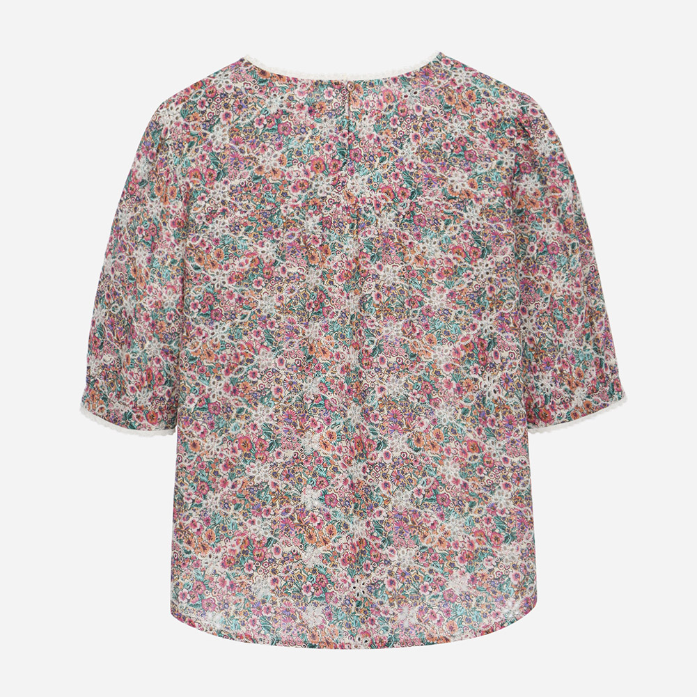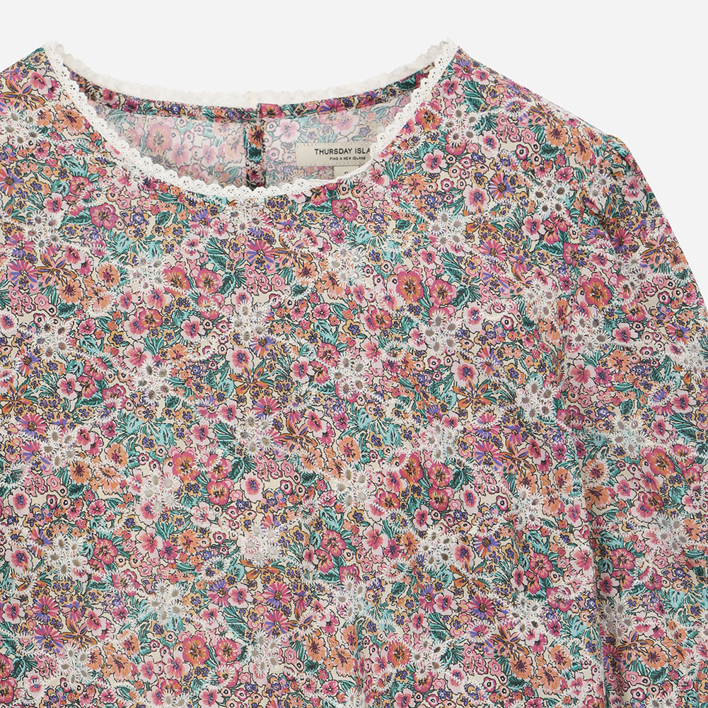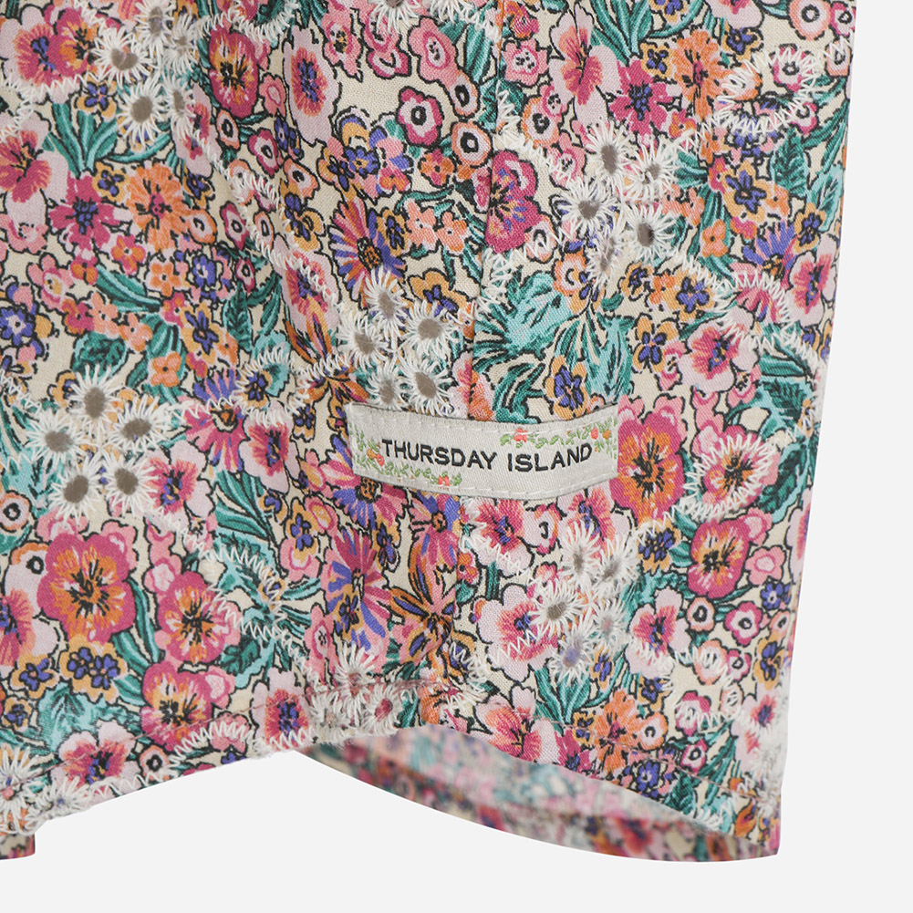 로맨틱한 모티브의 플라워 패턴과 자수 기법이 더해진 원단에 넥과 소매끝에 레이스가 어우러져