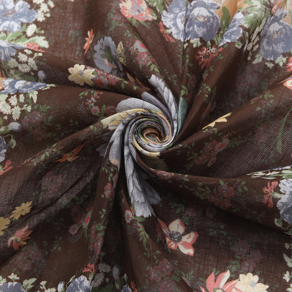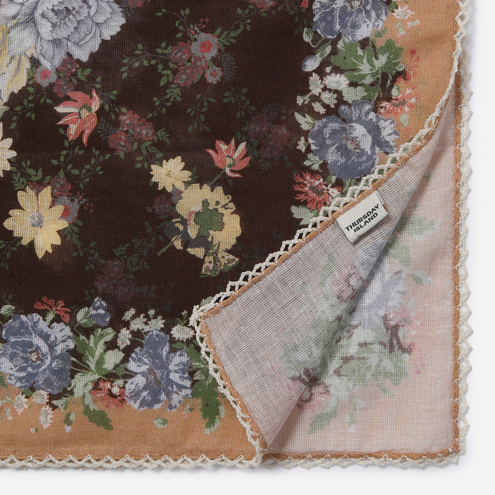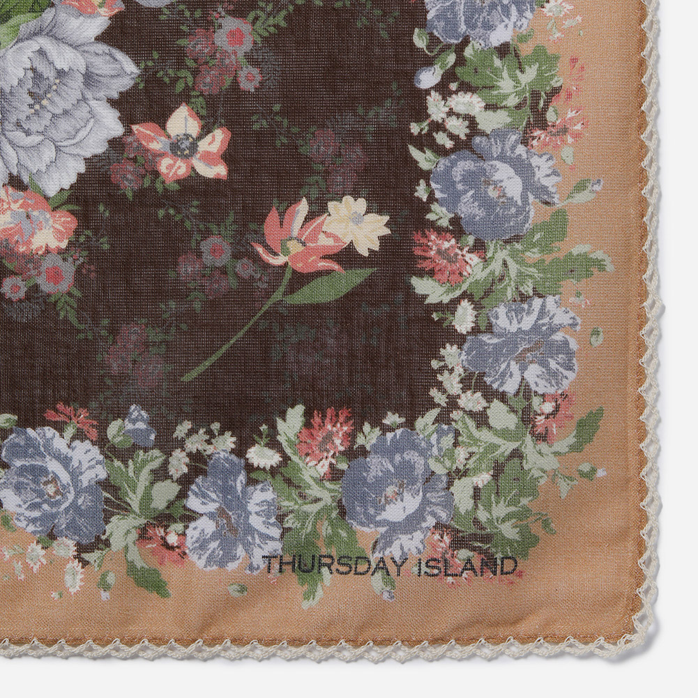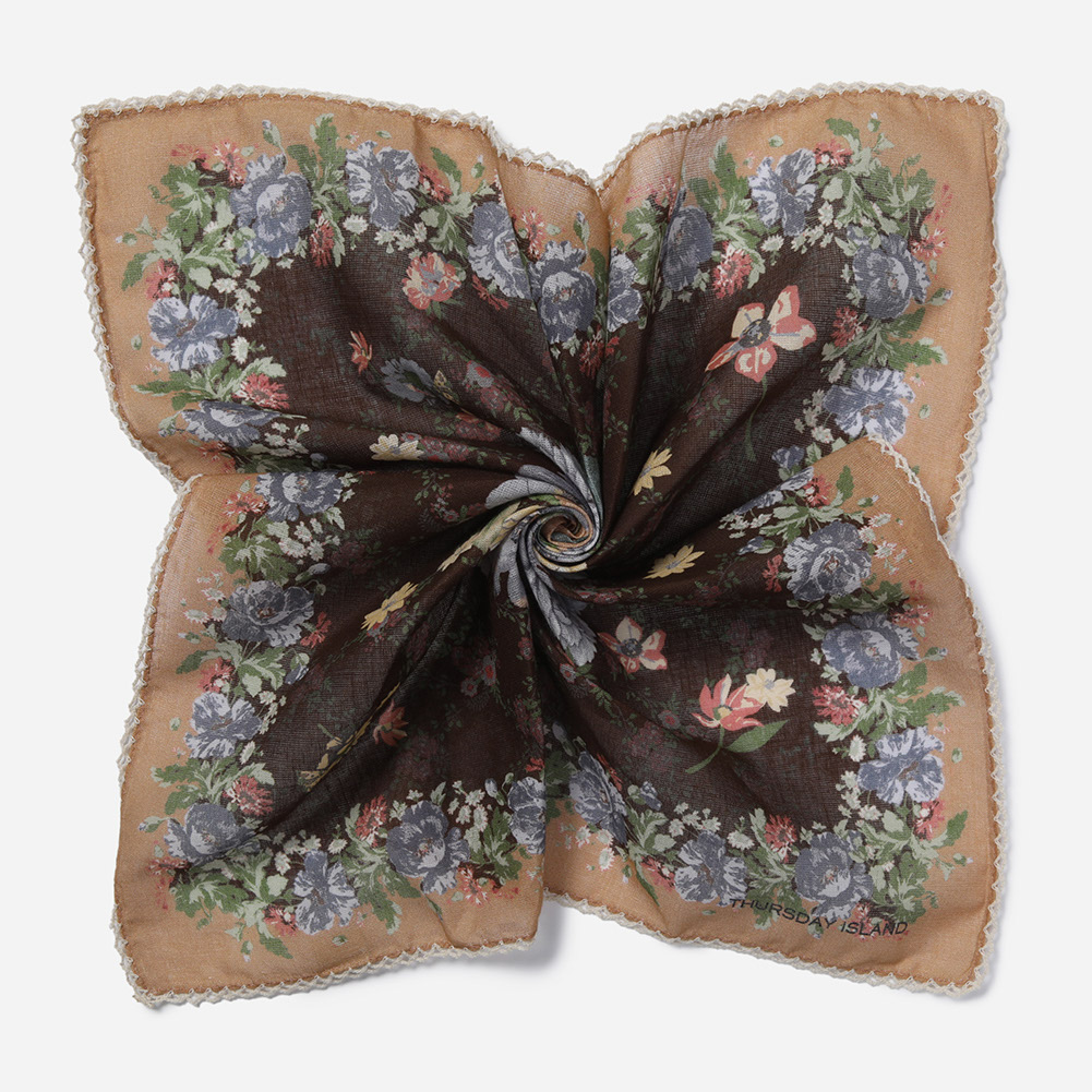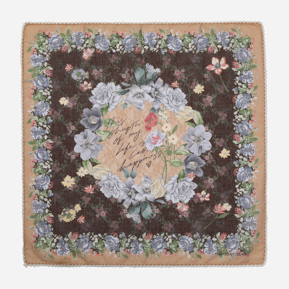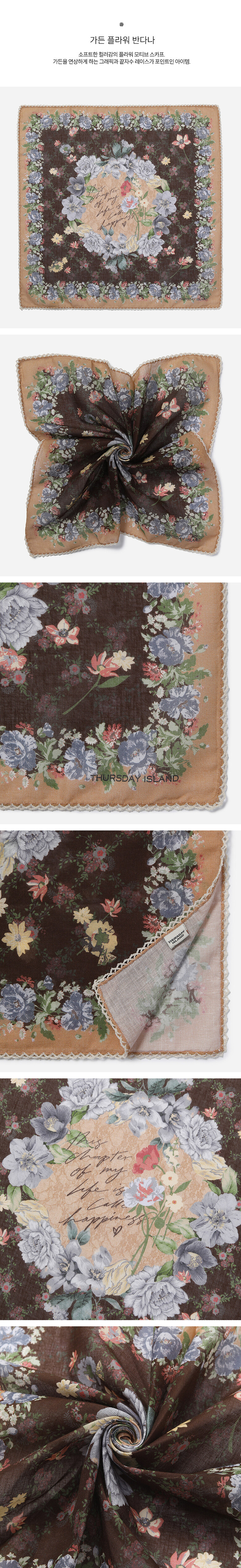 소프트한 컬러감의 플라워 모티브 스카프.가든을 연상하게 하는 그래픽과 끝자수 레이스가 포인트인 아이템.