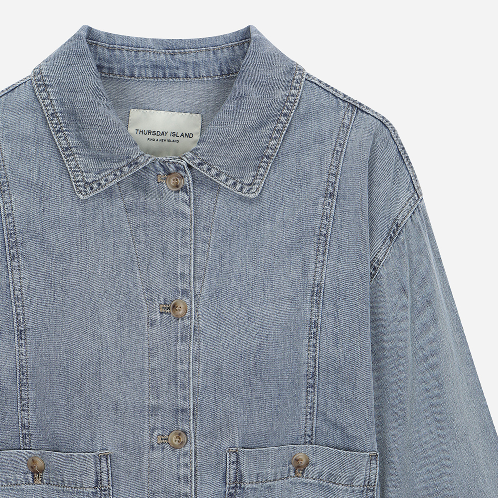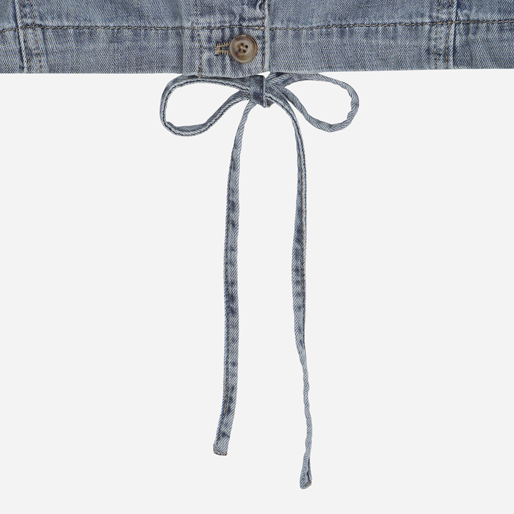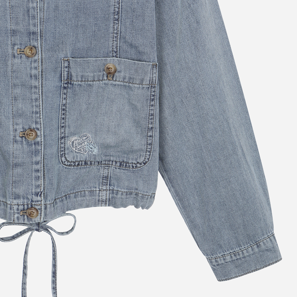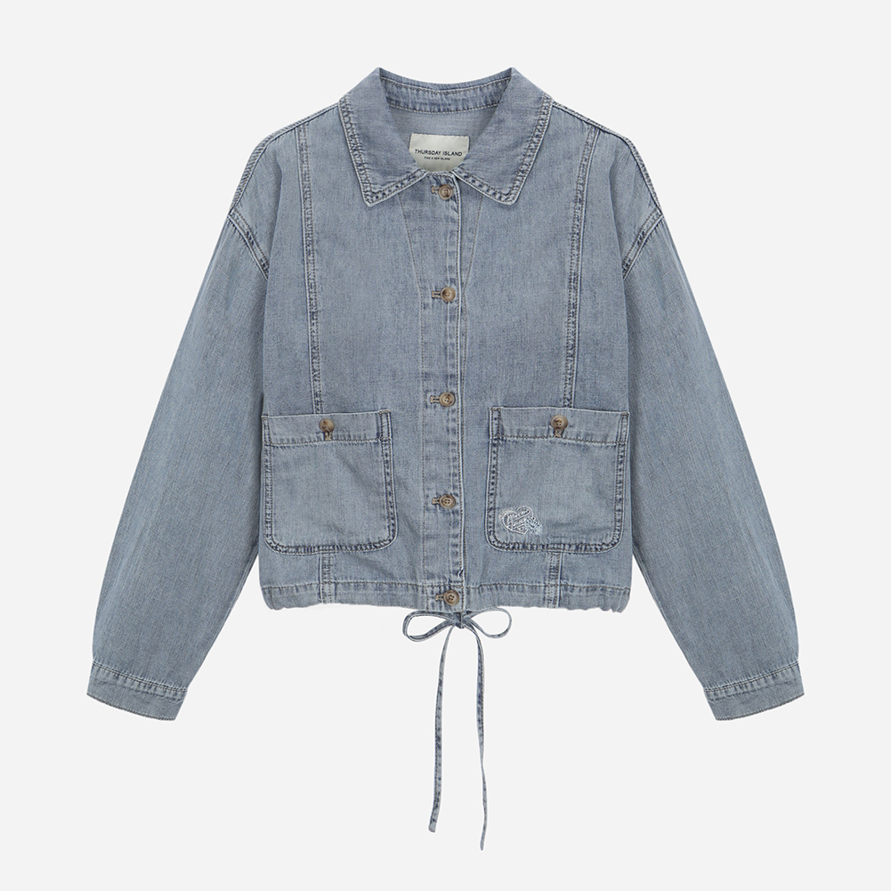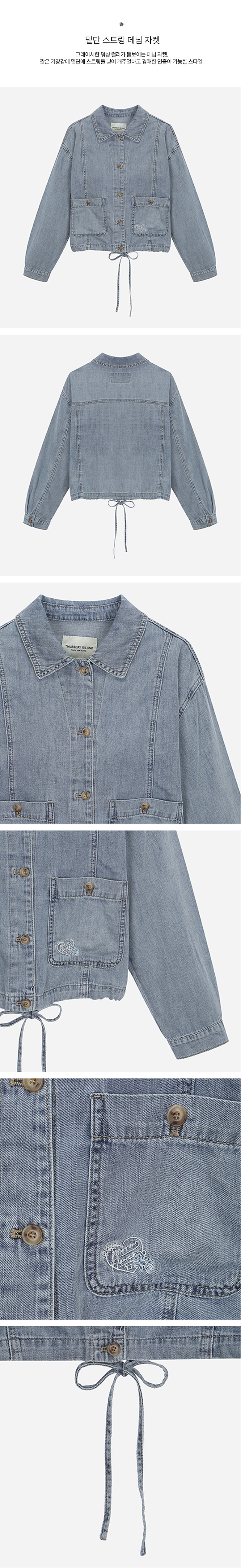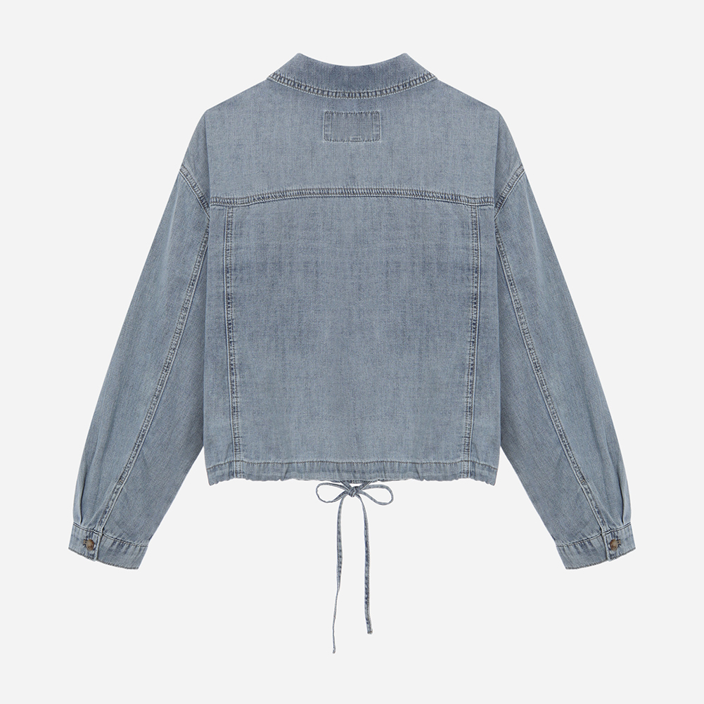 그레이시한 워싱 컬러가 돋보이는 데님 자켓.짧은 기장감에 밑단에 스트링을 넣어 캐주얼하고 경쾌한 연출이 가능한 스타일.