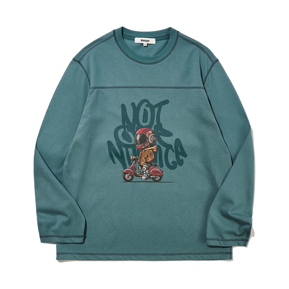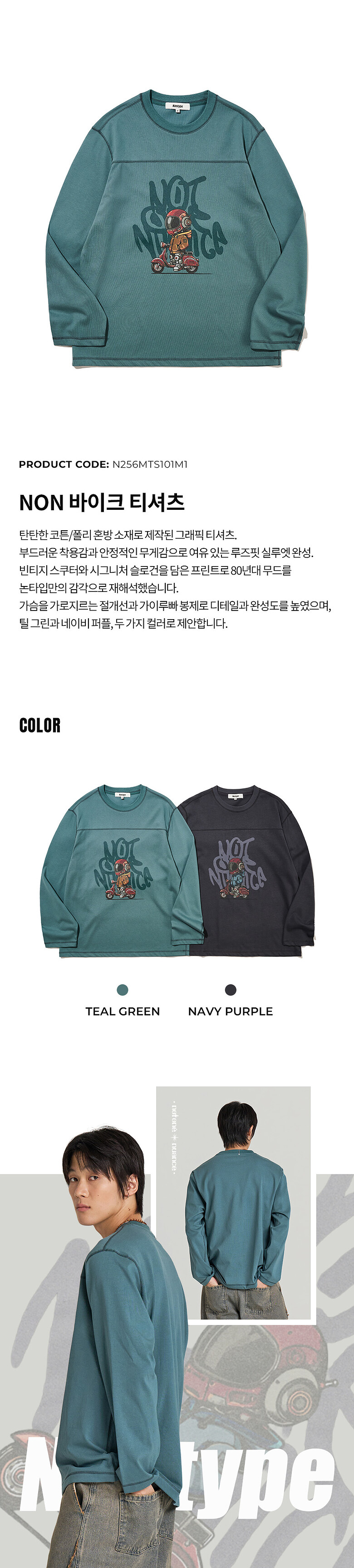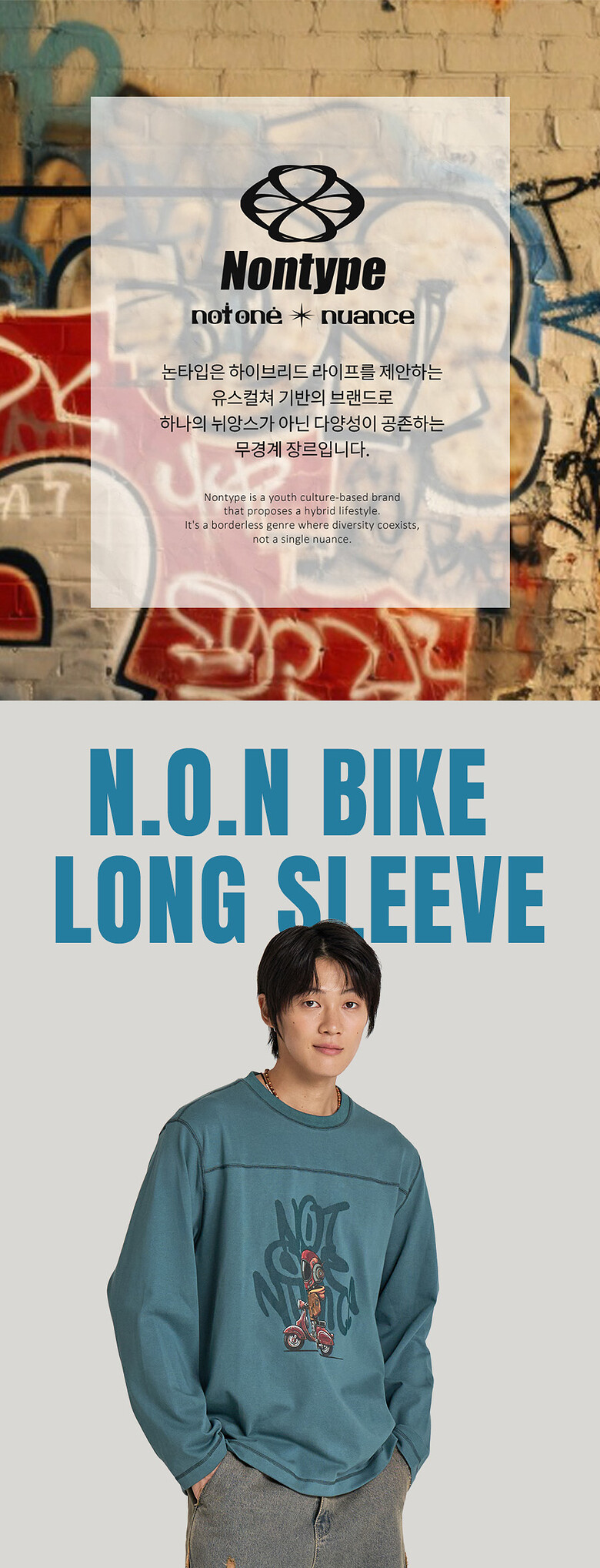 - 빈티지한 스쿠터와 시그니처 슬로건 일러스트로 80년대 무드를 논타입만의 프린트로 재해석한 아이템