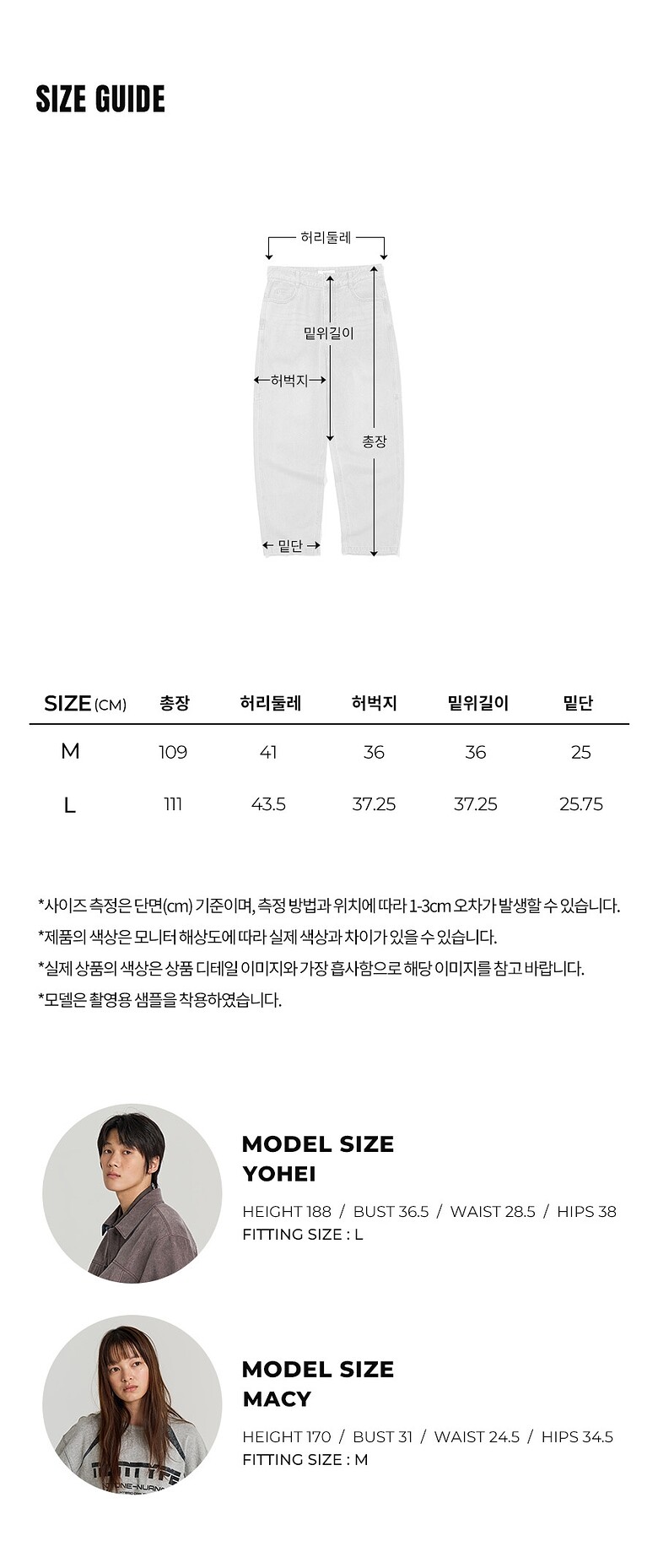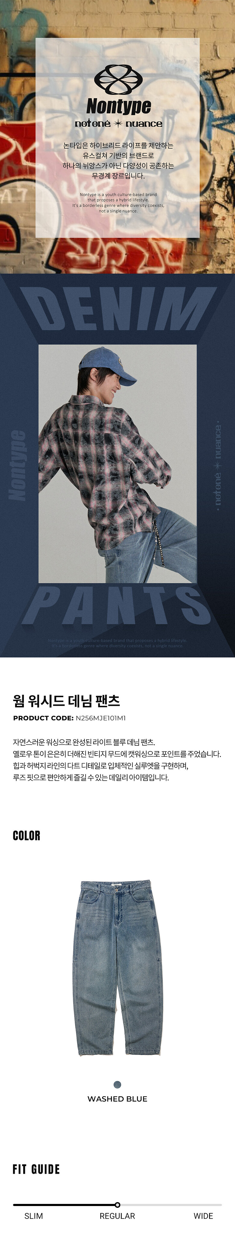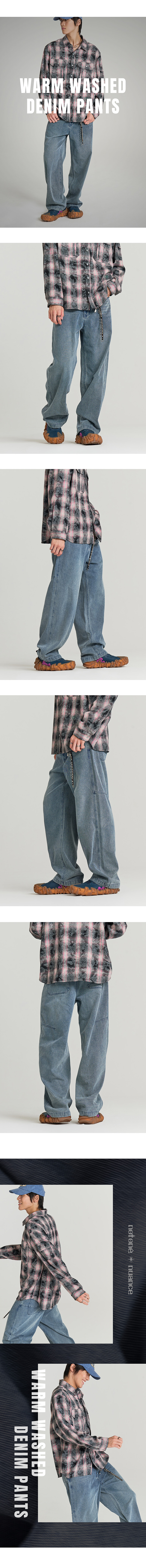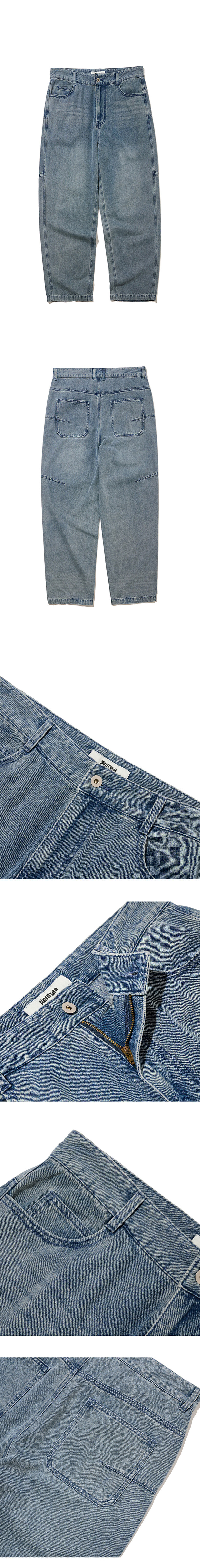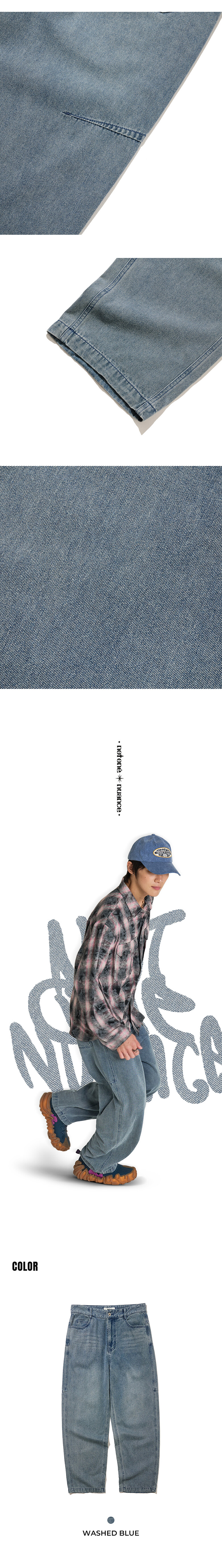 - 연한 옐로우 톤이 묻어나는 바랜듯한 빈티지한 무드에 캣워싱 가공을 통하여 은은한 포인트를 준 베이직 데님