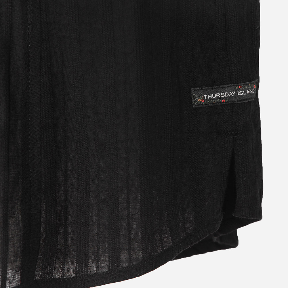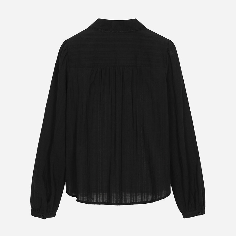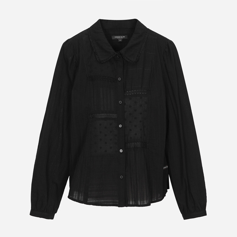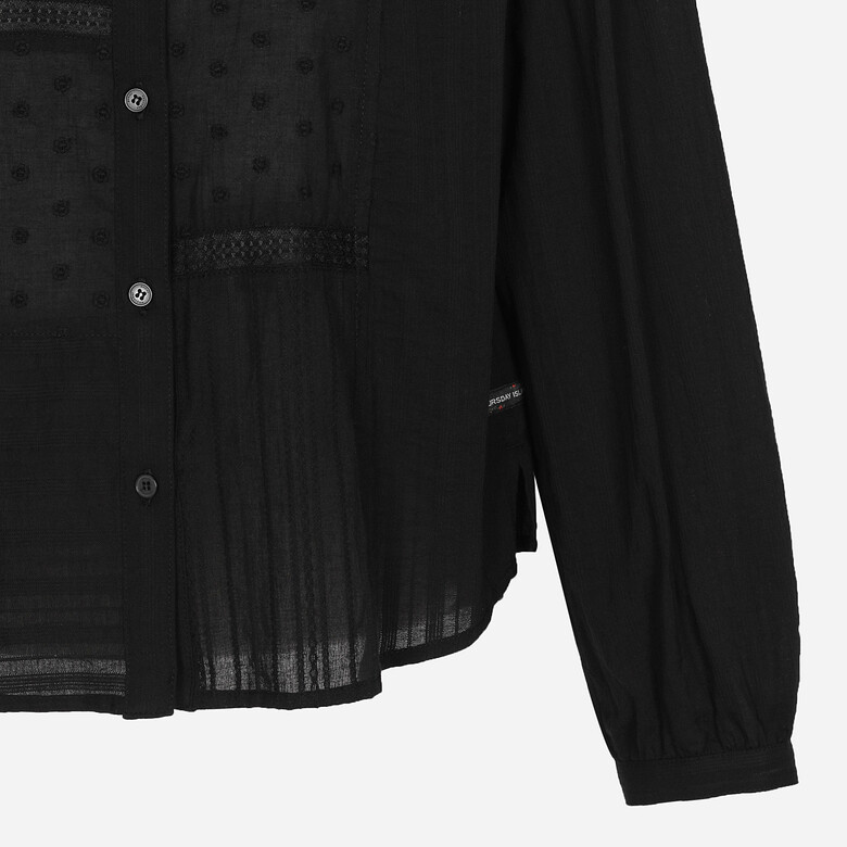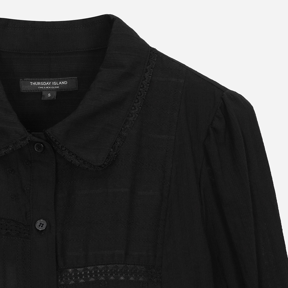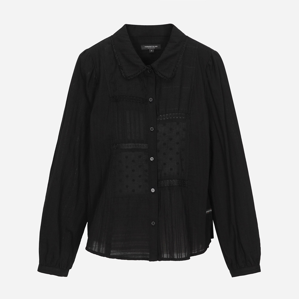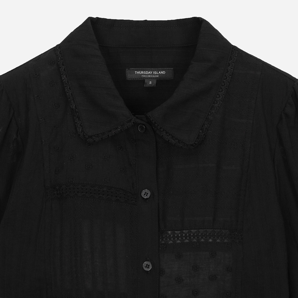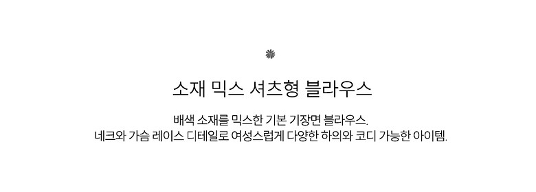 배색 소재를 믹스한 기본 기장 면 블라우스.네크와 가슴 레이스 디테일로 여성스럽게 다양한 하의와