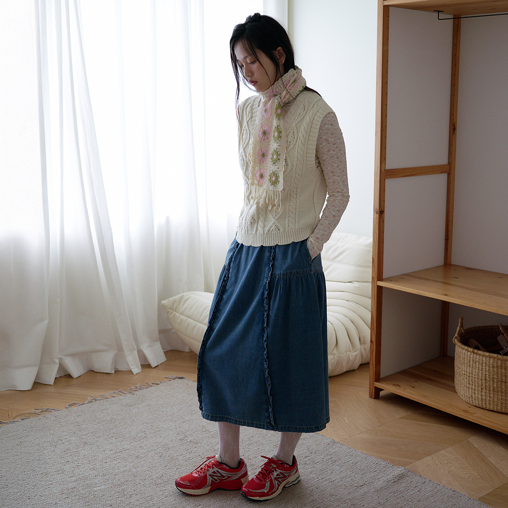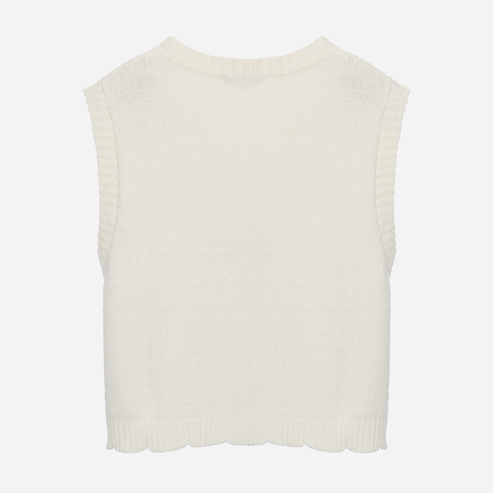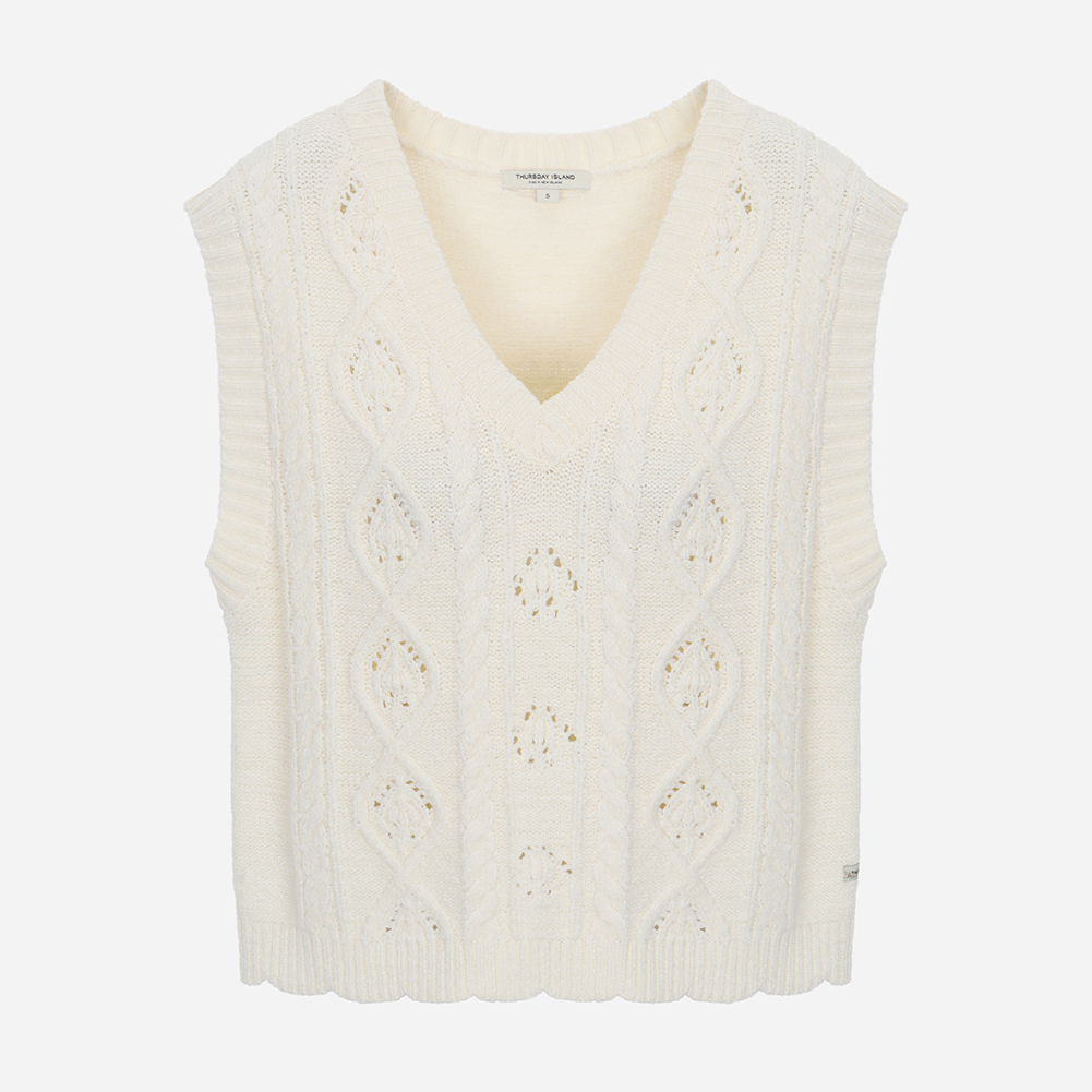 크로셰 조직과 케이블이 믹스되어 짜여진 브이넥 베스트.밑단에 여성스럽게 스칼럽 조직으로 마무리했으며,여유있는 실루엣으로 착용감이 편한 아이템.