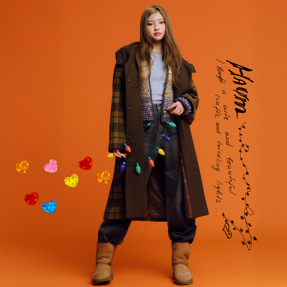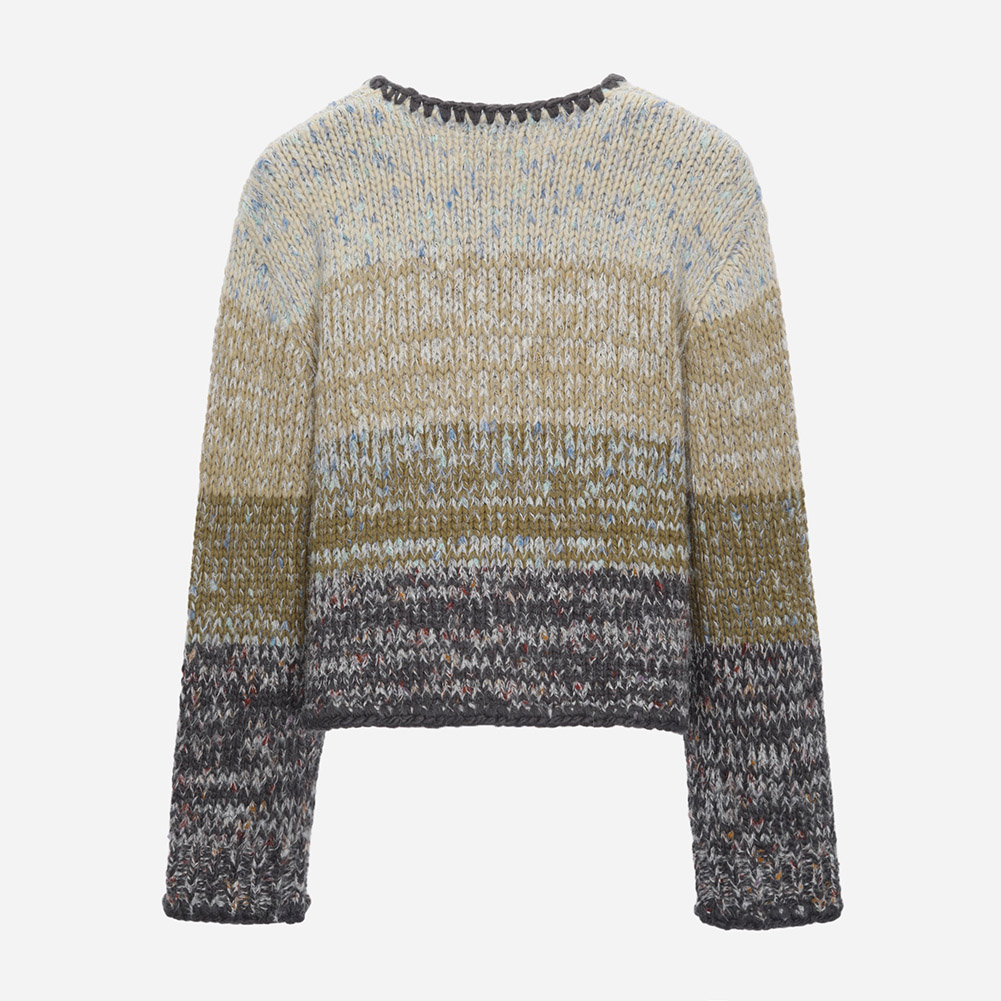 넥과 앞마이에 손뜨개 디테일이 포인트인 스타일.