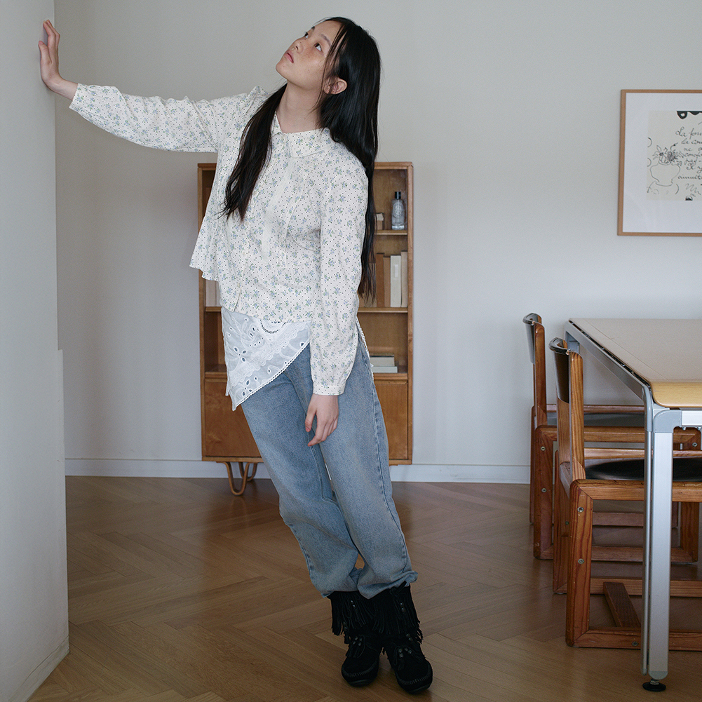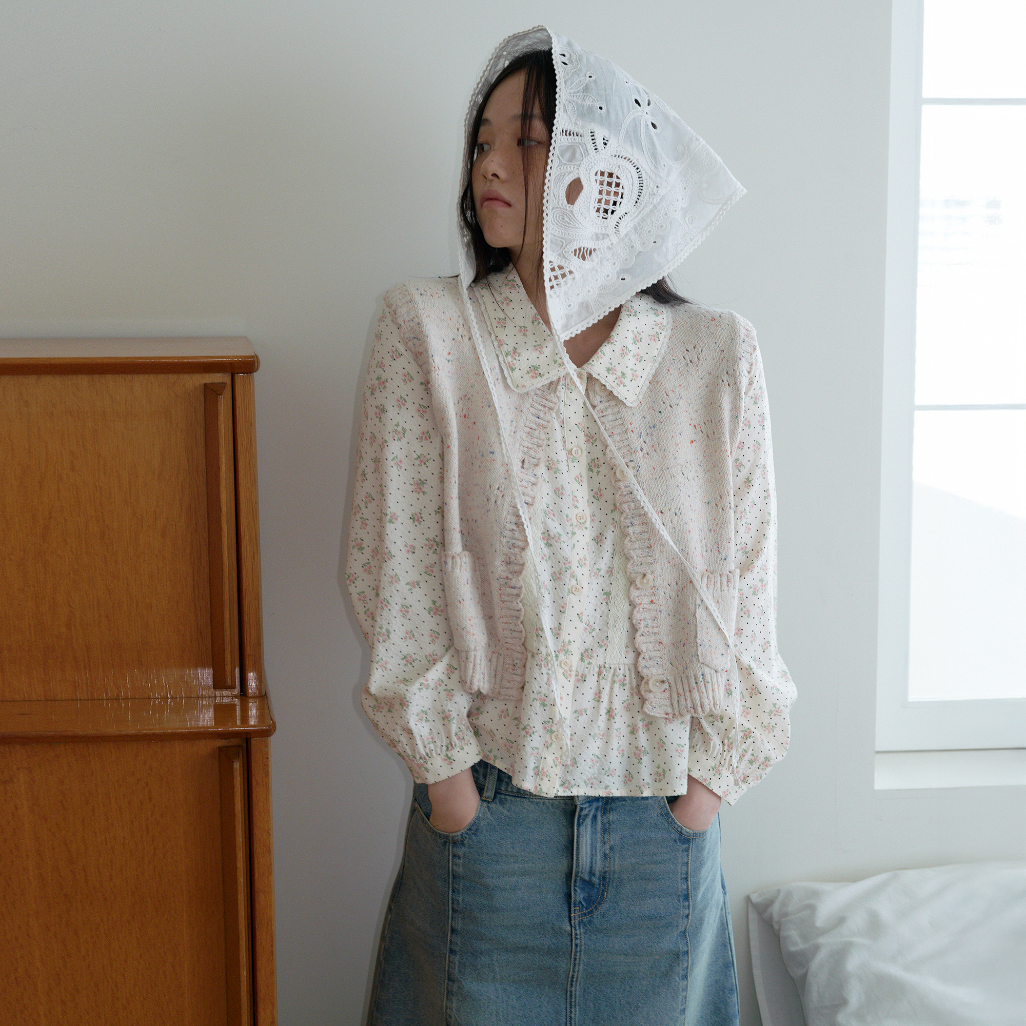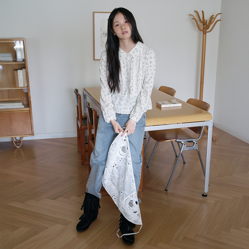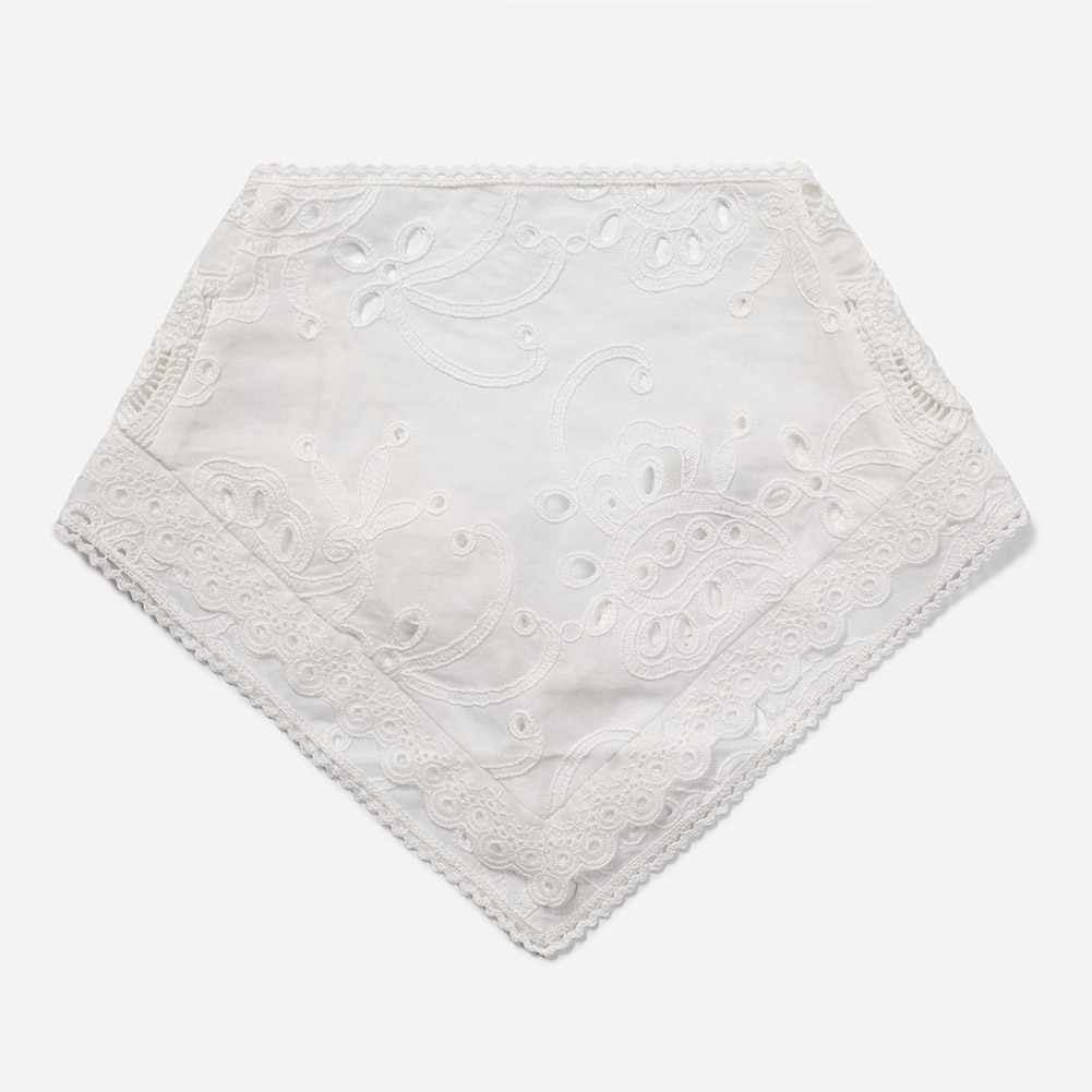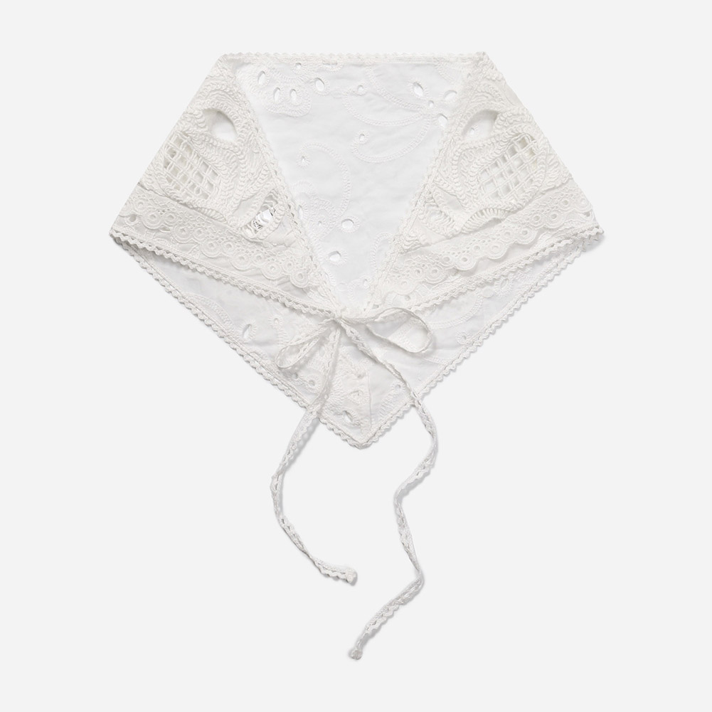 플로럴 무드의 아일렛 면 원단과 레이스 소재를 패치하여 유니크한 스타일의 스카프.다양한 코디에 레이어드하기 좋은 아이템.