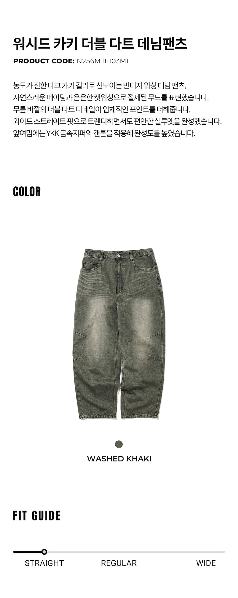 - 오묘한 카키 컬러에 자연스럽게 페이딩되는 워싱효과 연출
