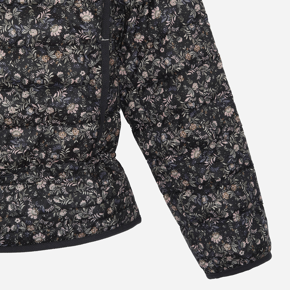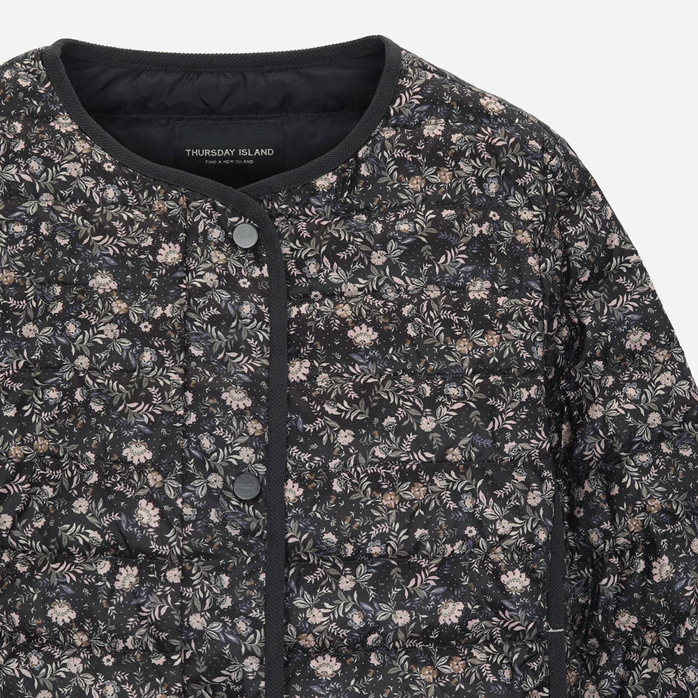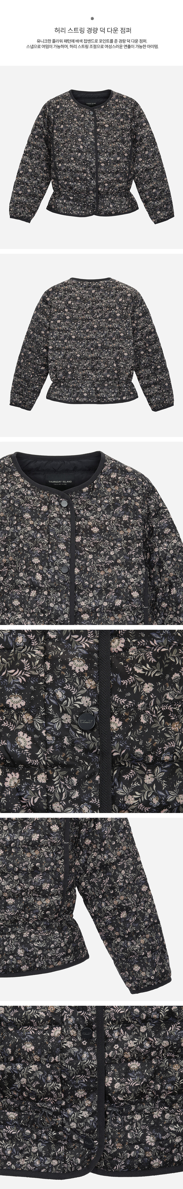 유니크한 플라워 패턴에 배색 접밴드로 포인트를 준 경랑 덕 다운 점퍼.