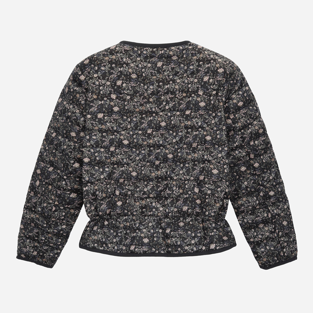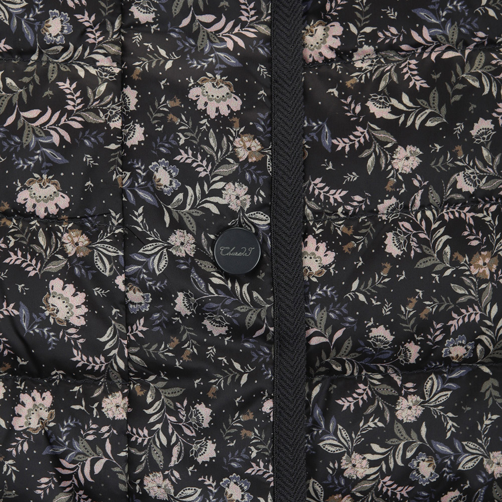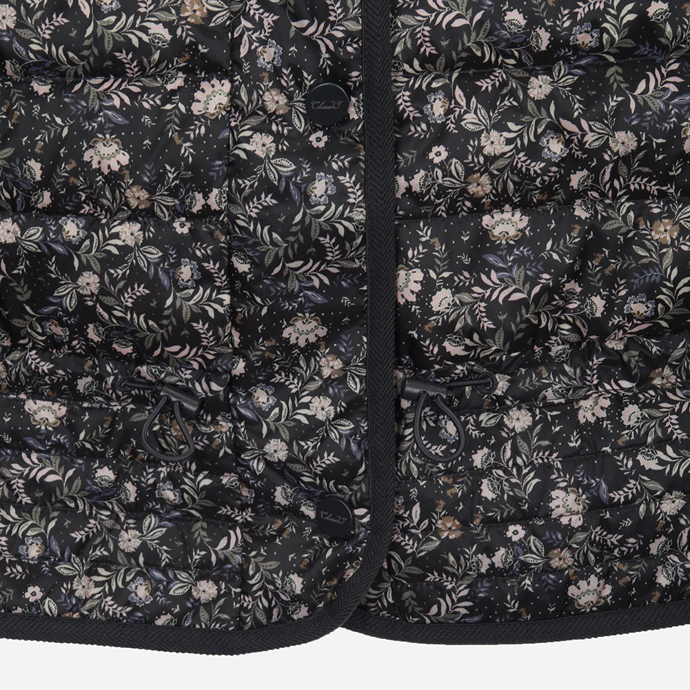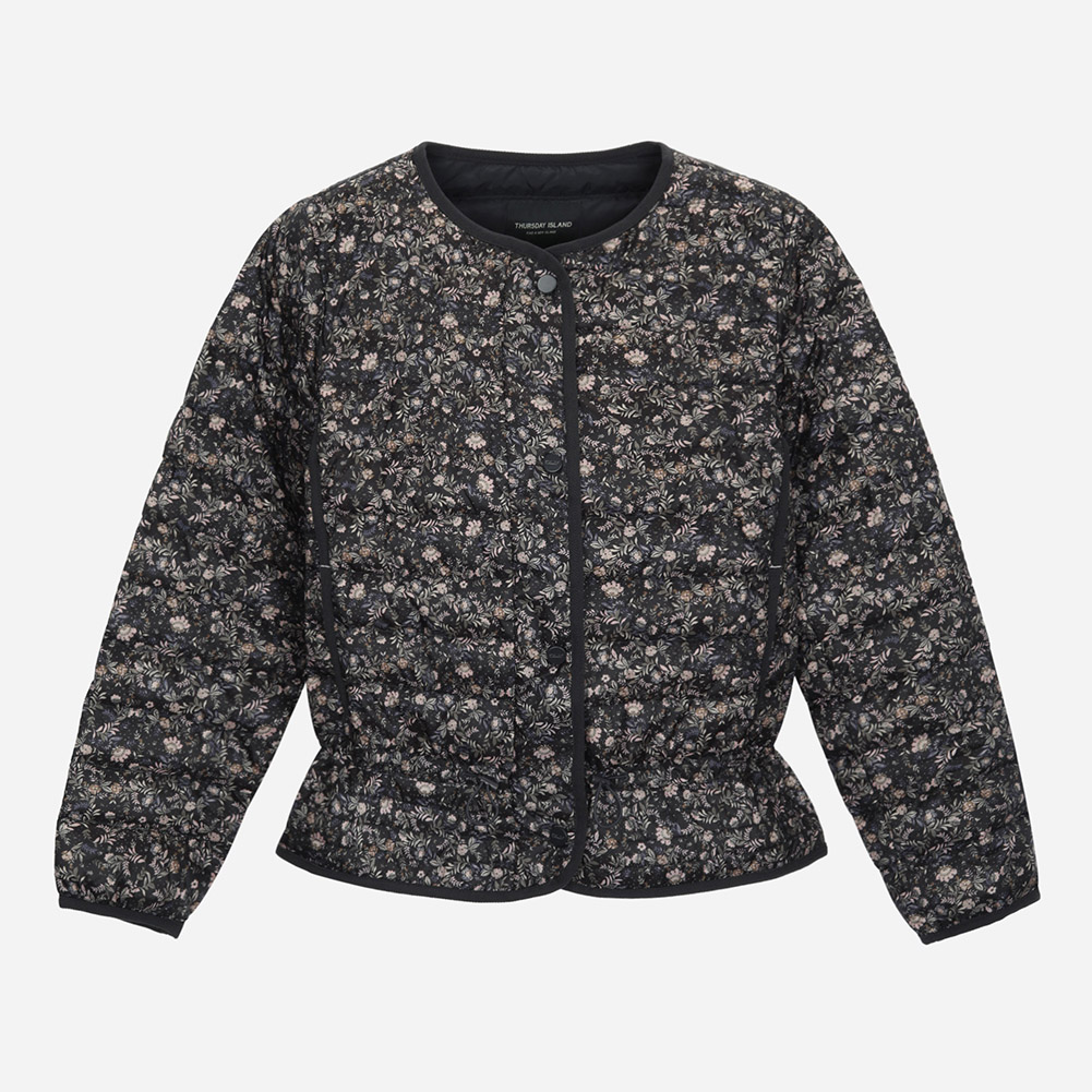 유니크한 플라워 패턴에 배색 접밴드로 포인트를 준 경랑 덕 다운 점퍼.