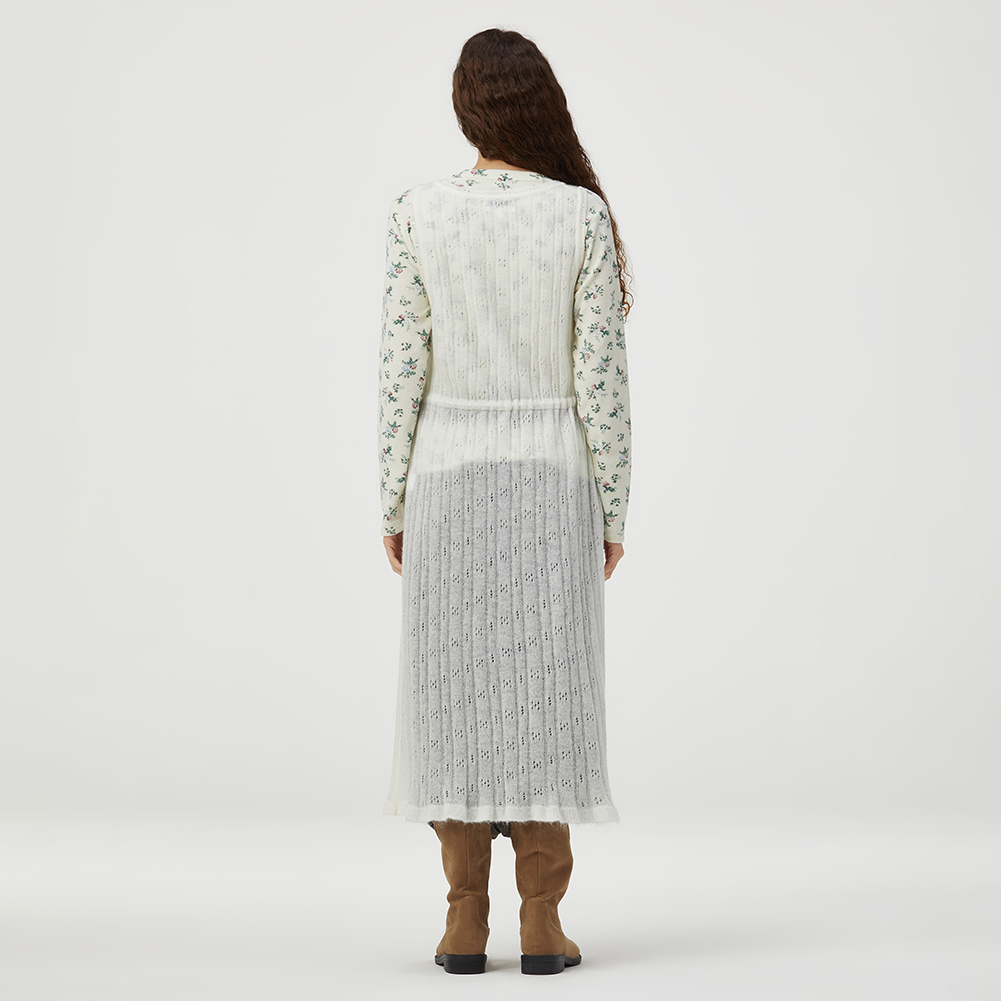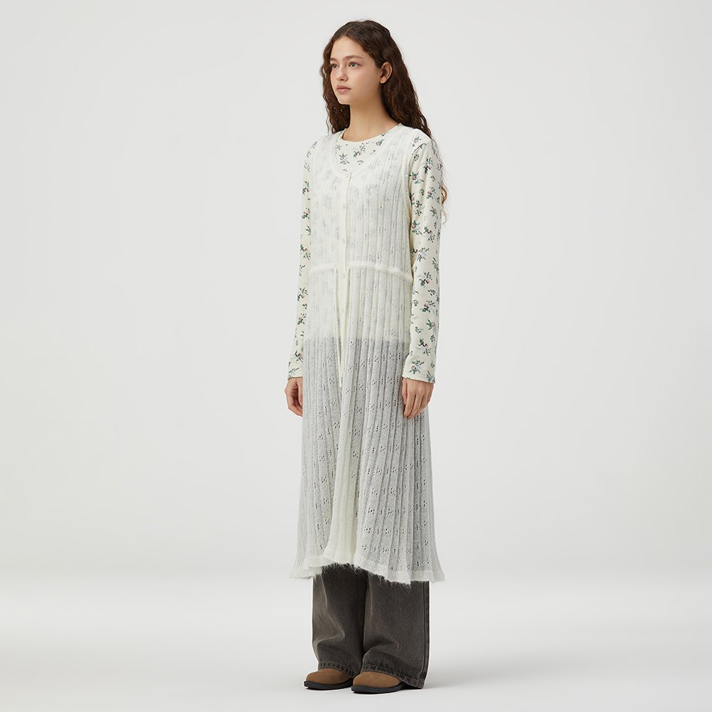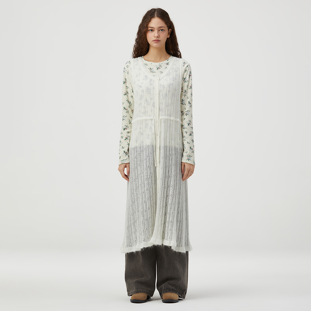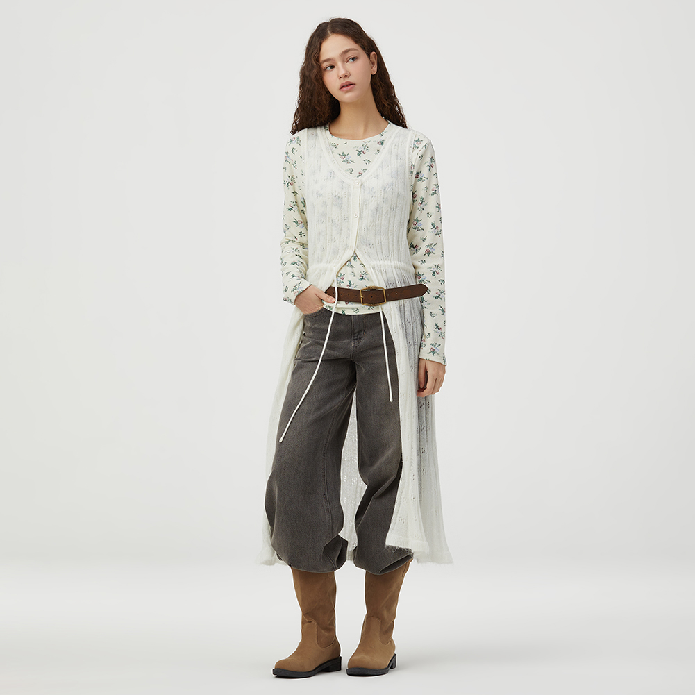 허리 스트링으로 다양한 스타일링을 할 수 있으며 풀오픈 베스트로도 연출 가능한 아이템.