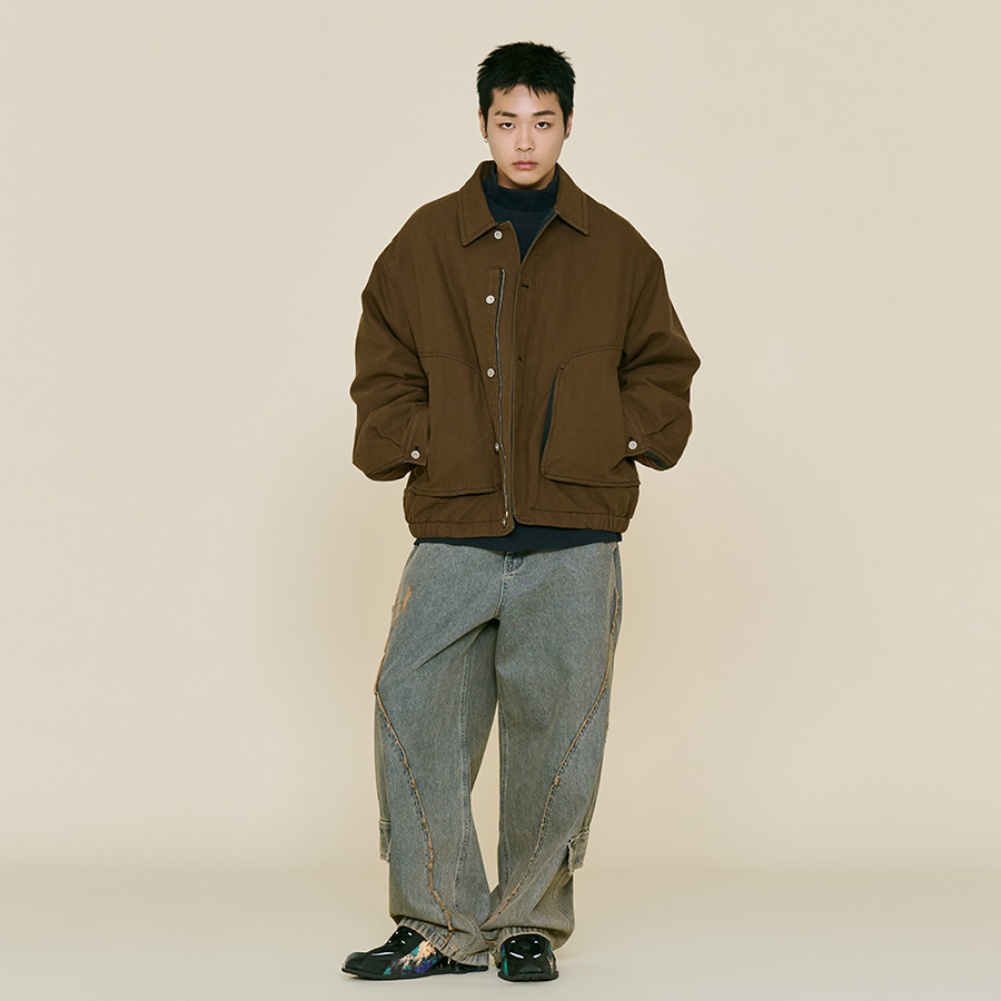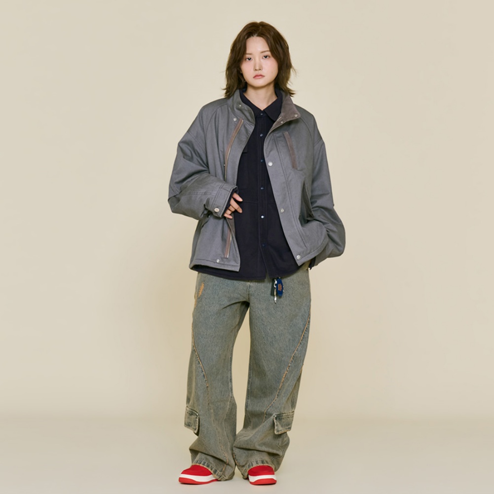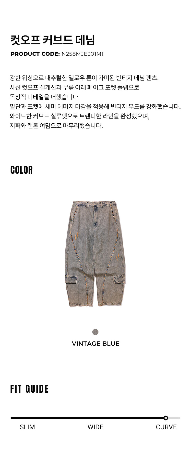 - 사선으로 내려오는 러프한 컷오프 곡선 절개선으로 포인트를 준 아이템