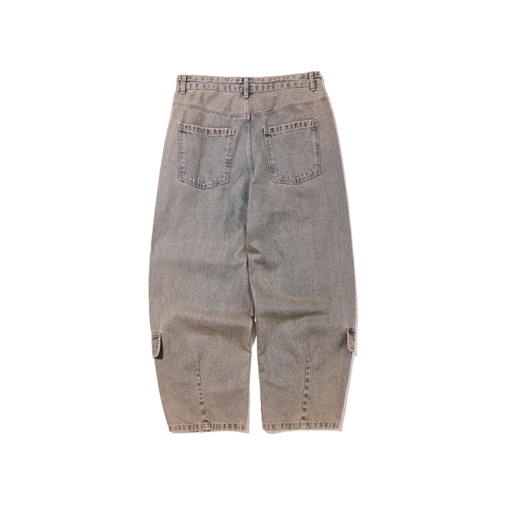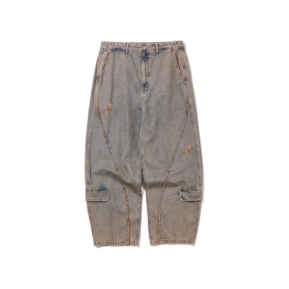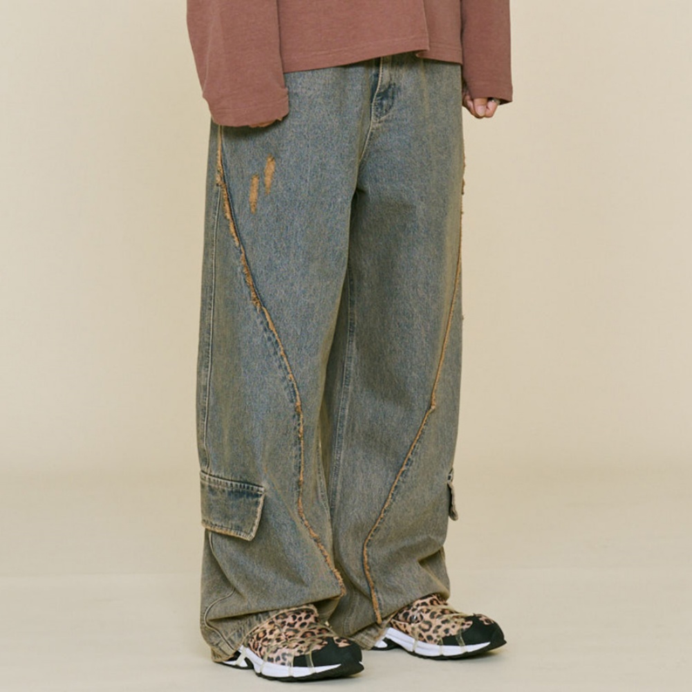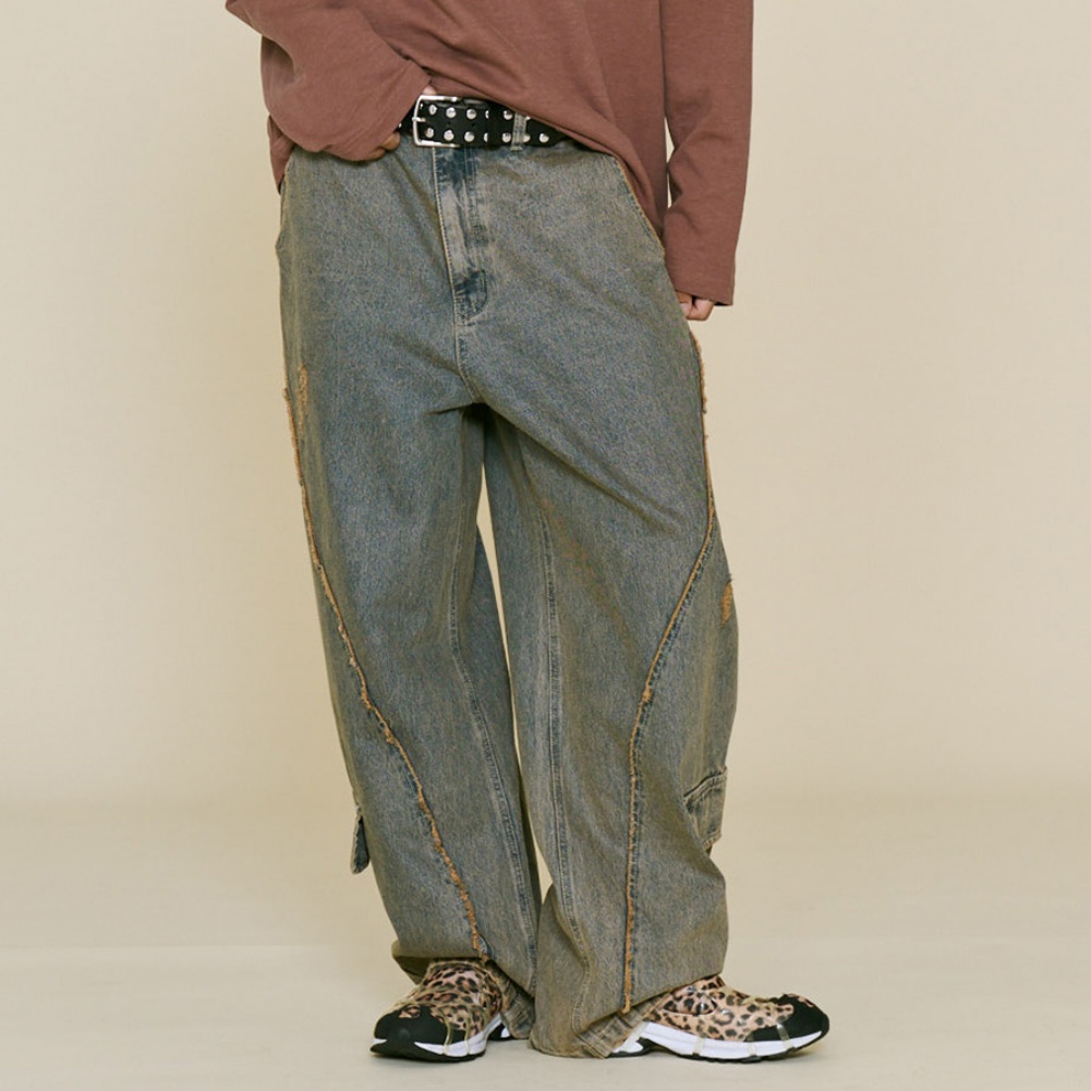 - 강한 워싱으로 내추럴한 옐로우톤이 가미된 빈티지 무드로 제작된 데님 팬츠