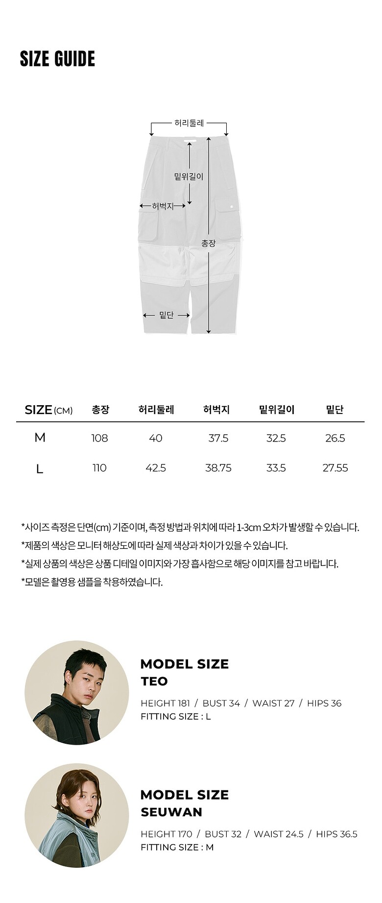 | 사이즈 | 허리둘레 | 엉덩이둘레 | 허벅지둘레 | 밑위길이 | 밑단둘레 | 총길이 |