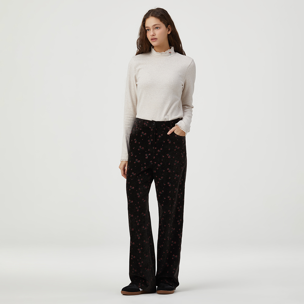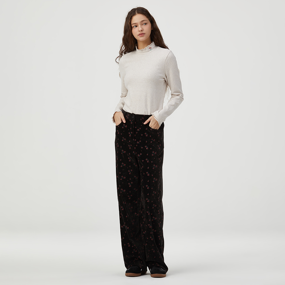 뒤 허리밴딩이 내장되어 편안하게 착용가능하며 잔잔한 플라워 패턴이 귀여운 아이템.