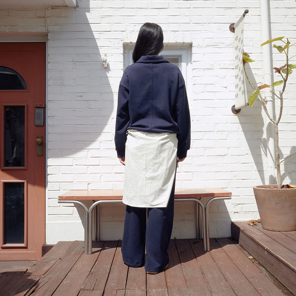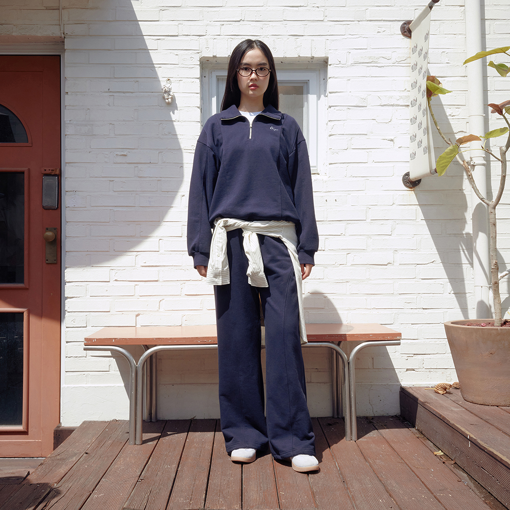 허리 밴딩으로 편안하게 연출 가능하며 절개라인과 자수로 포인트를 준 스타일.