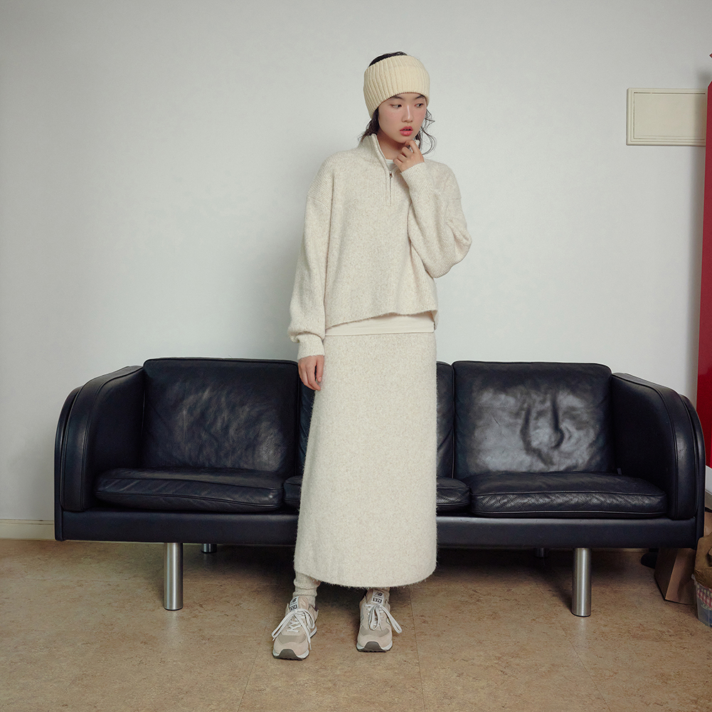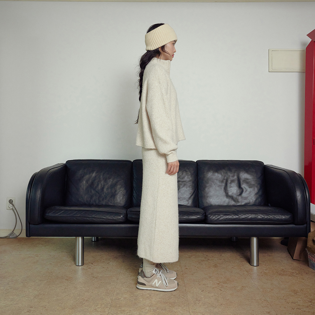 여유있는 실루엣과 따뜻한 컬러감이 여성스러운 스타일.