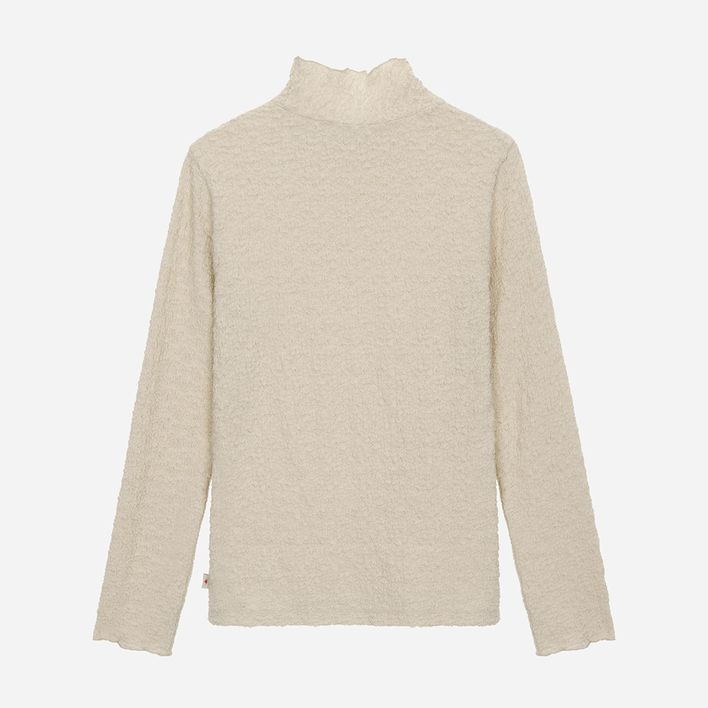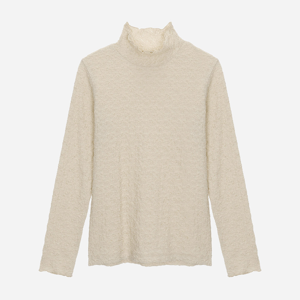 네크와 소매단을 인타록 디테일로 깔끔하게 마감하였고이너로 활용도가 높은 아이템.