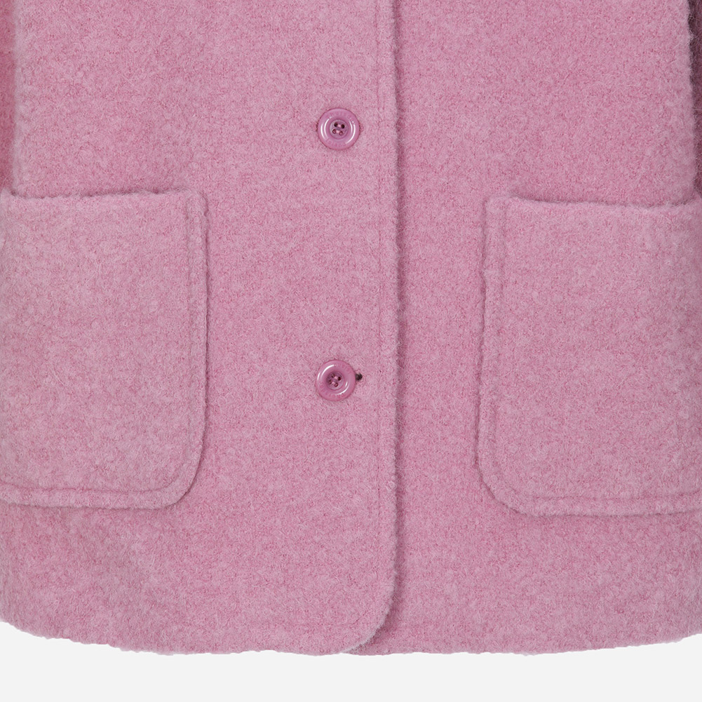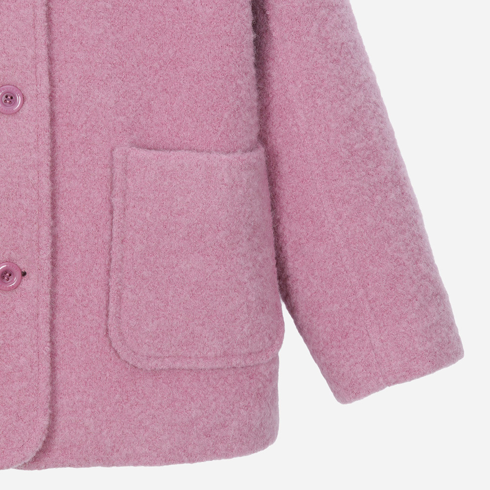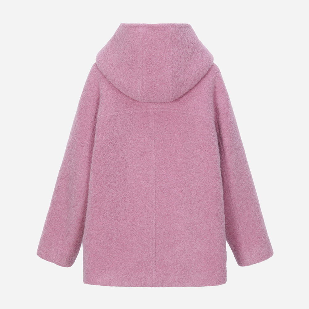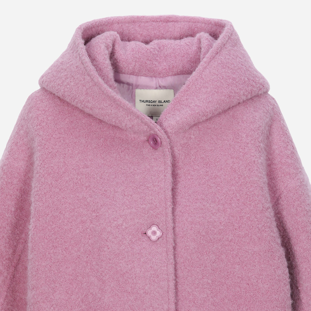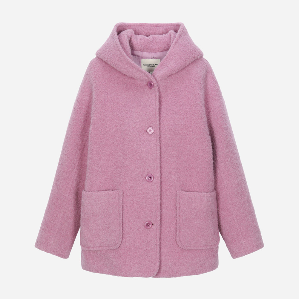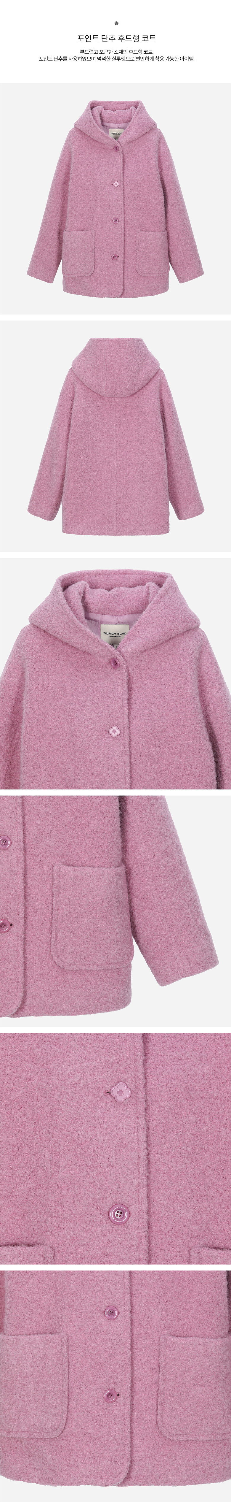 부드럽고 포근한 소재의 후드형 코트.포인트 단추를 사용하였으며 넉넉한 실루엣으로 편안하게 착용 가능한 아이템.