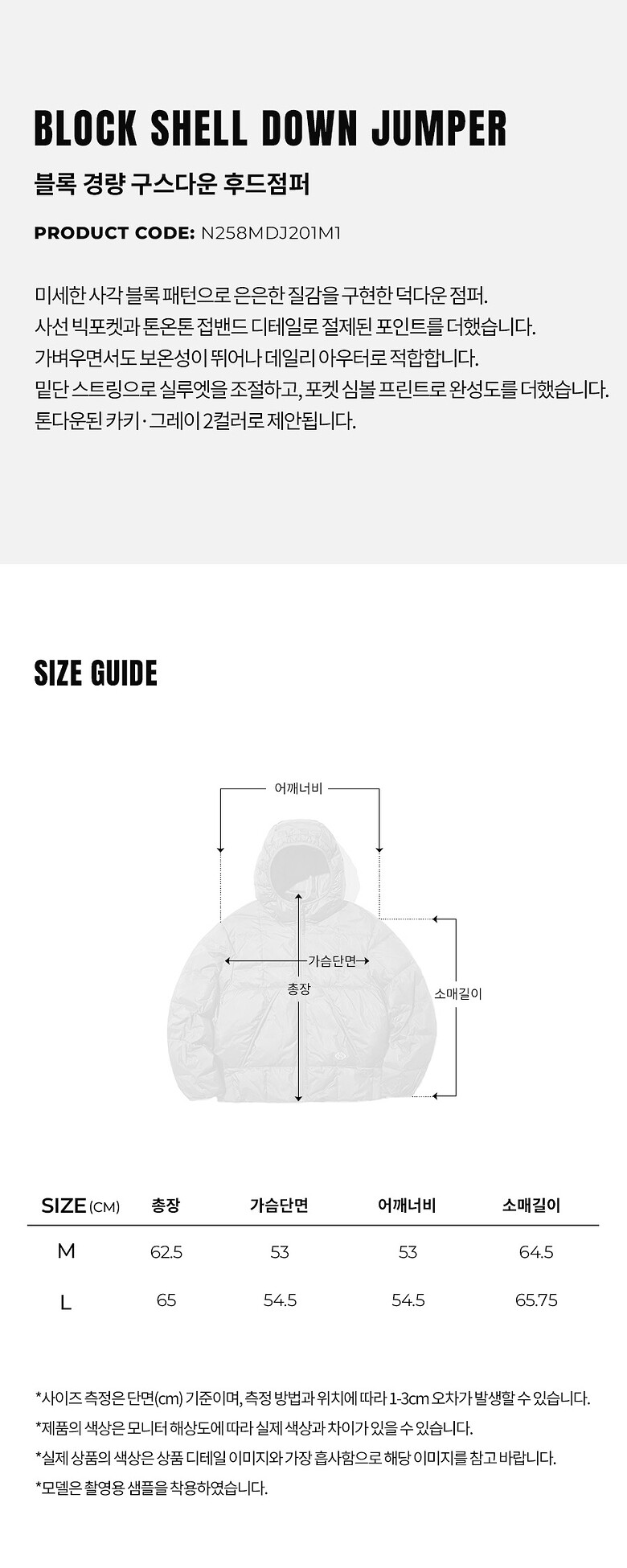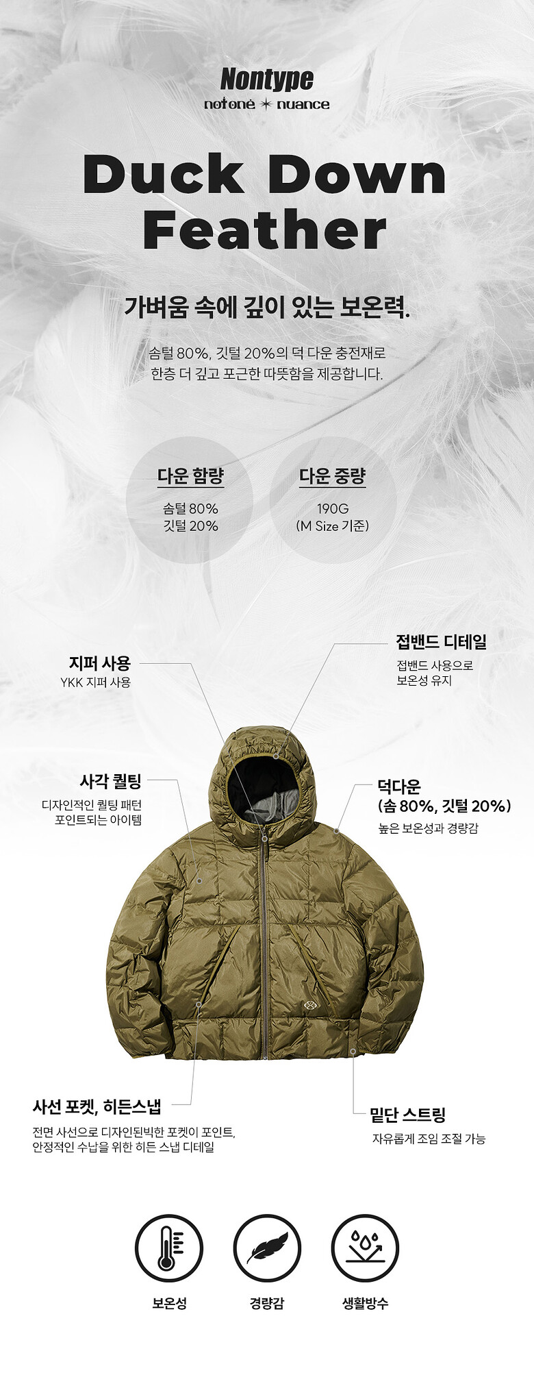 카키 : 겉감 폴리에스터100%, 안감 폴리에스터100%, 충전재1 오리털(솜털)80%, 오리털(깃털)20%, 충전재2 폴리에스터100%