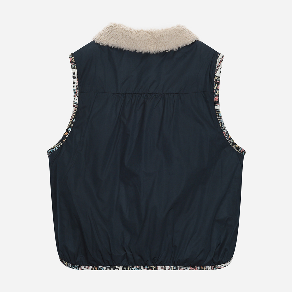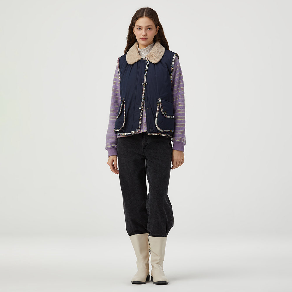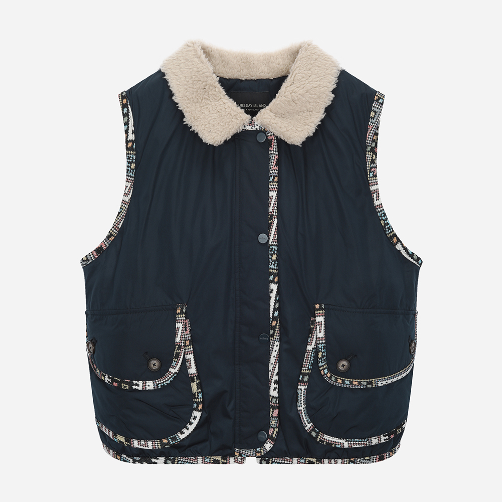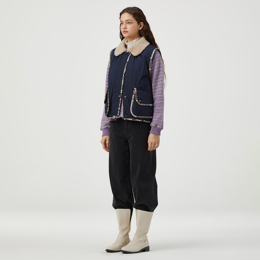 부클 소재의 페이크 퍼 카라와 패턴 배색 트리밍 장식이 포인트인 베스트.하스 솜이 내장되어 보온성을 주며 볼드한 아웃포켓이 귀여움과 캐주얼한 무드를 주는 아이템.