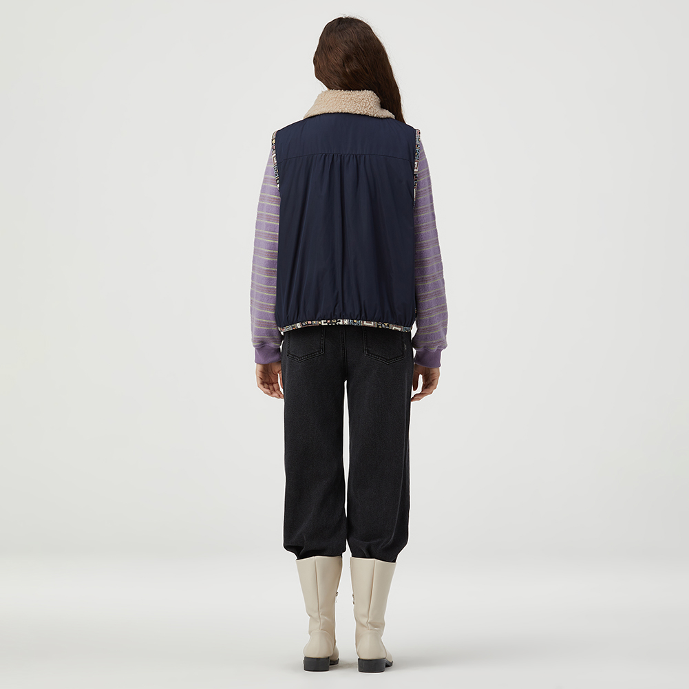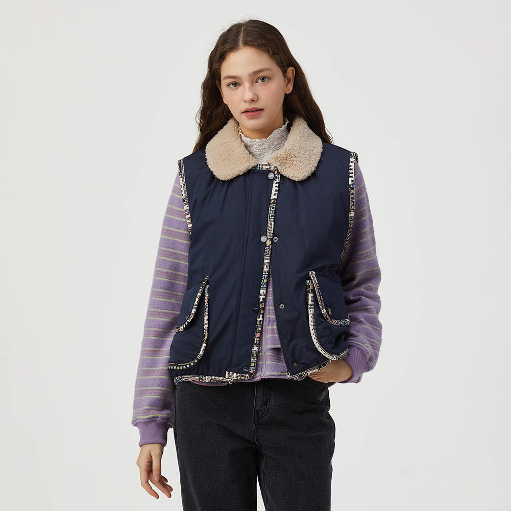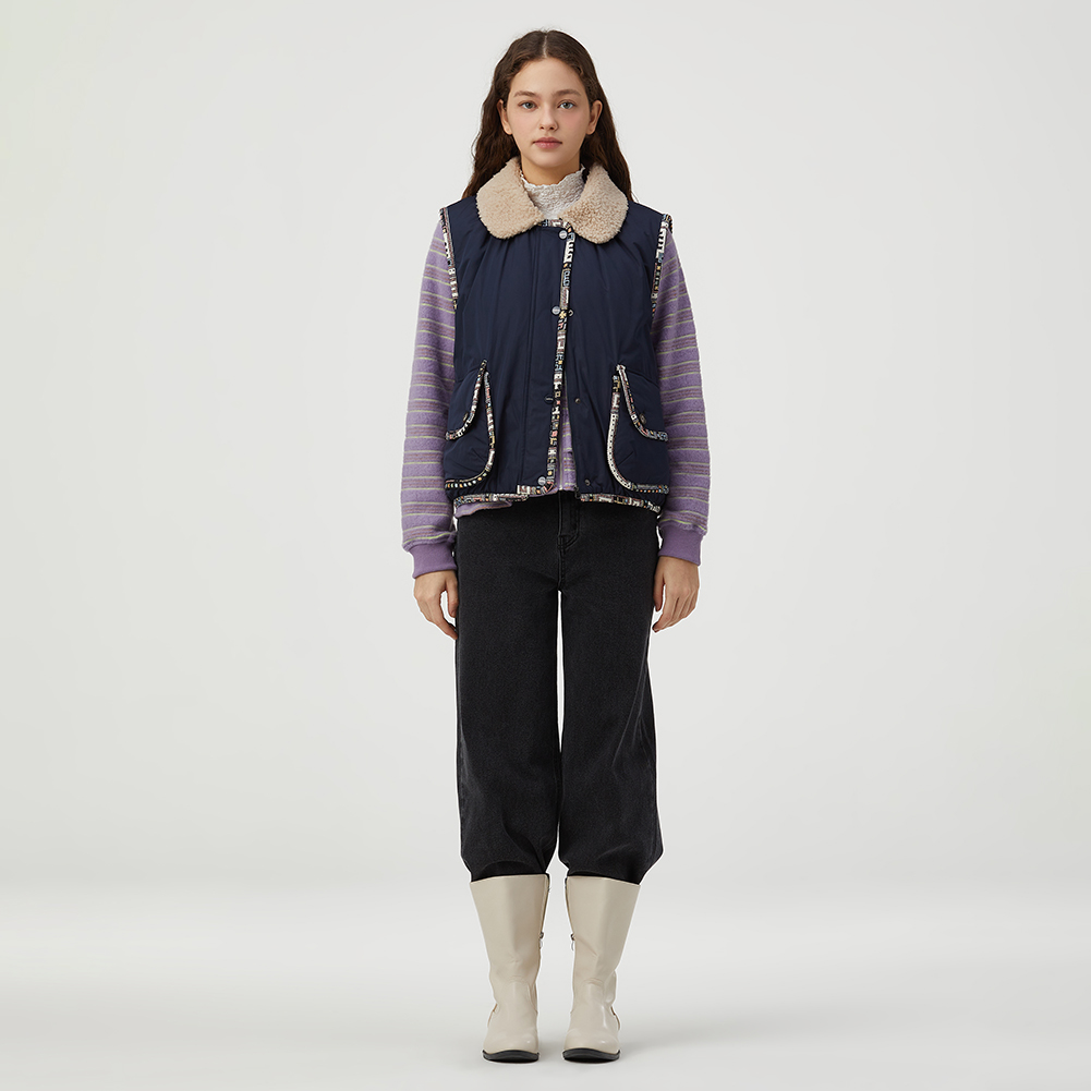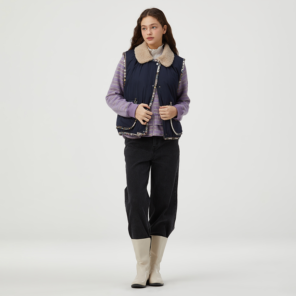 부클 소재의 페이크 퍼 카라와 패턴 배색 트리밍 장식이 포인트인 베스트.하스 솜이 내장되어 보온성을 주며 볼드한 아웃포켓이 귀여움과 캐주얼한 무드를 주는 아이템.