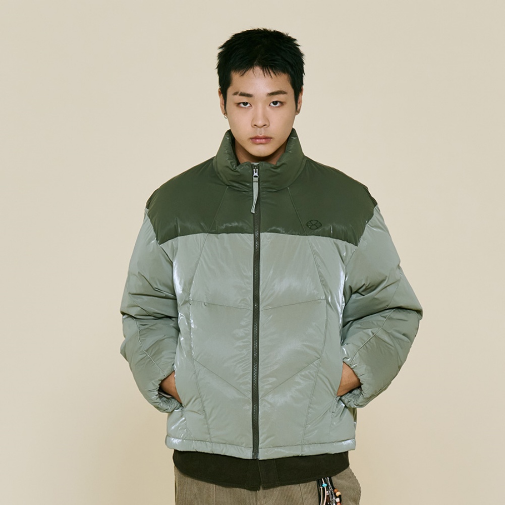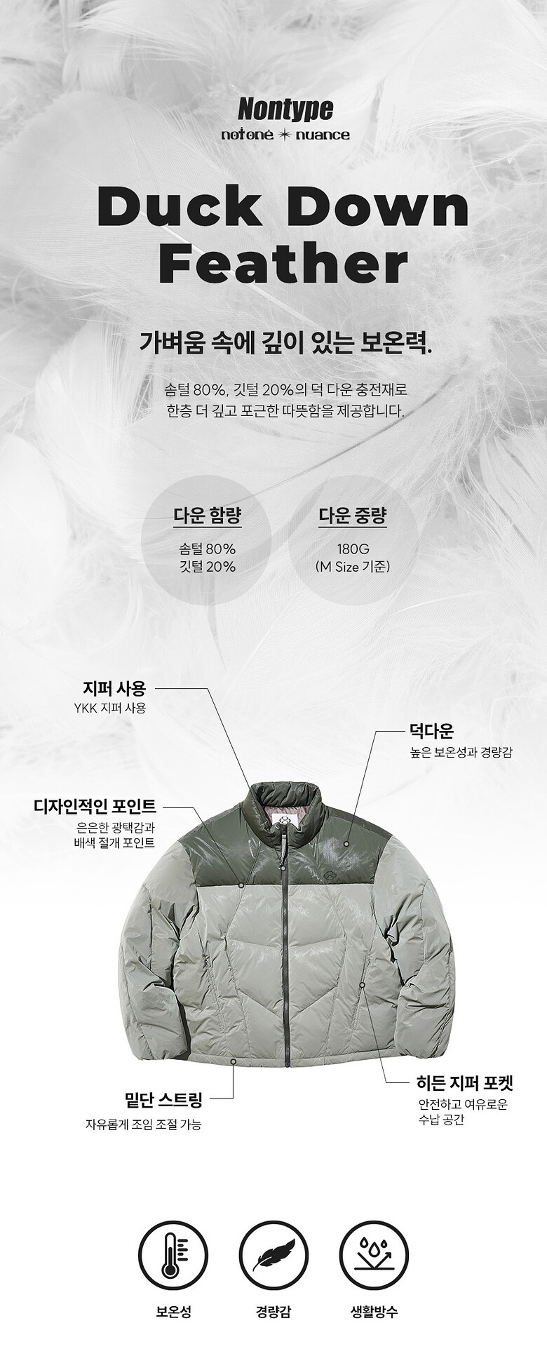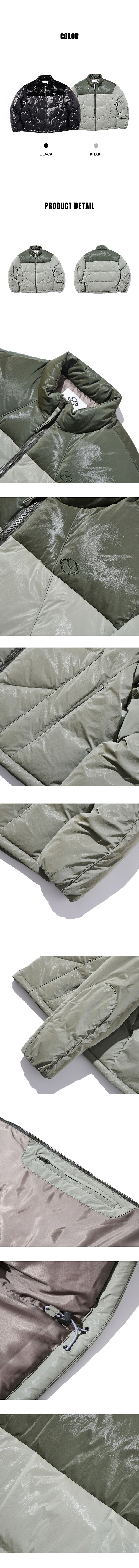 카키 : 겉감 나일론100%, 배색 나일론100%, 안감 폴리에스터100%, 충전재 오리털(솜털)80%, 오리털(깃털)20%
