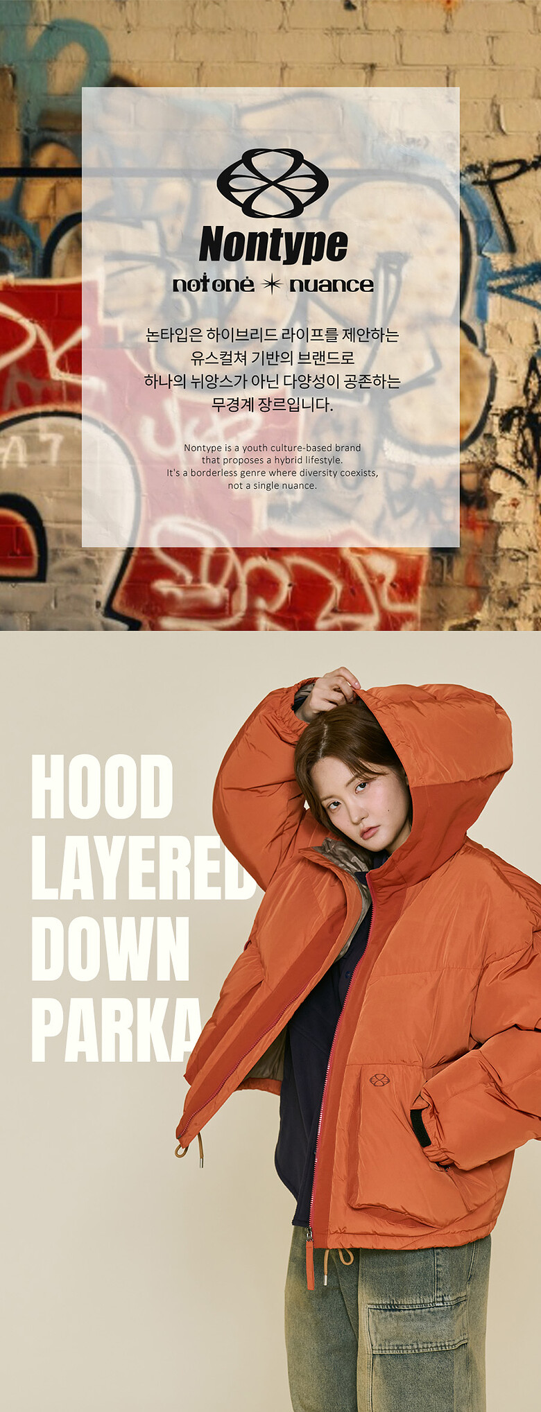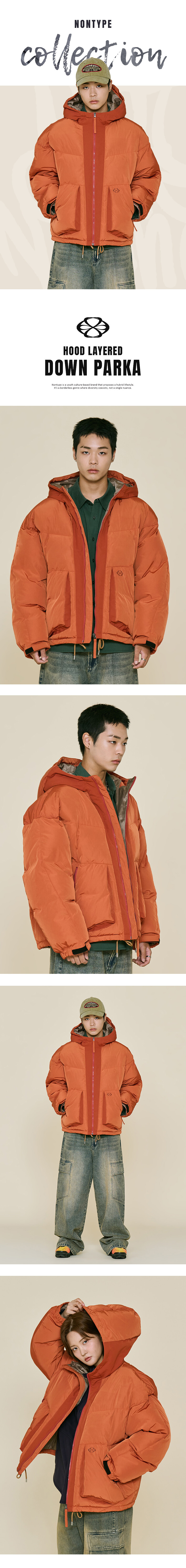 - 후드에서부터 레이어드된 듯한 톤온톤 브릭 세로사선 배색으로 디자인 포인트를 준 아이템
