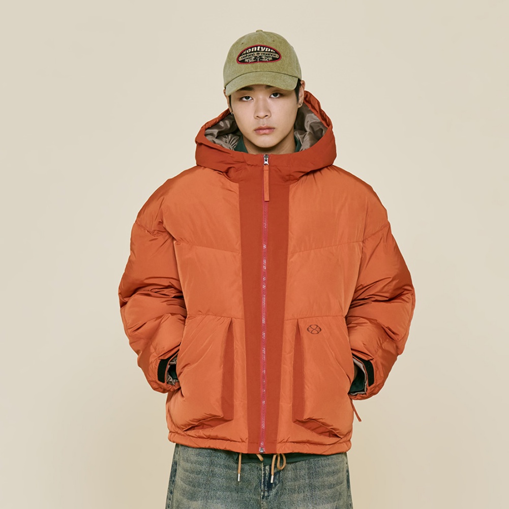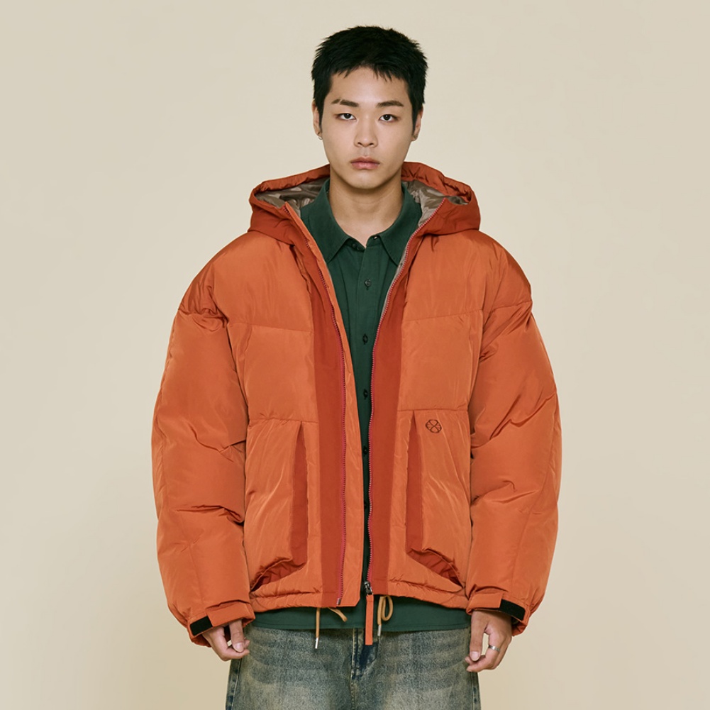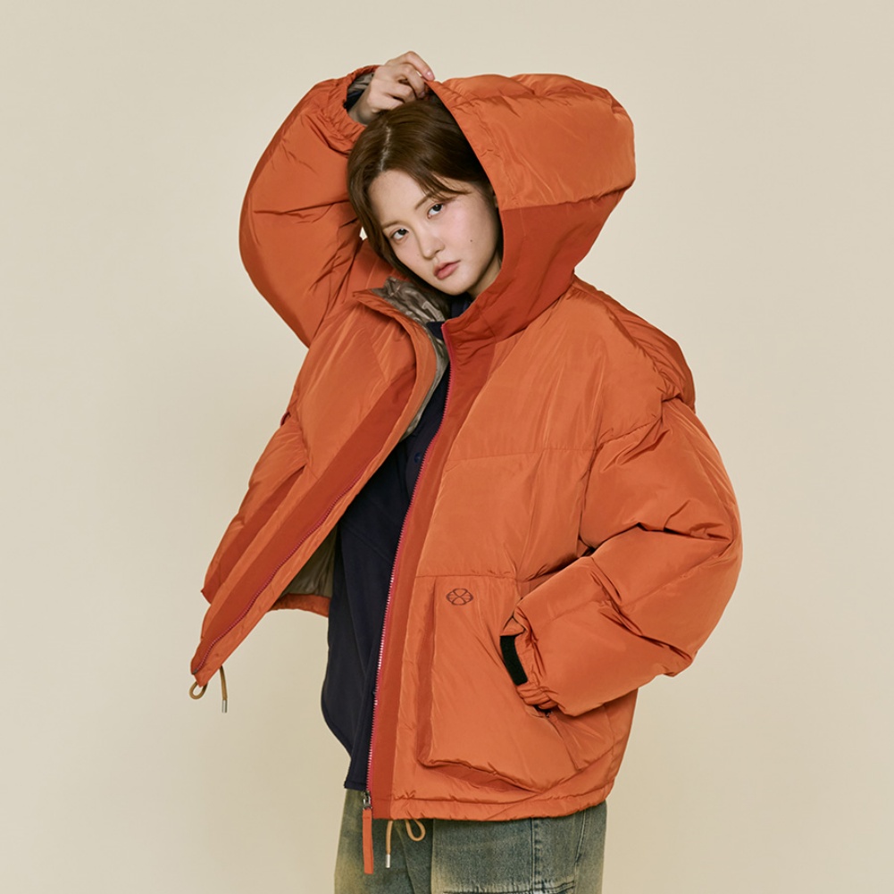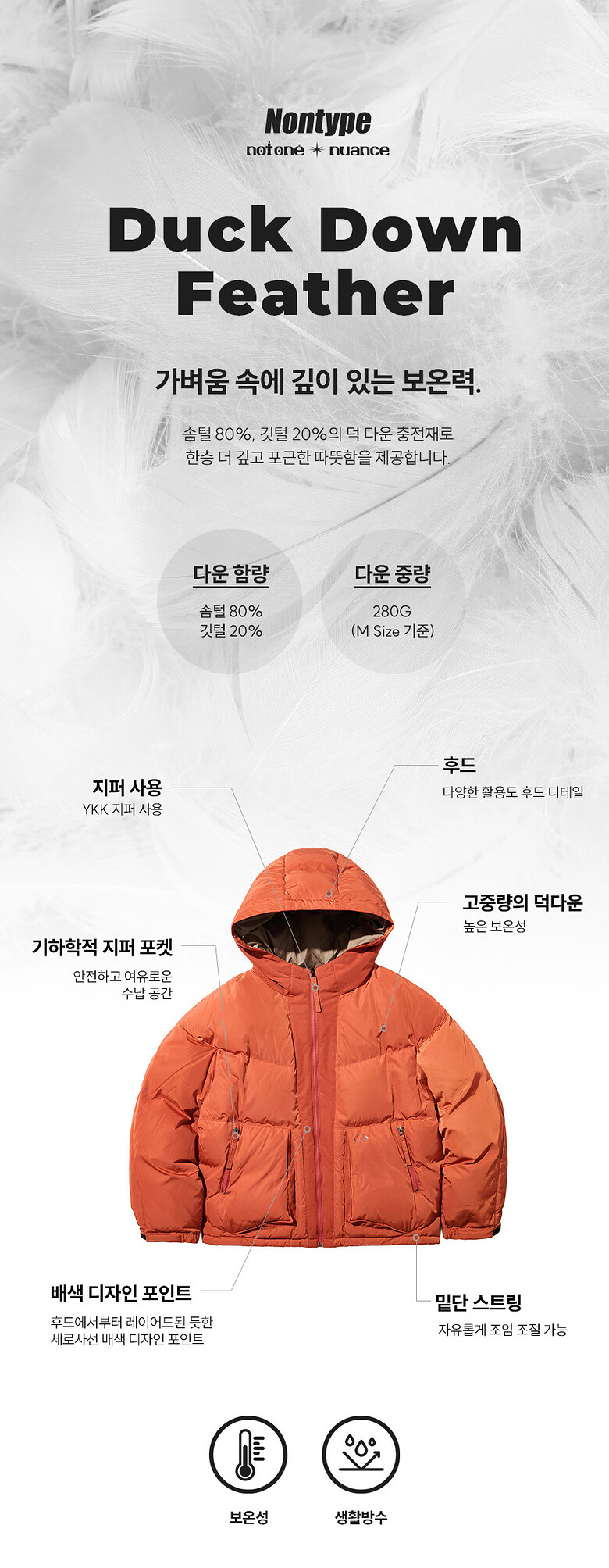 오렌지 : 겉감 폴리에스터100%, 배색 폴리에스터100%, 안감 폴리에스터100%, 충전재 오리털(솜털)80%, 오리털(깃털)20%