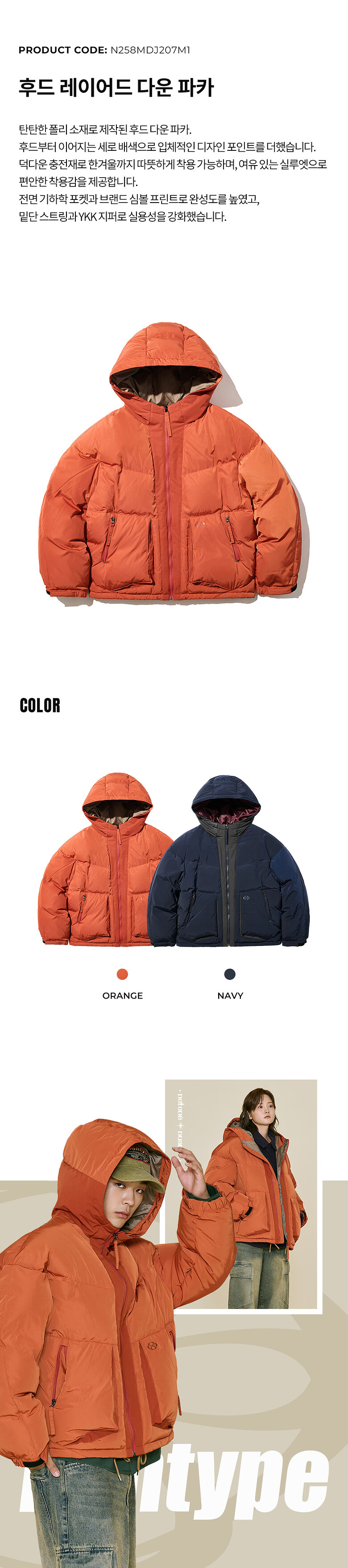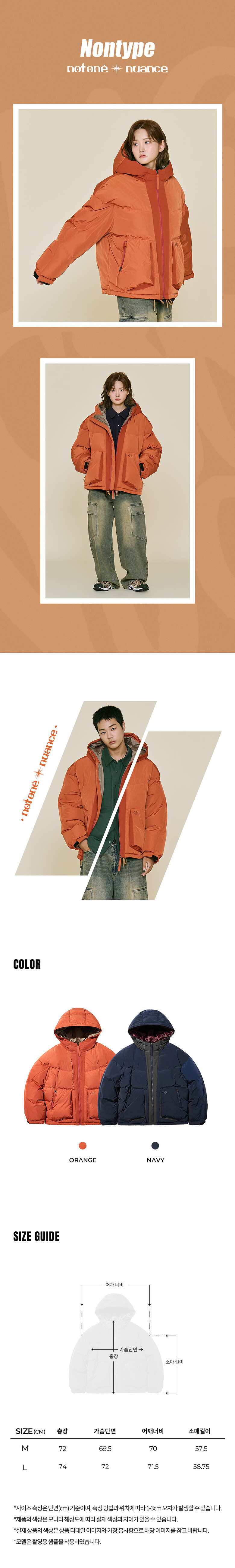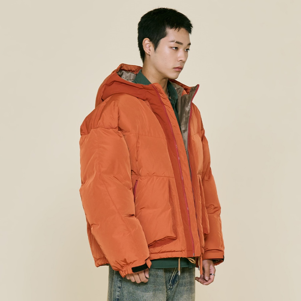 오렌지 : 겉감 폴리에스터100%, 배색 폴리에스터100%, 안감 폴리에스터100%, 충전재 오리털(솜털)80%, 오리털(깃털)20%