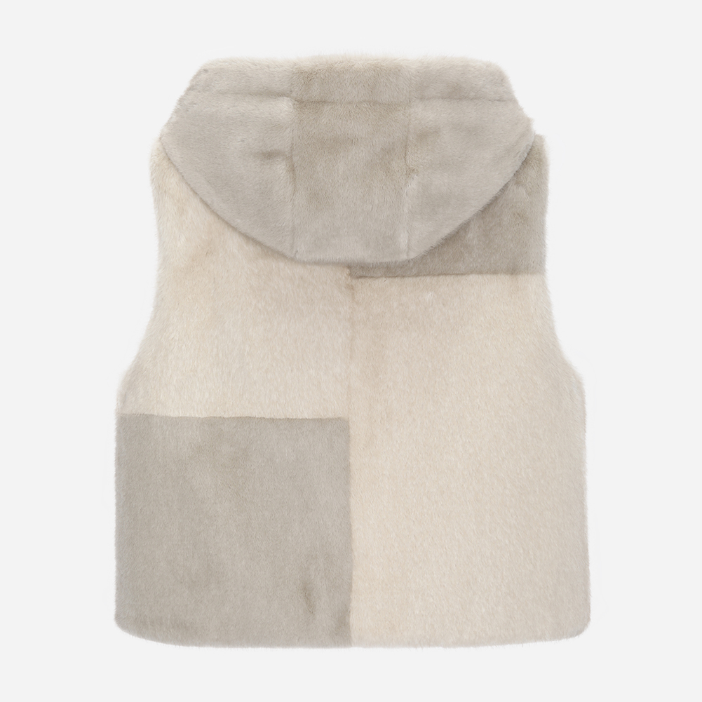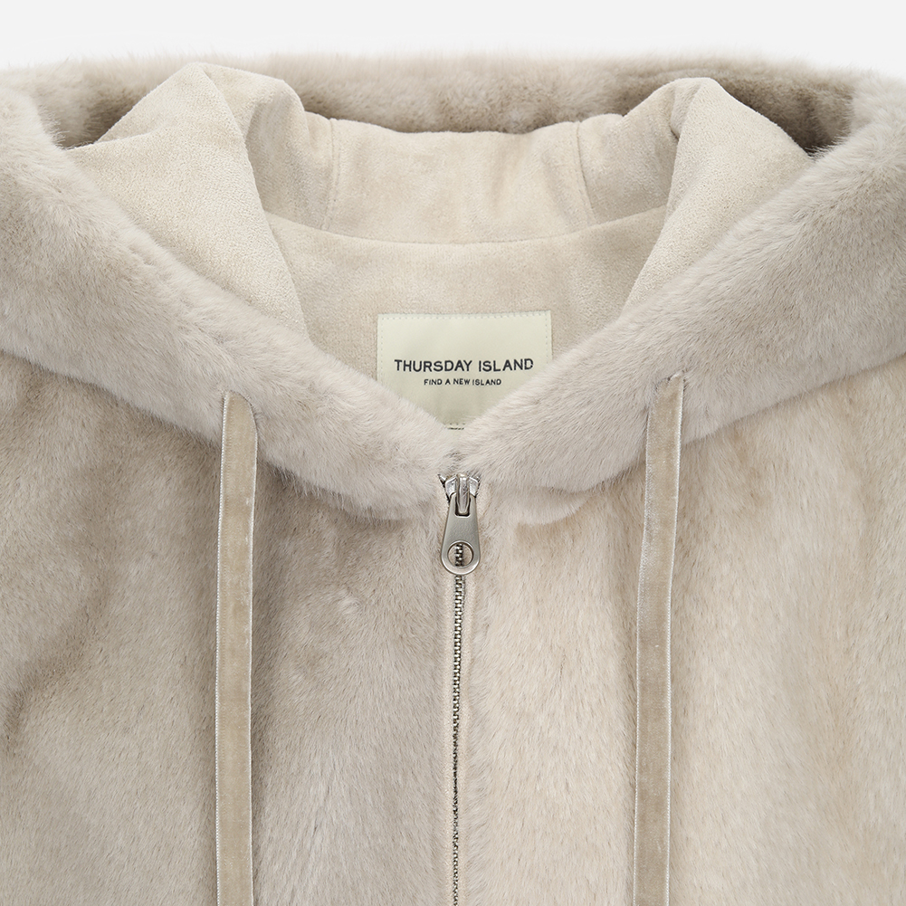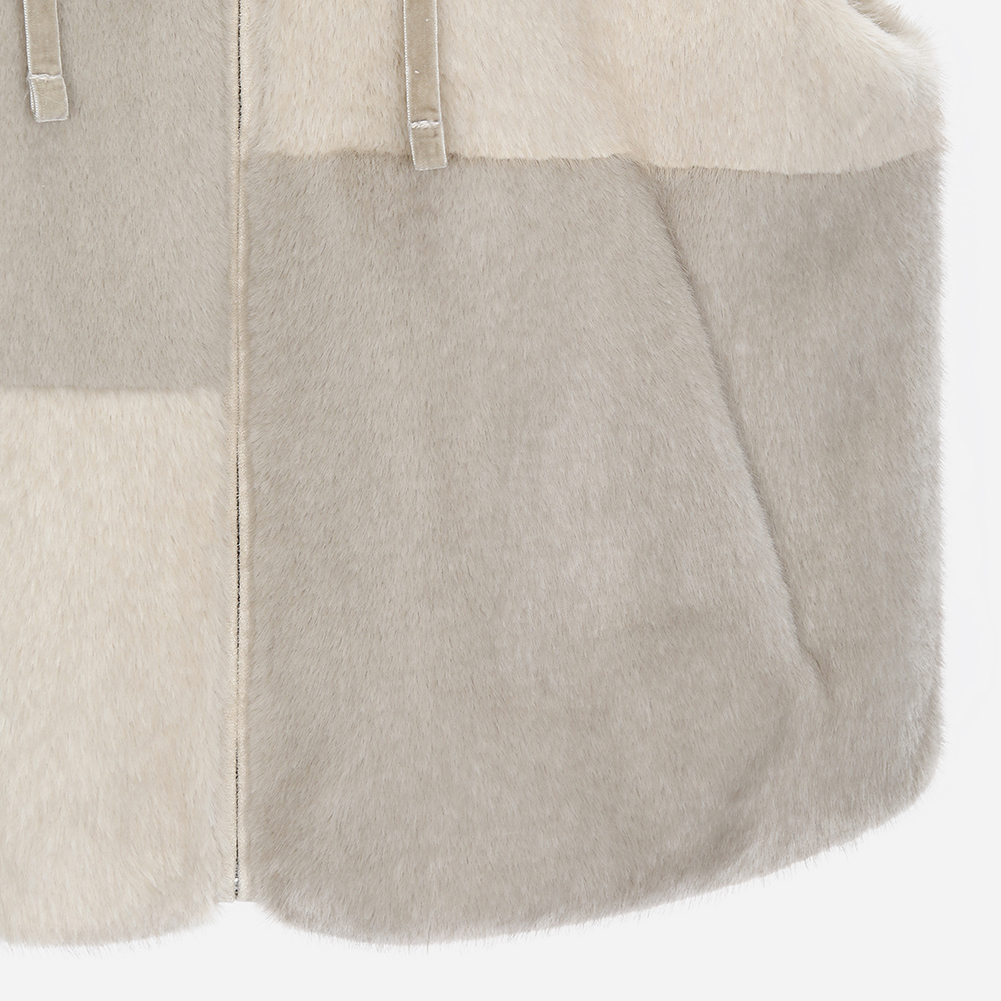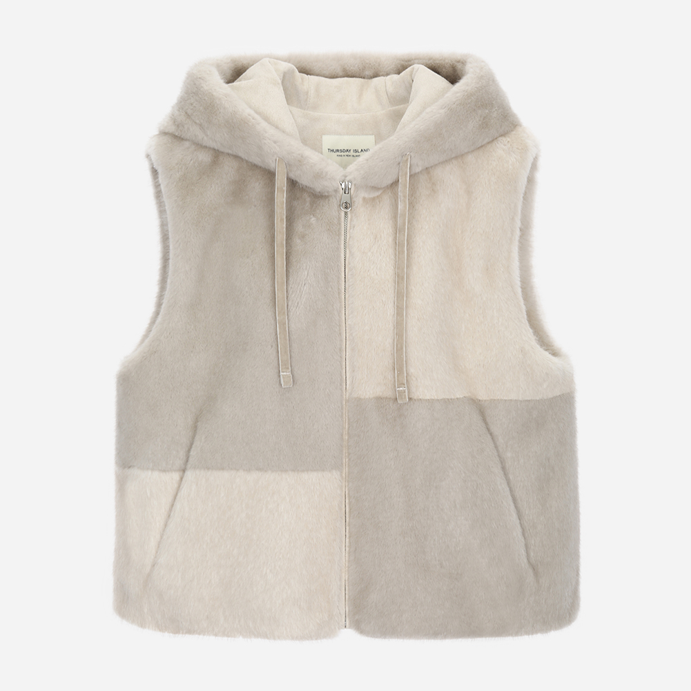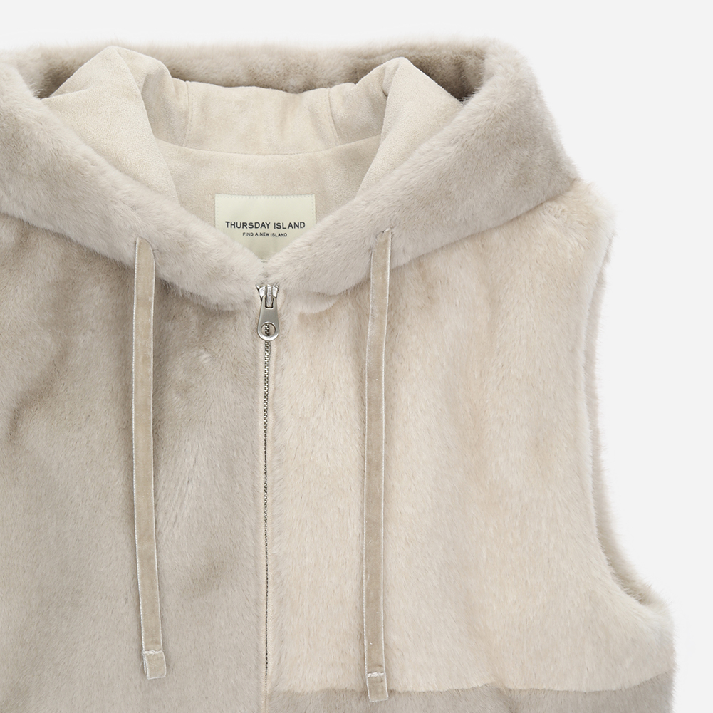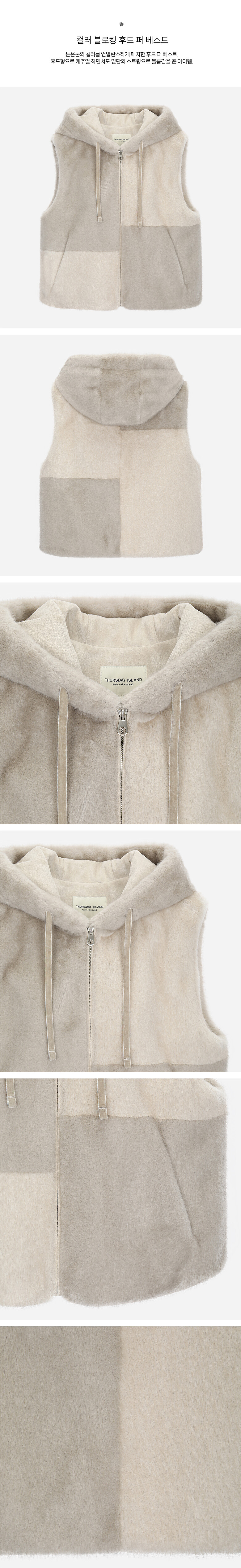 톤온톤의 컬러를 언발란스하게 매치한 후드 퍼 베스트.후드형으로 캐주얼 하면서도 밑단의 스트링으로 볼륨감을 준 아이템.