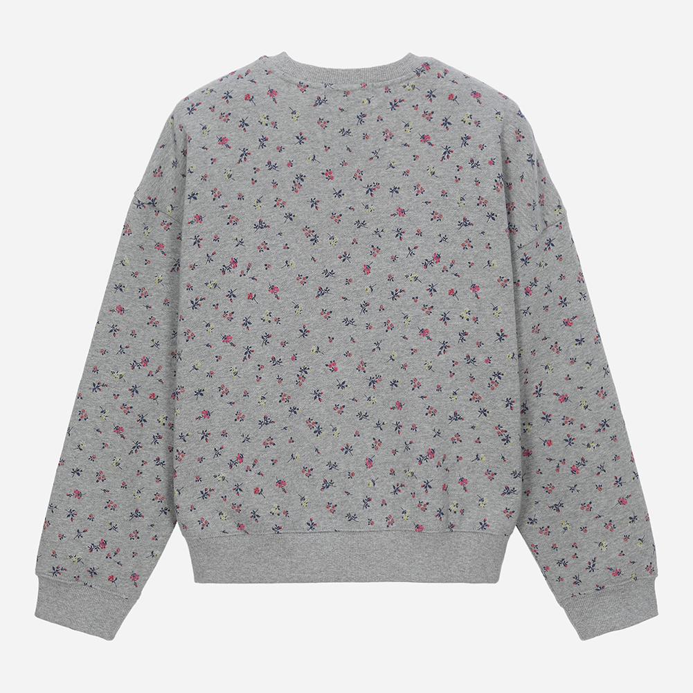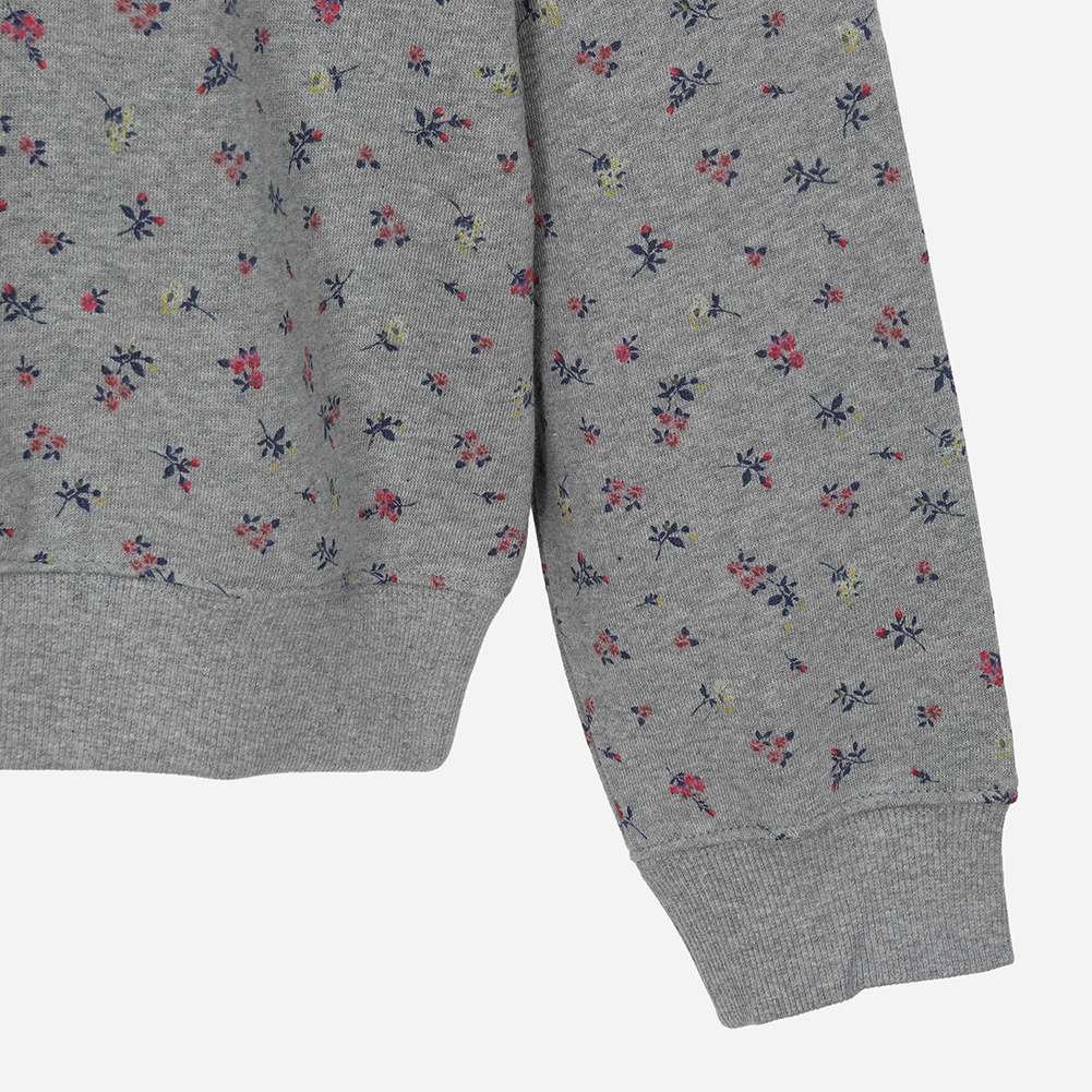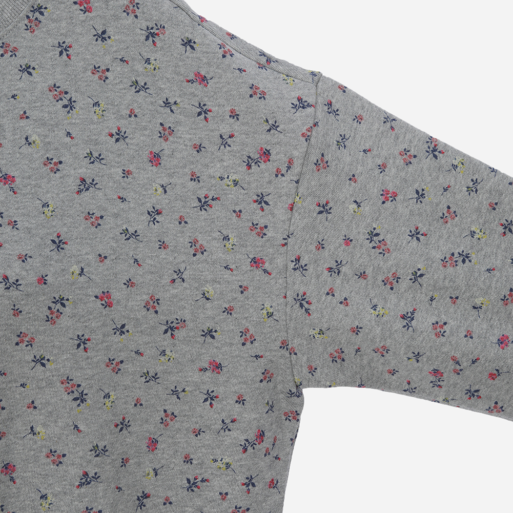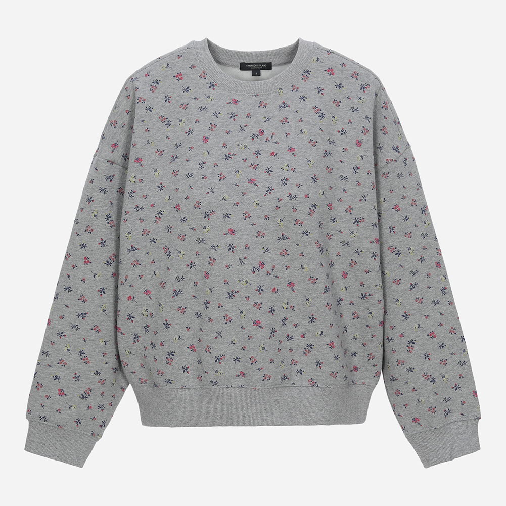 은은한 컬러감과 잔잔한 플라워 패턴이 조화로운 스웻셔츠.기모 가공으로 착용감이 포근하며 코디에 용이한 미디 기장으로 다양한 상하의에 매칭 가능한 스타일.