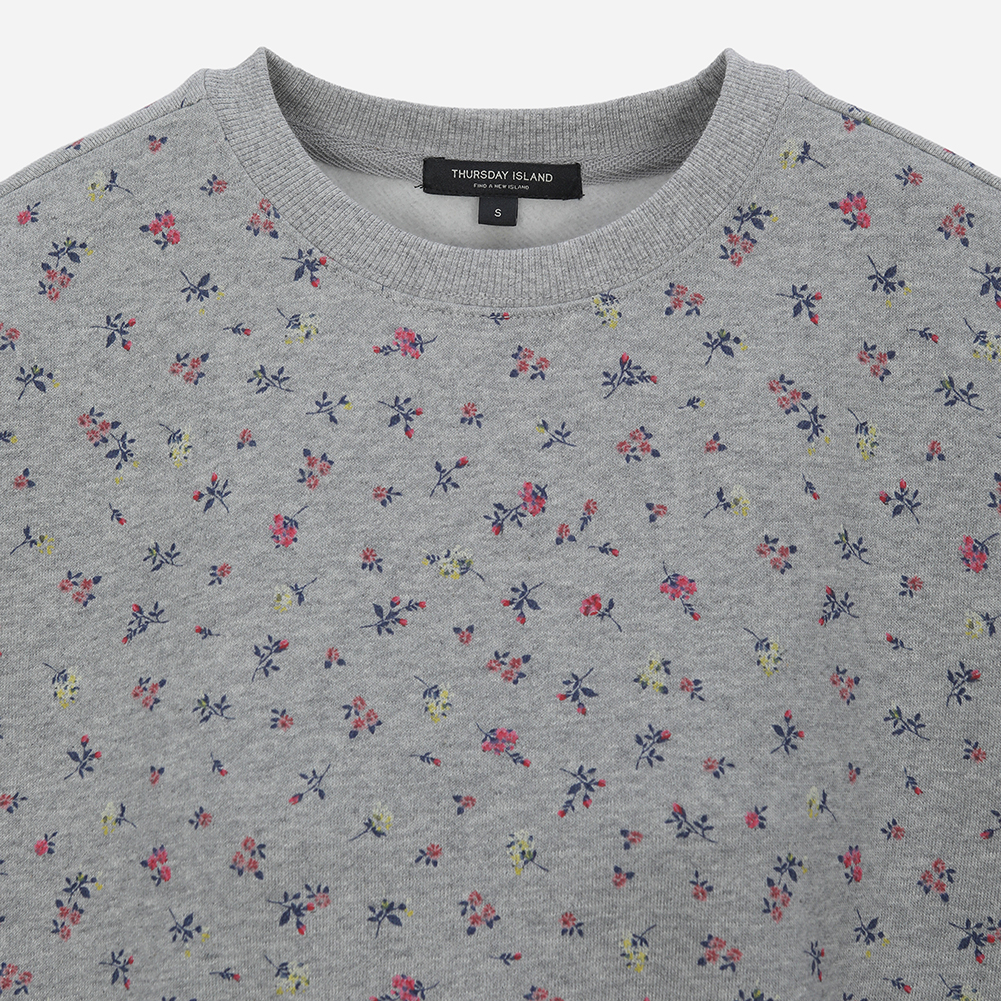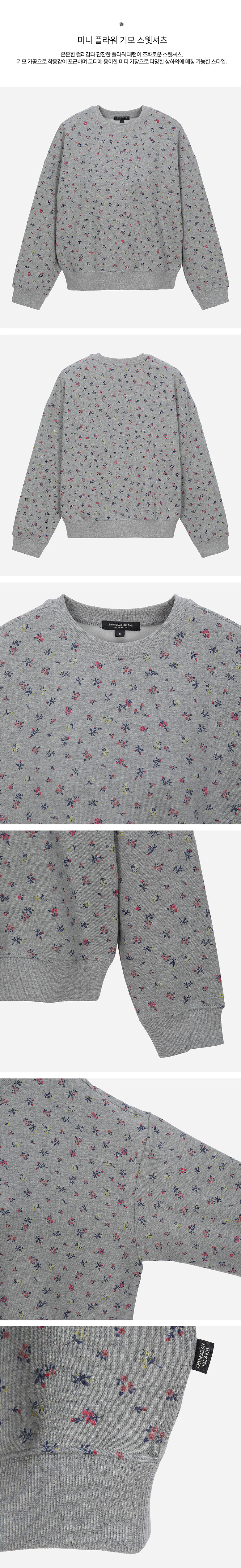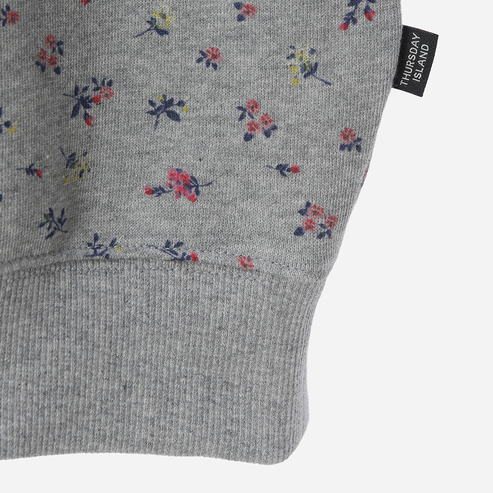 은은한 컬러감과 잔잔한 플라워 패턴이 조화로운 스웻셔츠.기모 가공으로 착용감이 포근하며 코디에 용이한 미디 기장으로 다양한 상하의에 매칭 가능한 스타일.