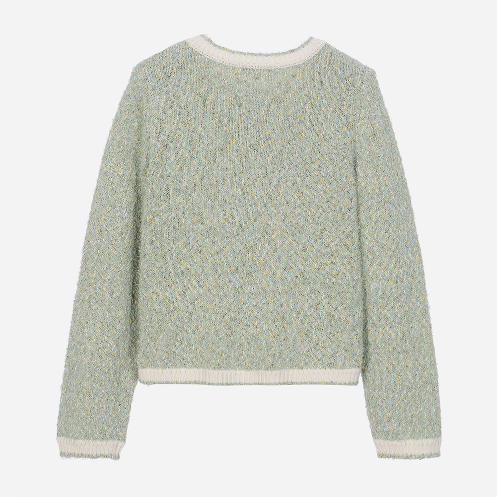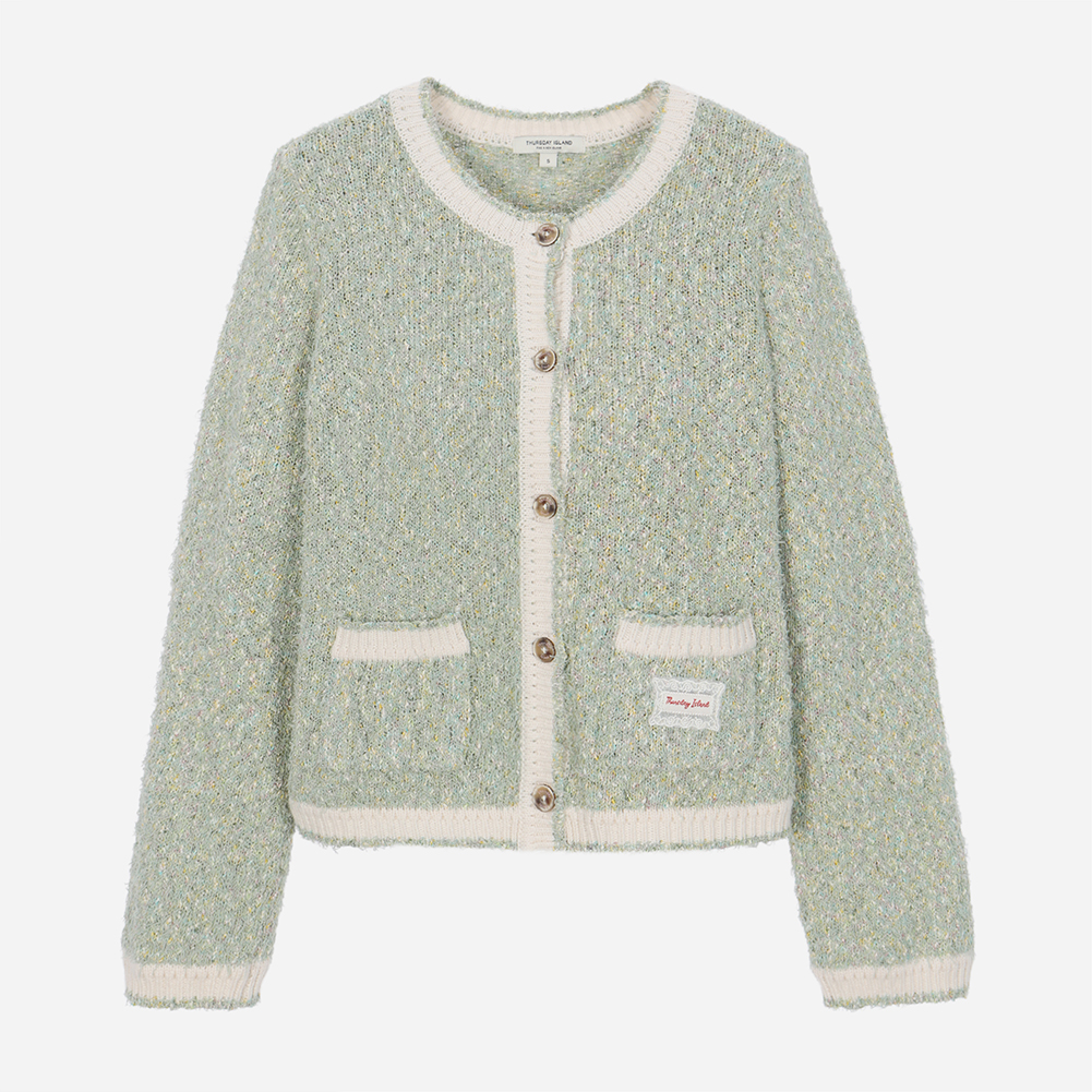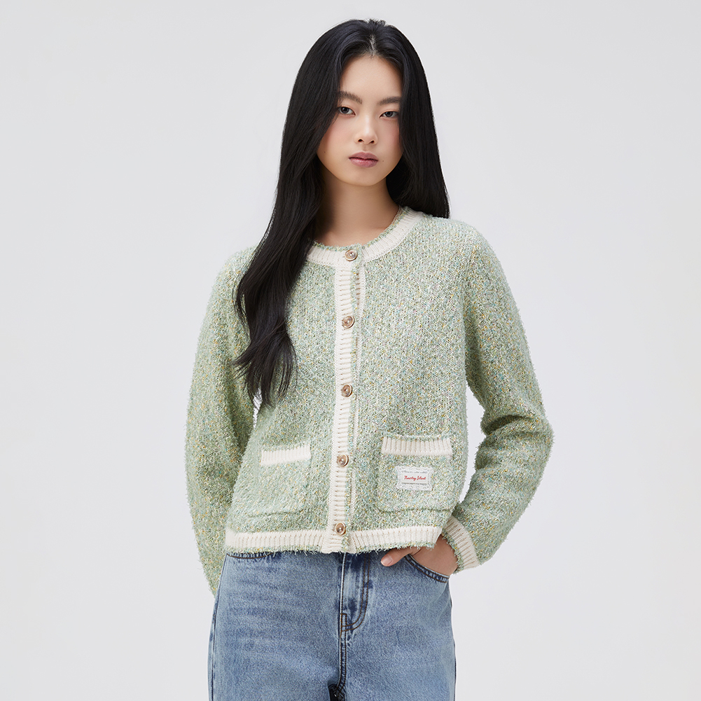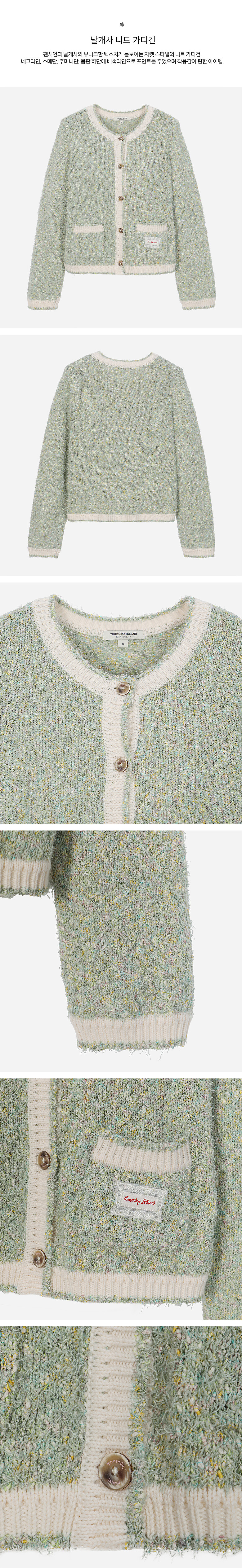 펜시얀과 날개사의 유니크한 텍스처가 돋보이는 자켓 스타일의 니트 가디건.네크라인,소매단,주머니단,몸판 하단에 배색라인으로 포인트를 주었으며 착용감이 편한 아이템.